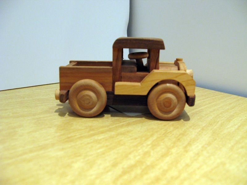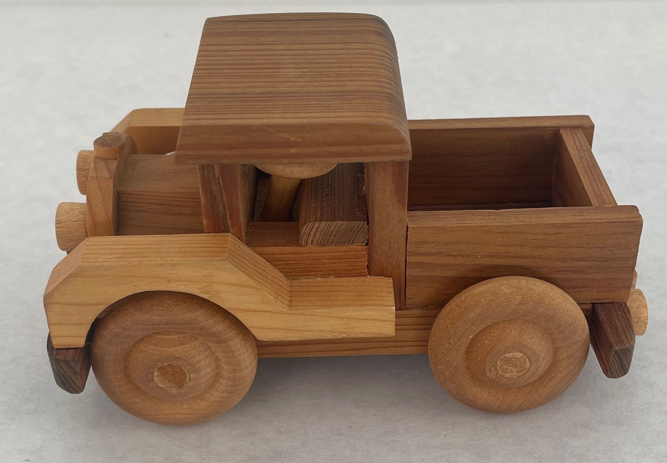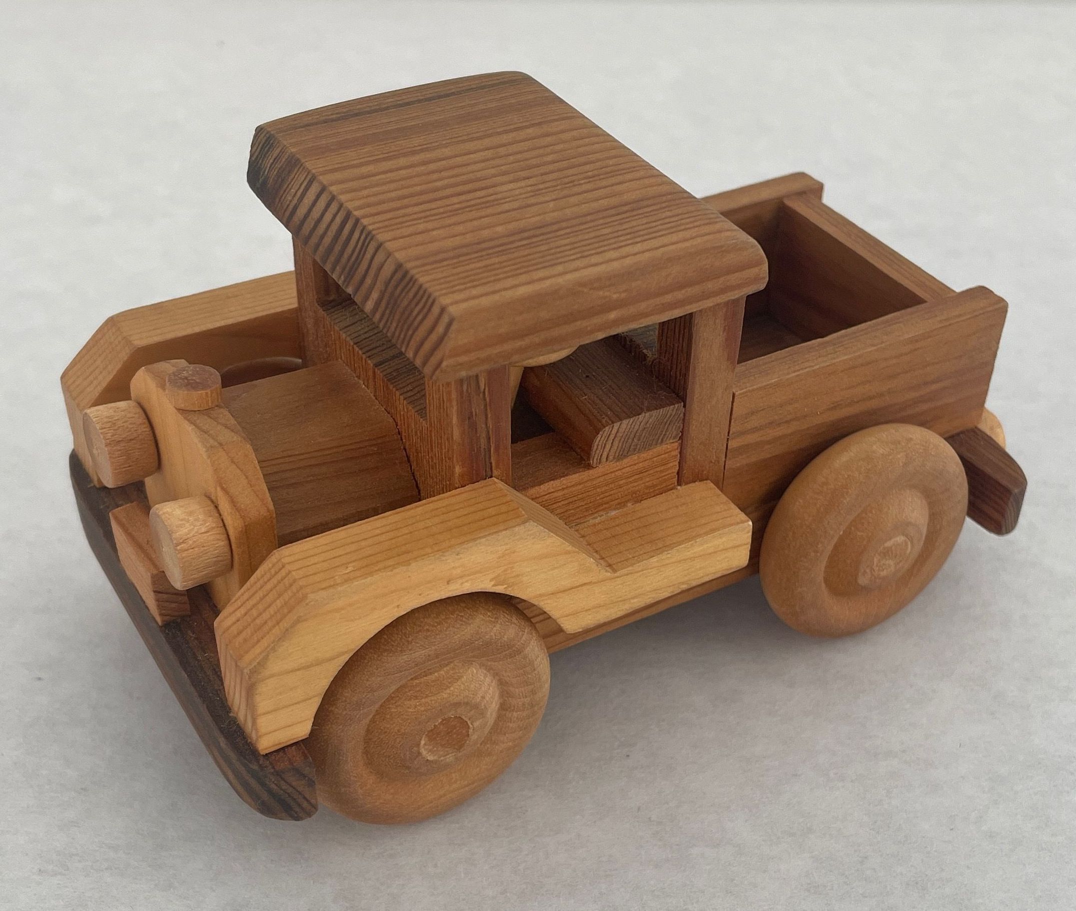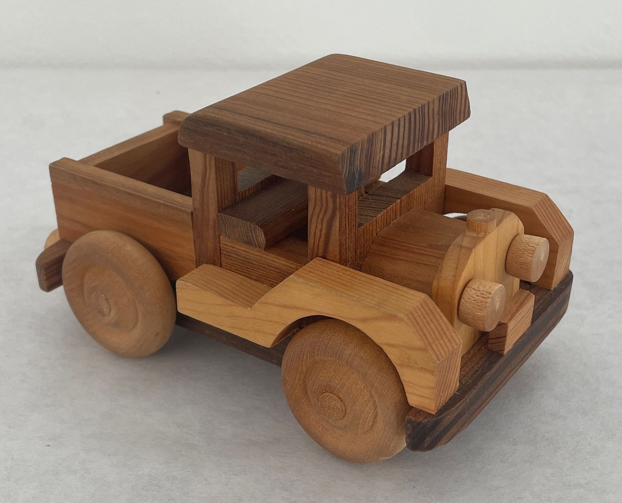 Small toy truck made from wood in various shades of brown flatbed in rear wheels roll headlights and small steering wheel inside.Collection