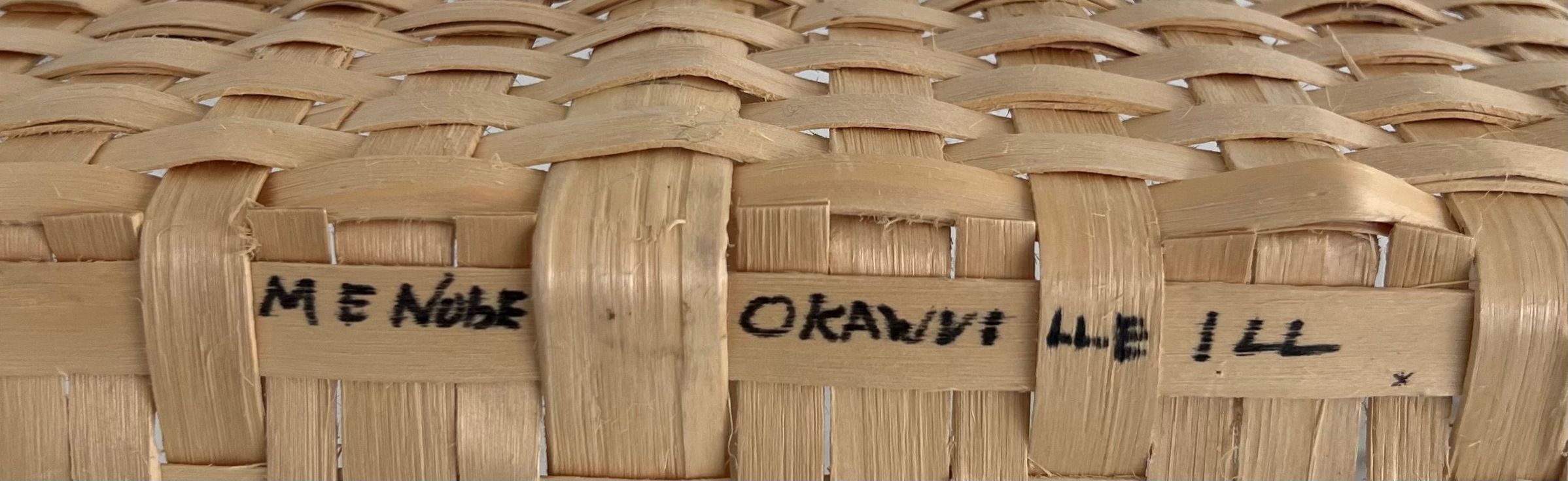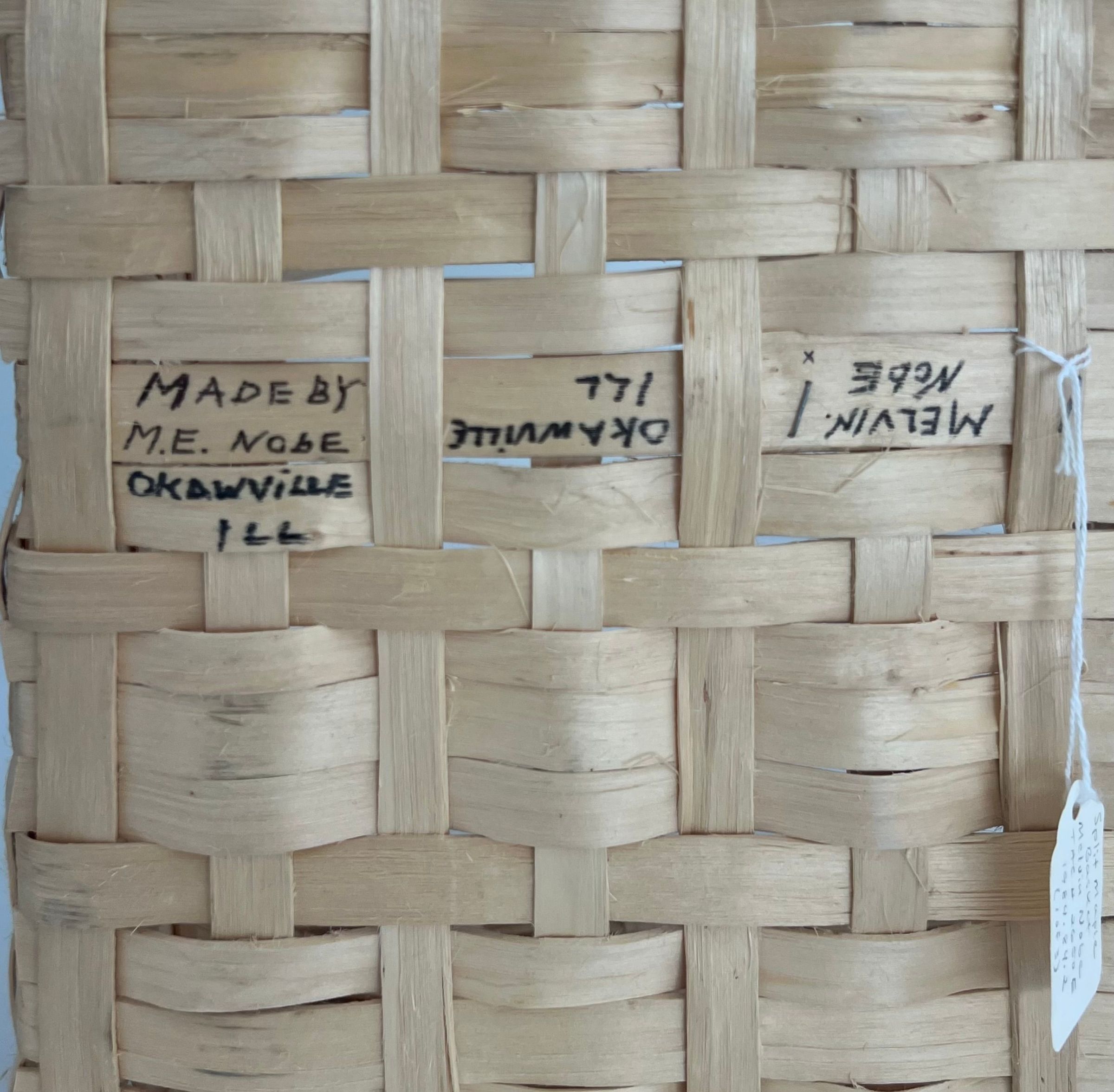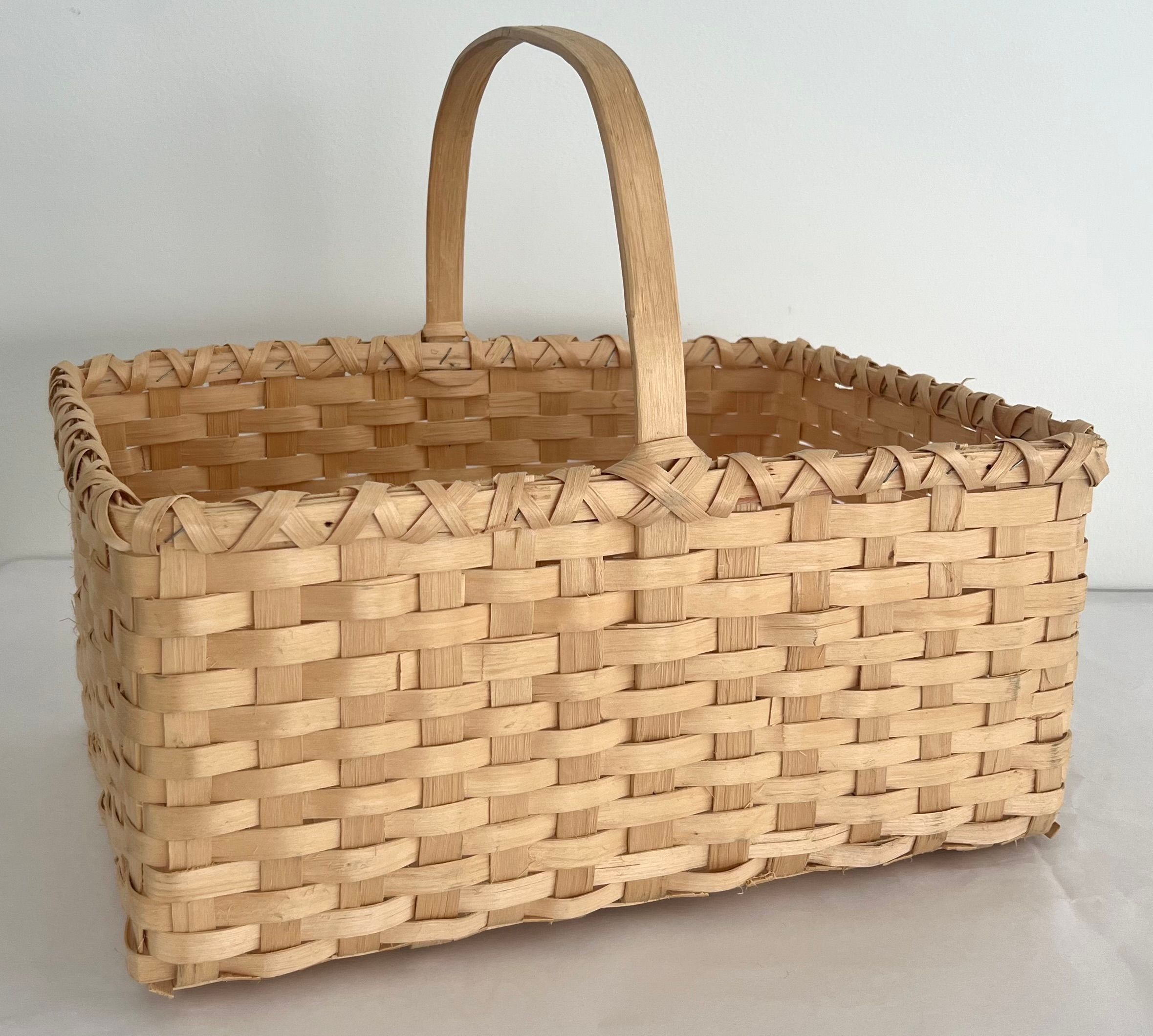 Three woven baskets of split maple, light tan in color. One is small and rectangular with handle, one is large rectangular shape with handle. One is round, large and has handle attached.Collection