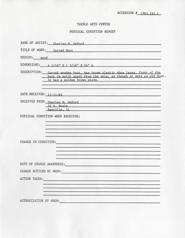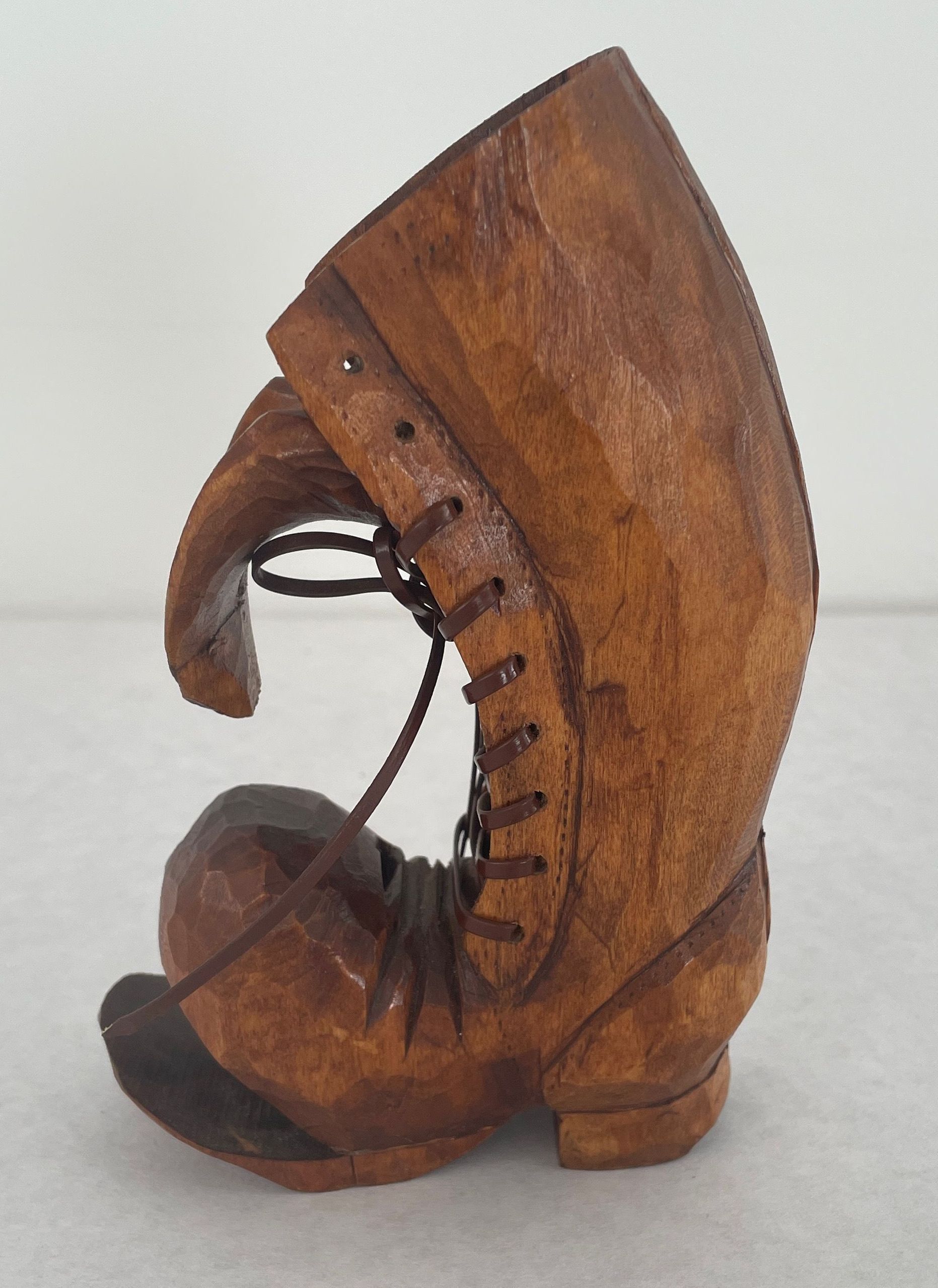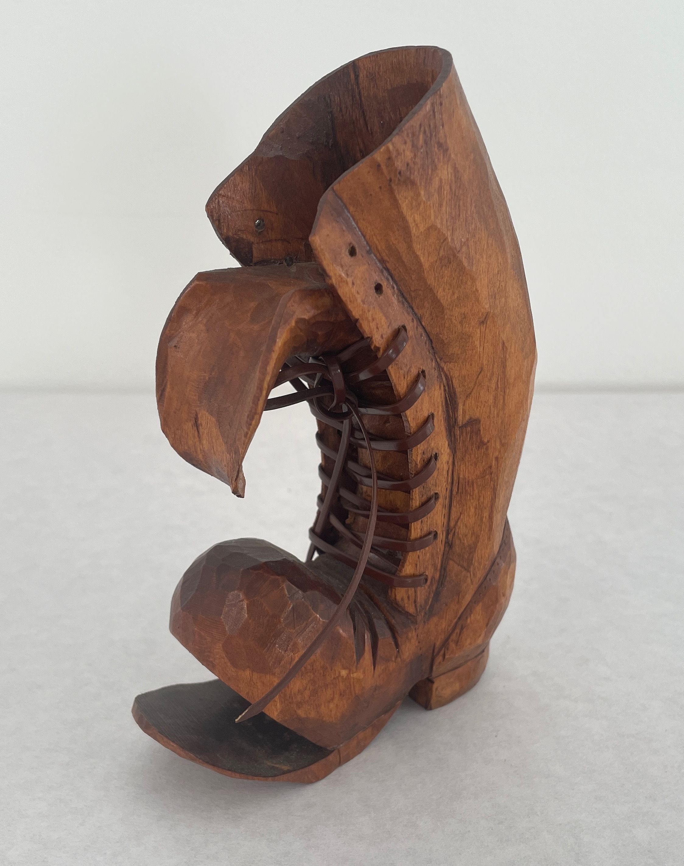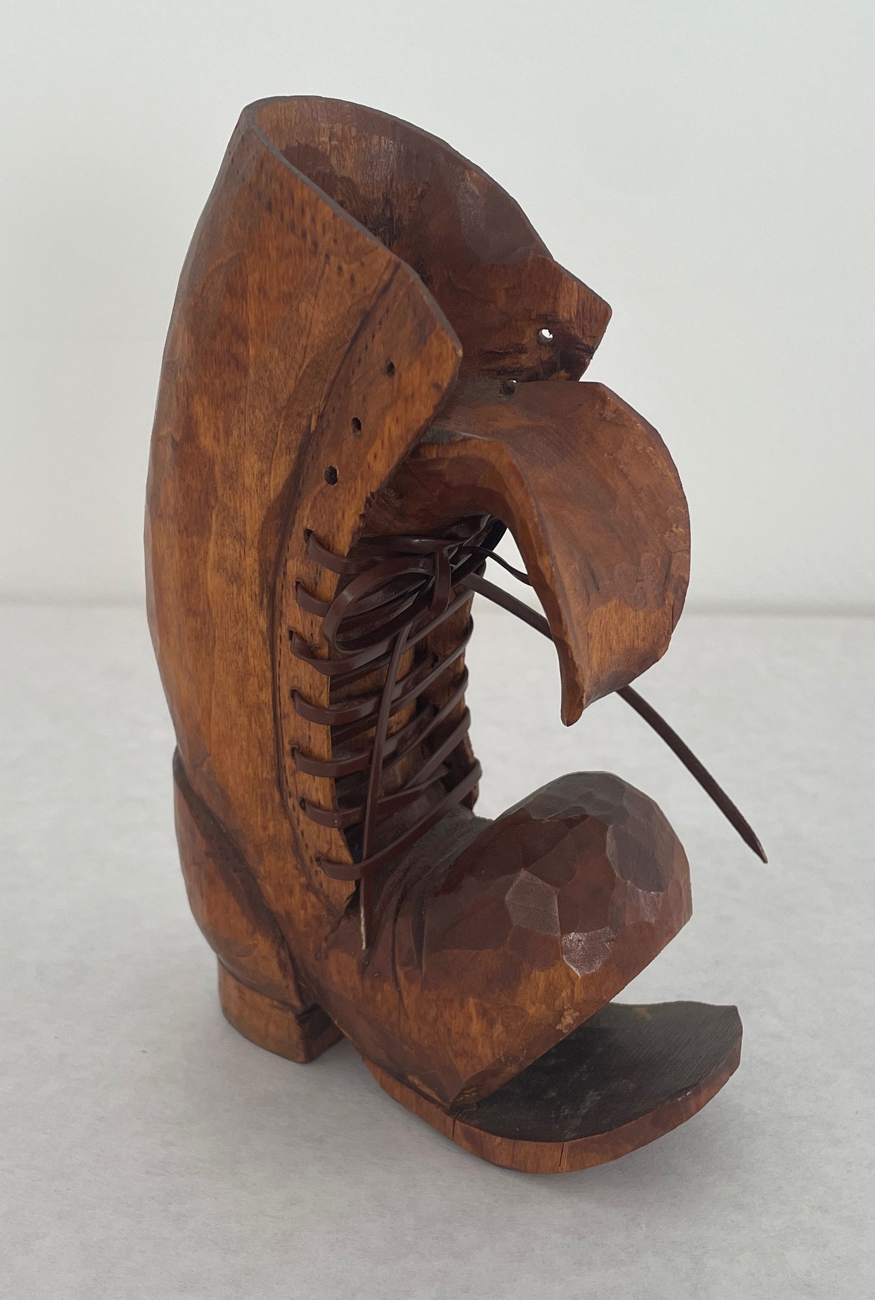 Original shoe carving was stolen while on exhibit at Triton College in May of 1985 this is a replacement received in Oct. 85. Carved wooden boot, has brown plastic shoe laces, front of the boot s split apart from the sole, as though it were an old boot. It has a golden brown stain.Collection