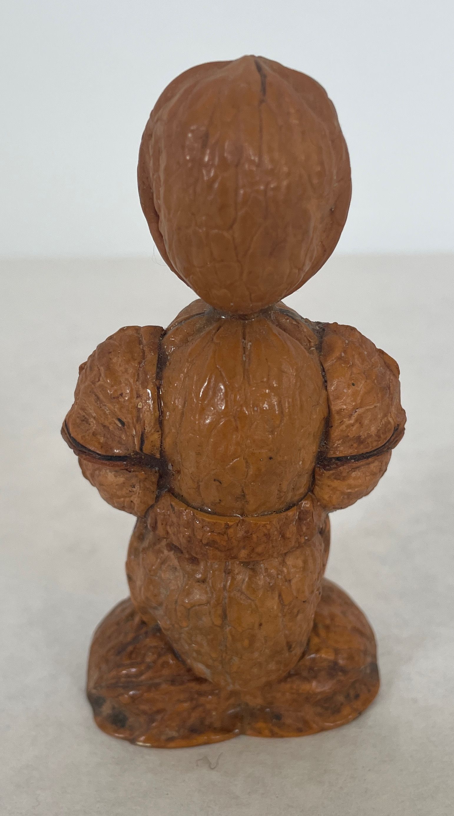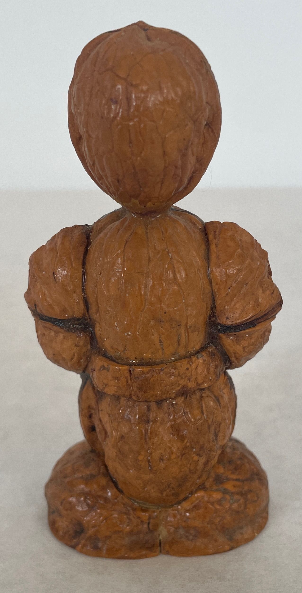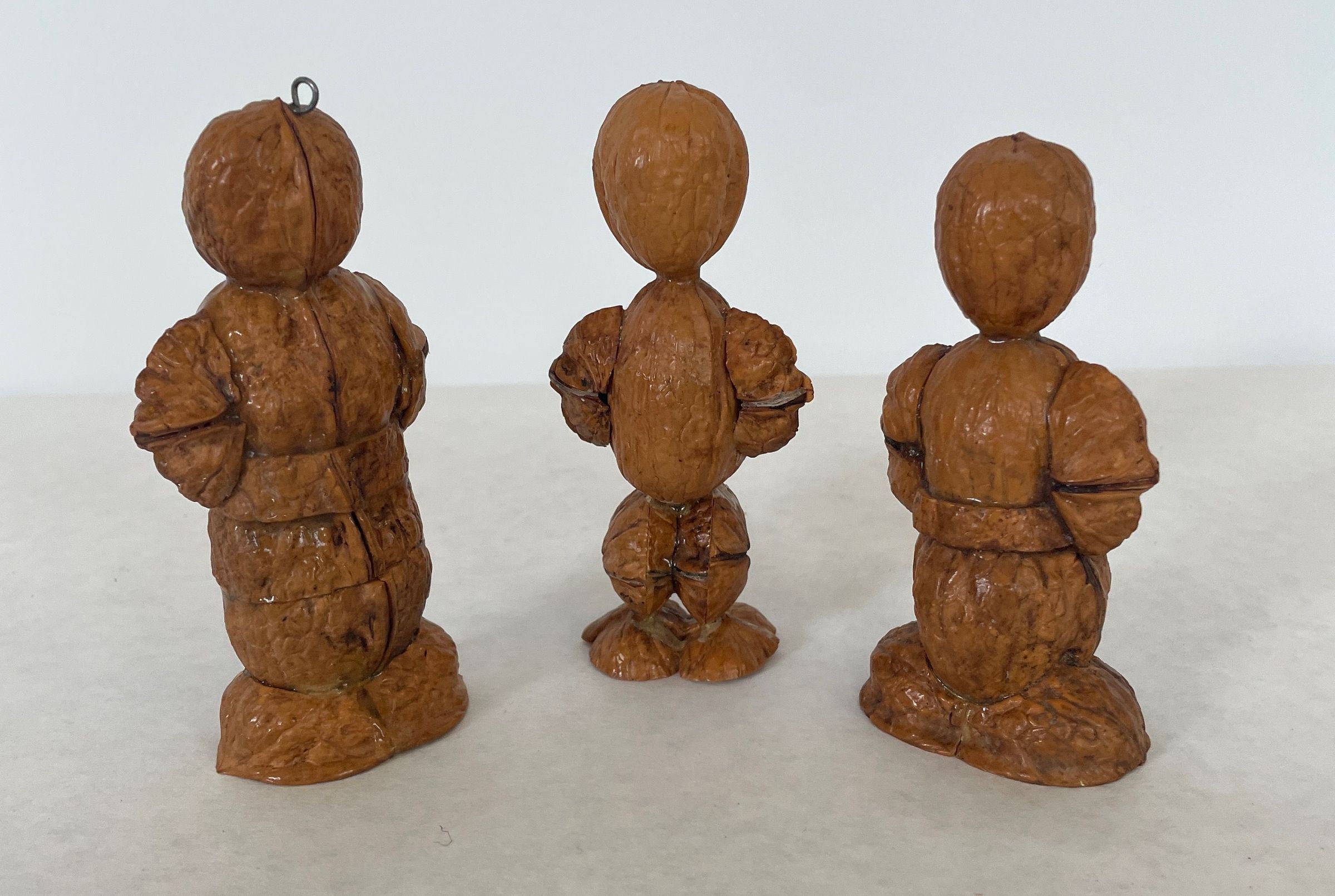Three figures (human) made from walnut shells, glued and varnished. One figure has a small metal hook in its head.Collection