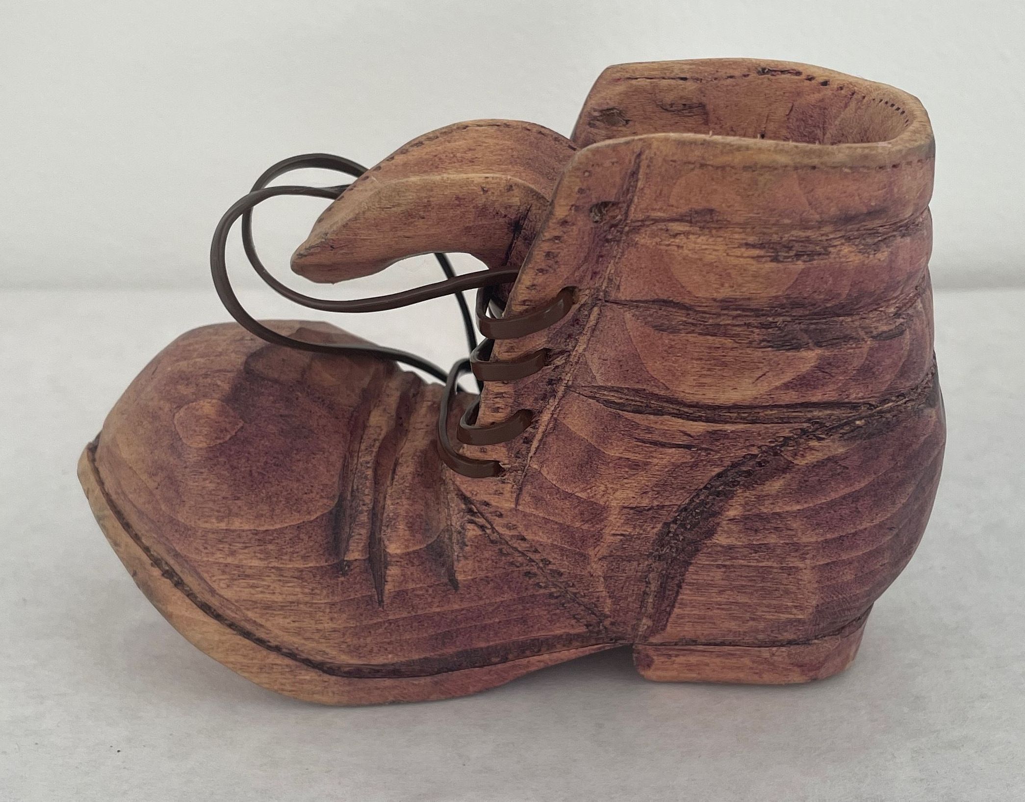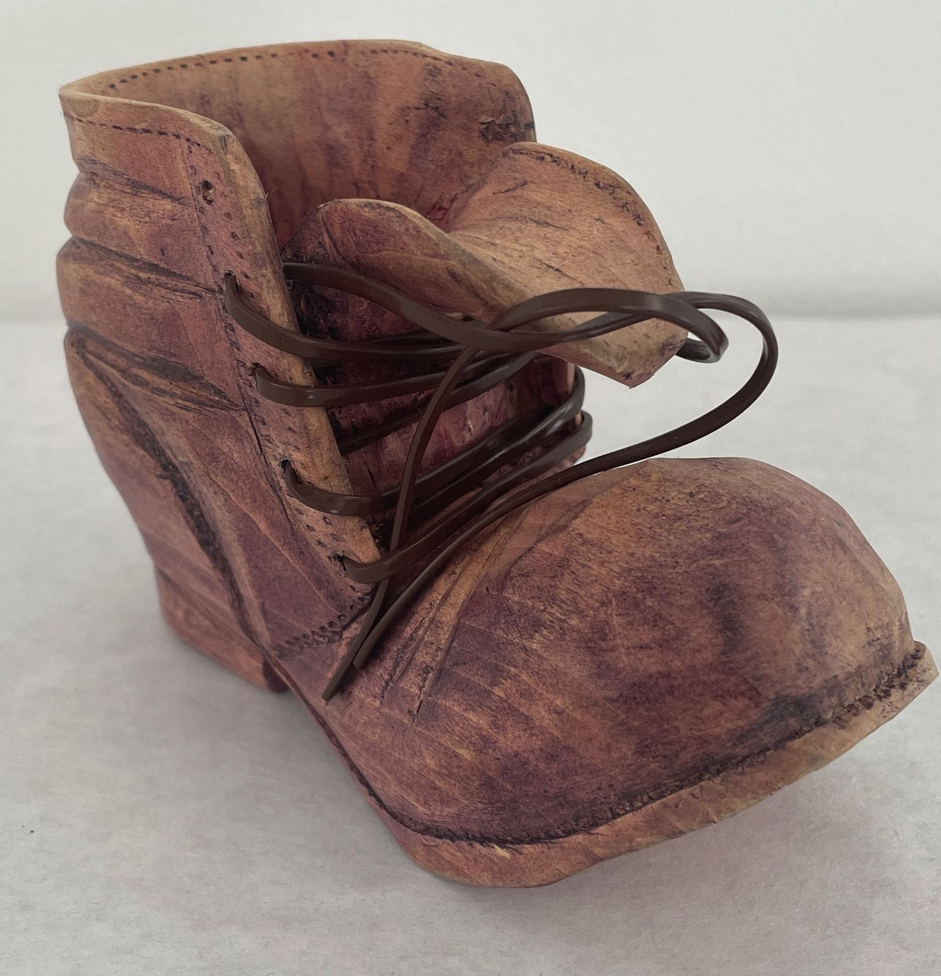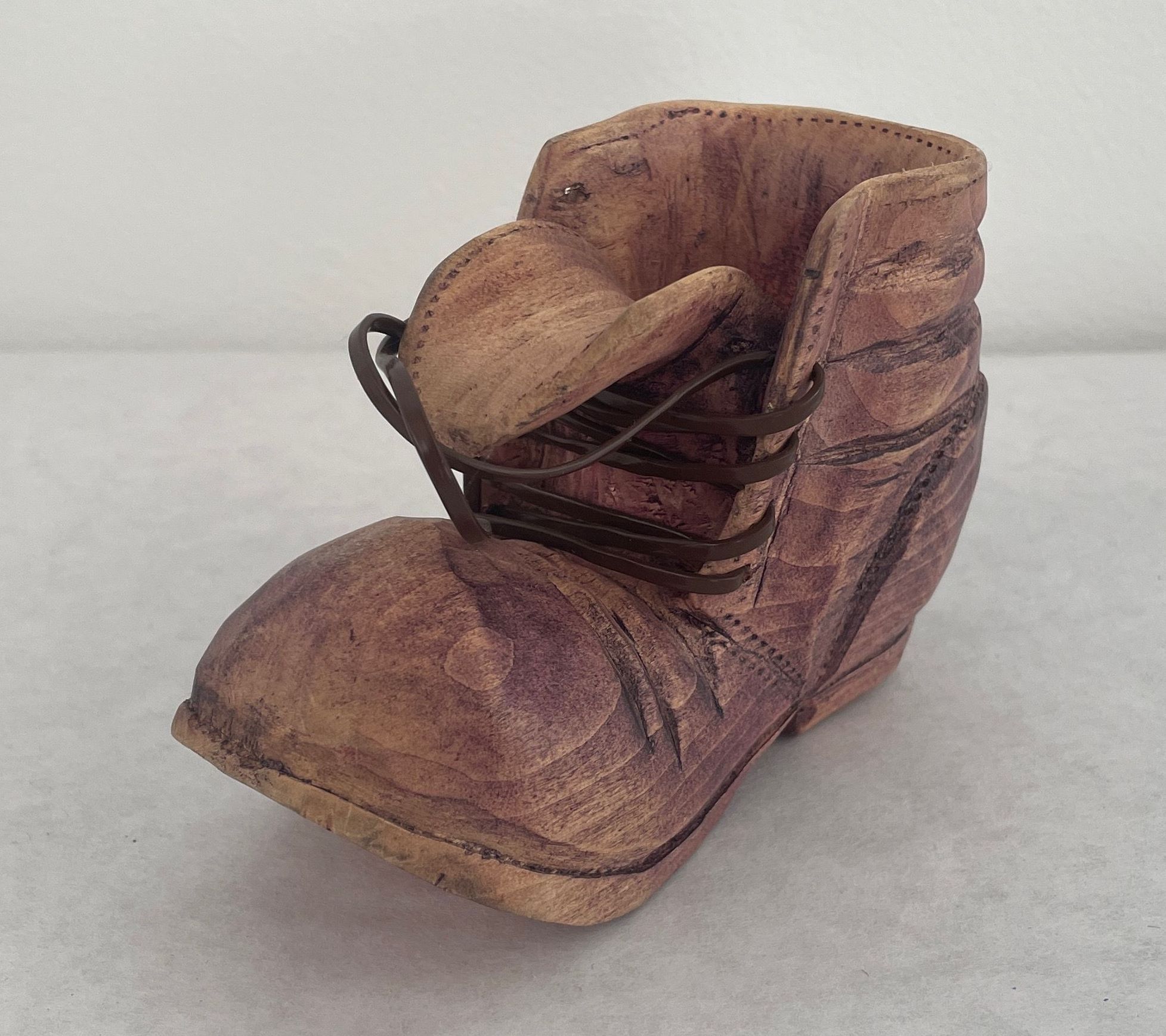 Carved wooden shoe (man's work shoe), has brown plastic shoelaces, light purple stain over shoe.Collection