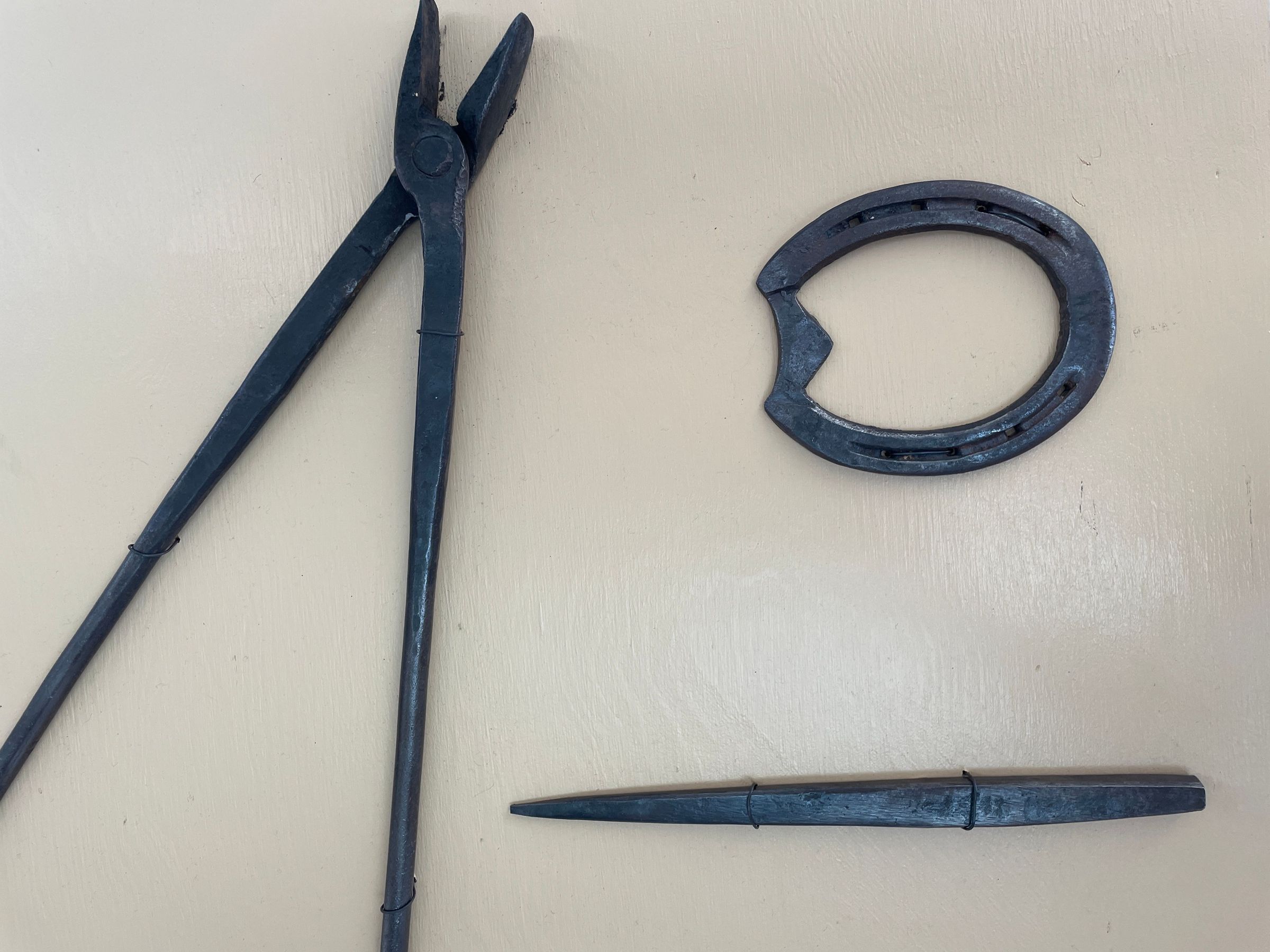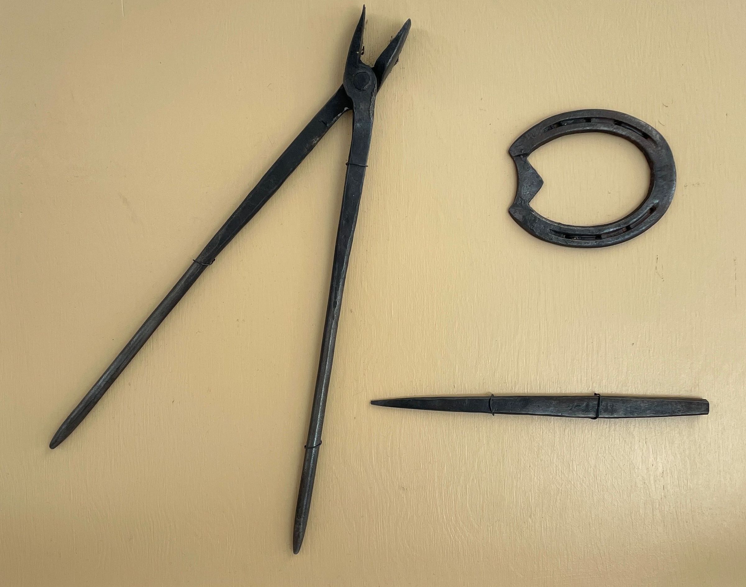 Black- forged metal horseshoe with closed end. Black- forged metal pritchel looks like a metal stake. Black forged metal tongs have a short gripping section with long thin handles.Collection