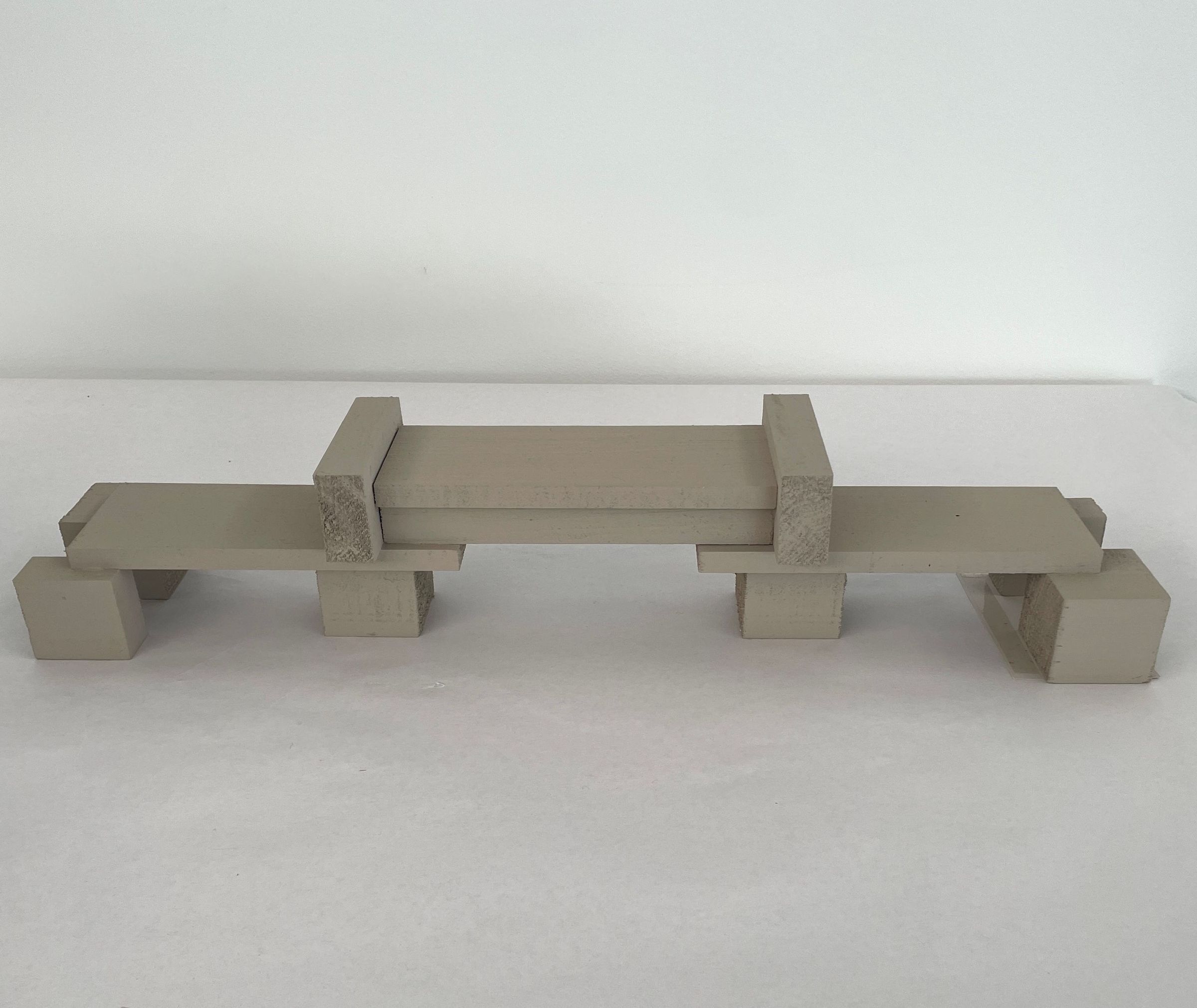 Maquette of architectural limestone Sculpture bench. Painted grey wood. Comprised of vertical and horizontal slabs. Center section elevated.Collection