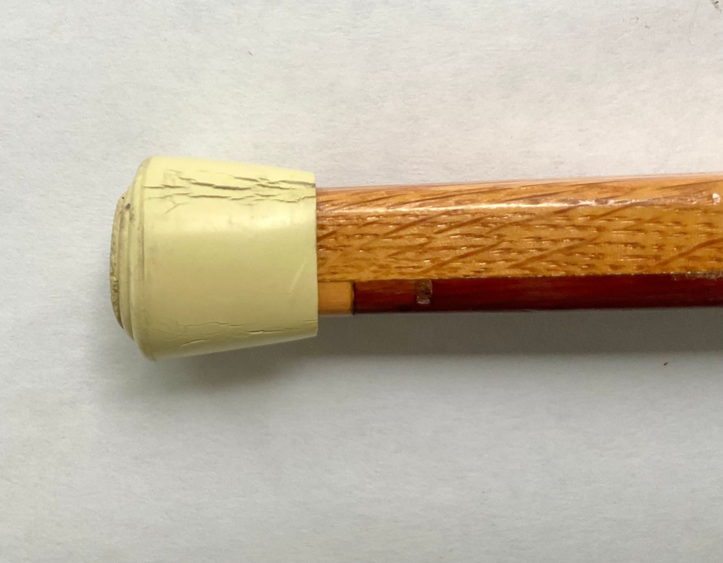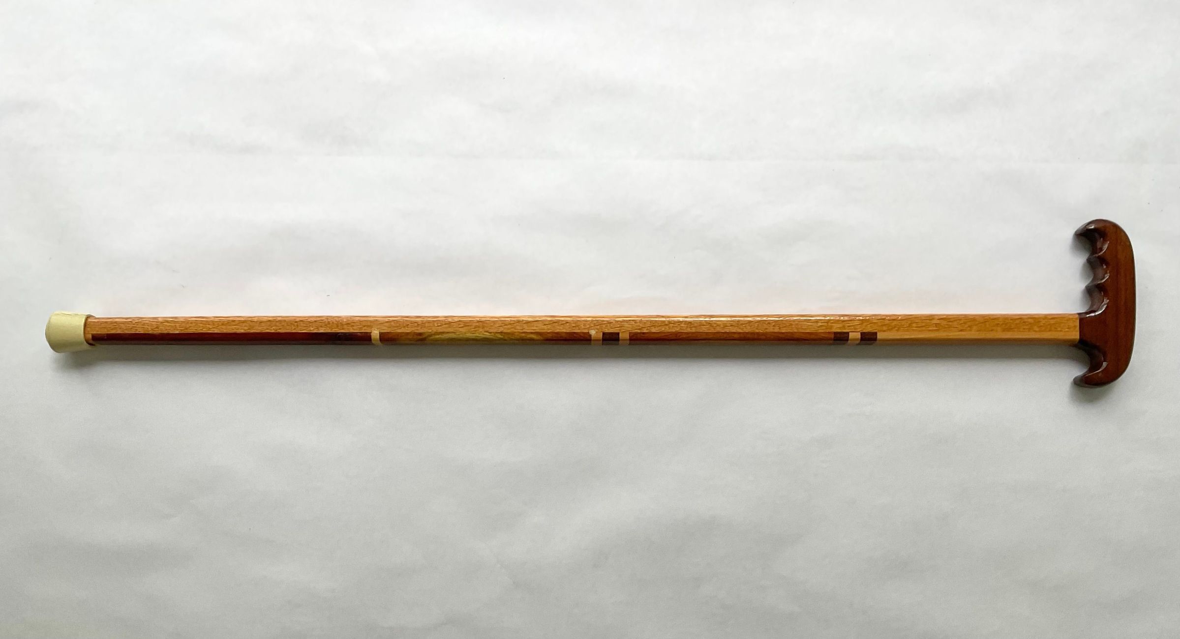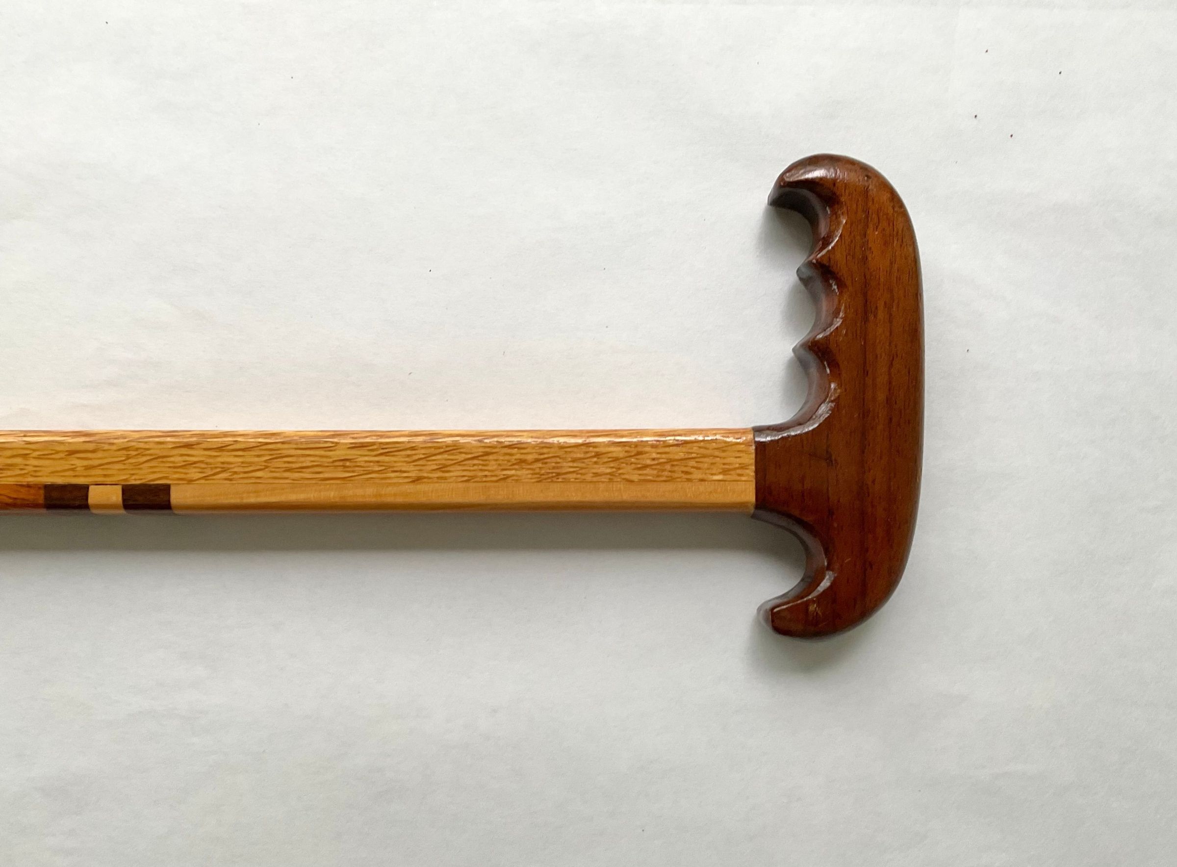 Wooden cane with dark pistol-grip handle and marquetry on front surfaceCollection