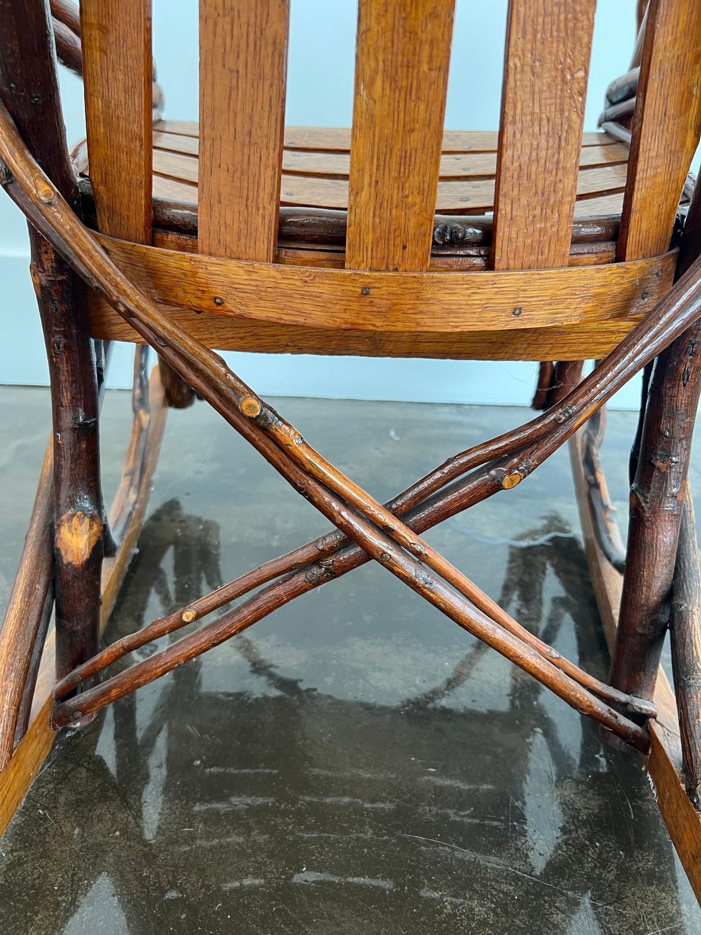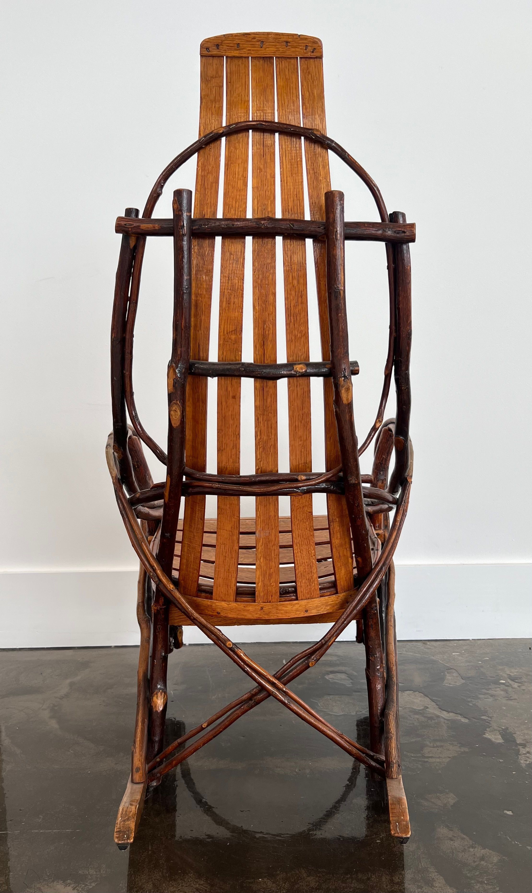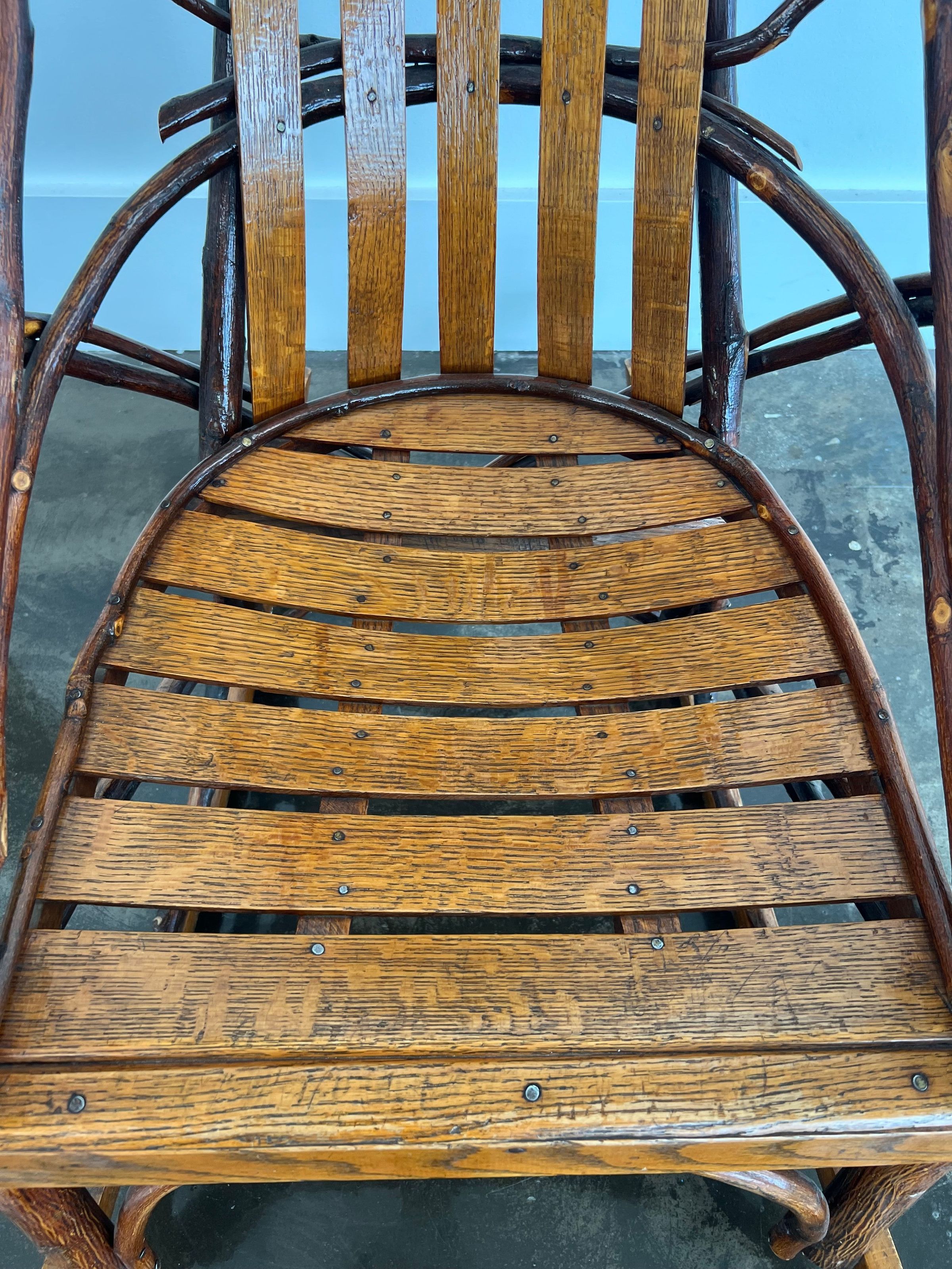 A rocker made from wooden planks and bent twigs. The seat backrest and rockers are made of oak. Bent twigs form the curved arm rests.Collection