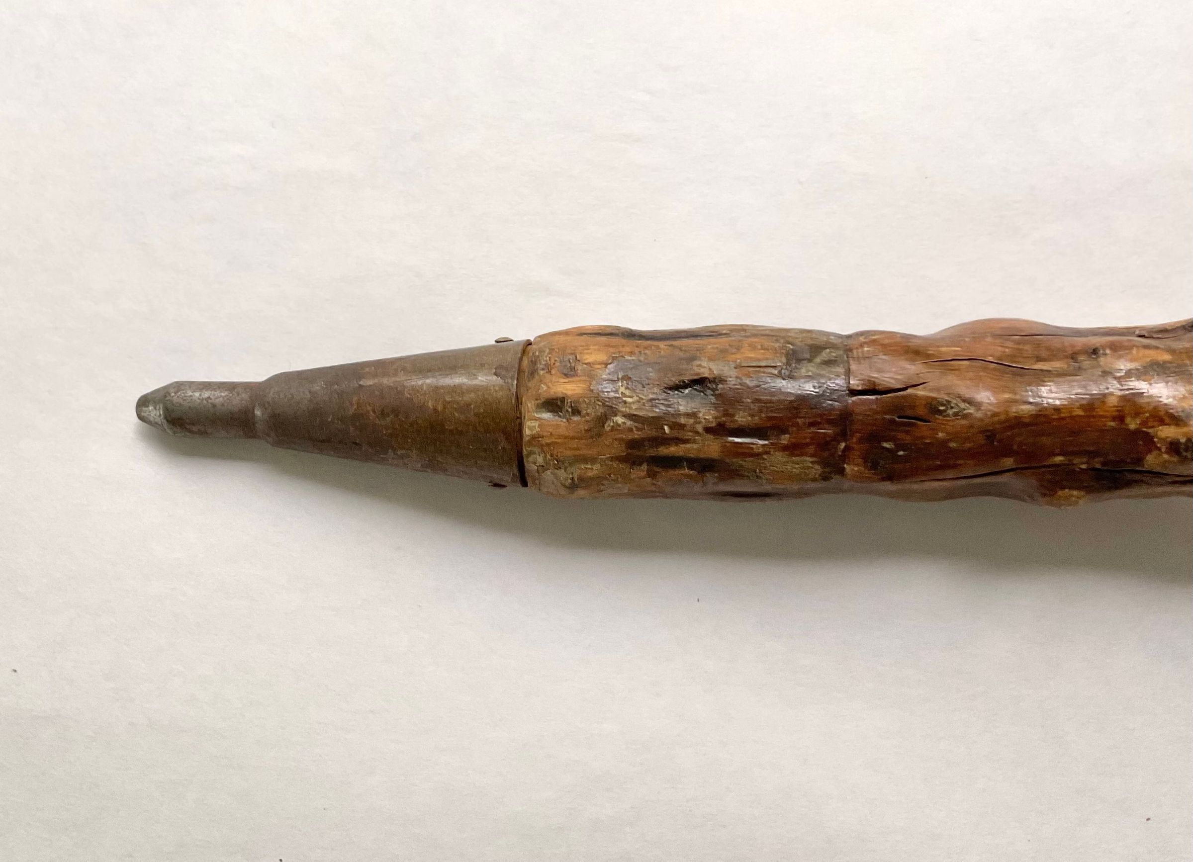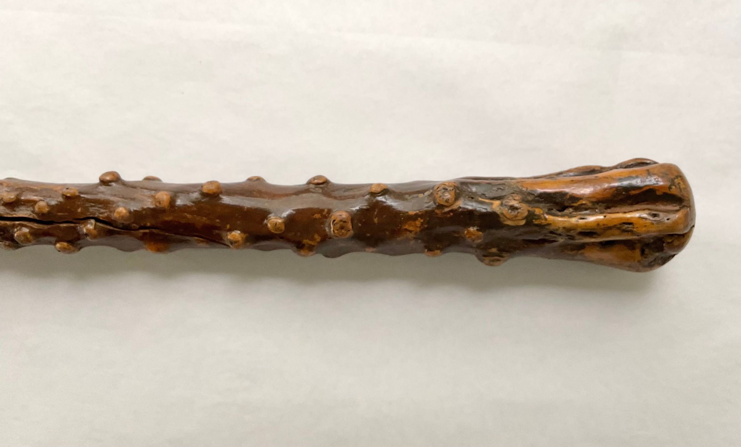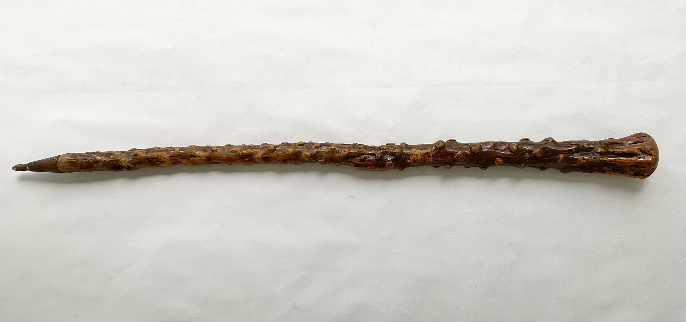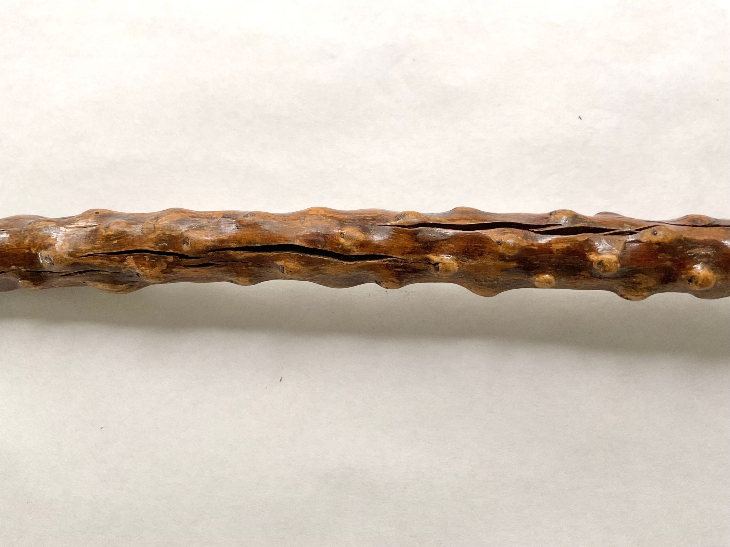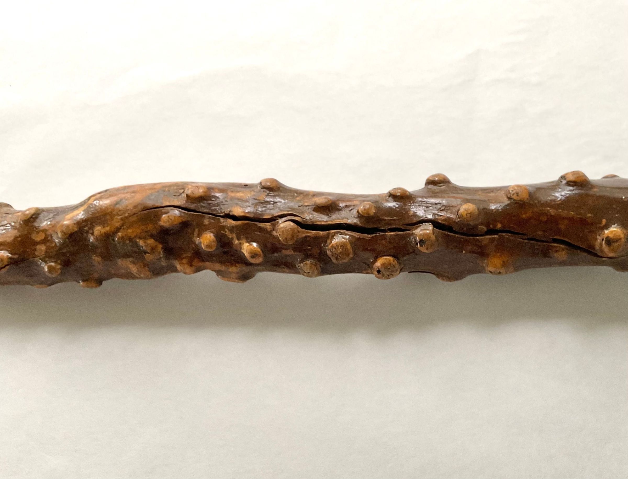 Dark brown carved wood cane with knotty texture of a palm tree. It is badly cracked. A metal cone with a spiked tip at bottom.Collection