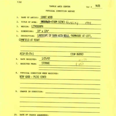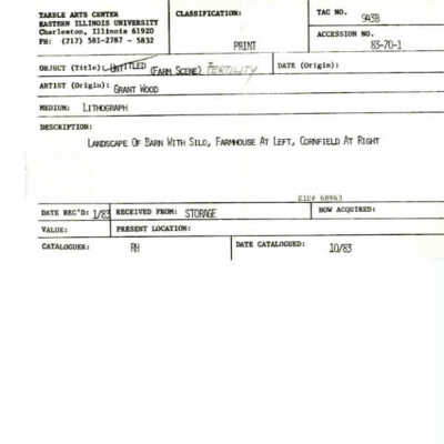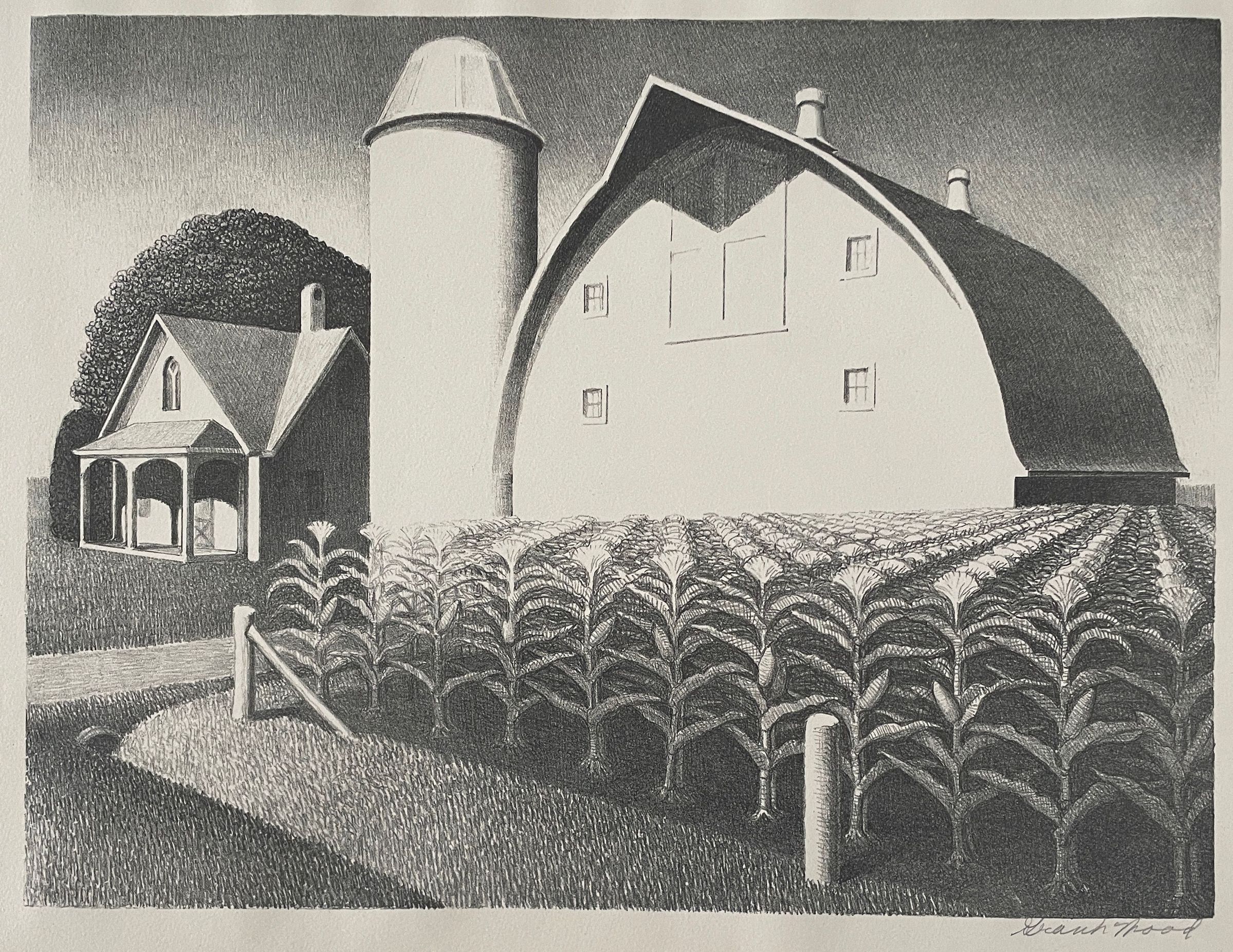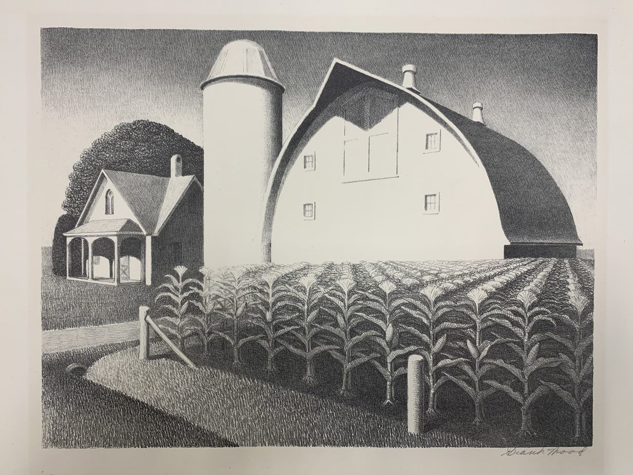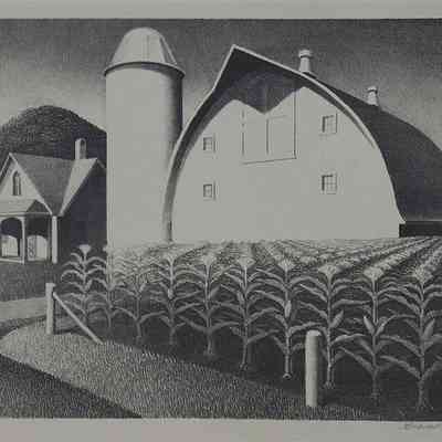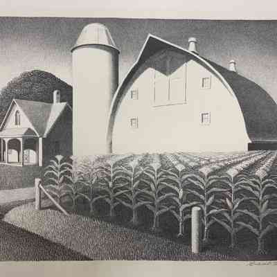 Landscape of barn with silo- farmhouse at left- corn field at right. Circulated by Associated American Artists.Collection