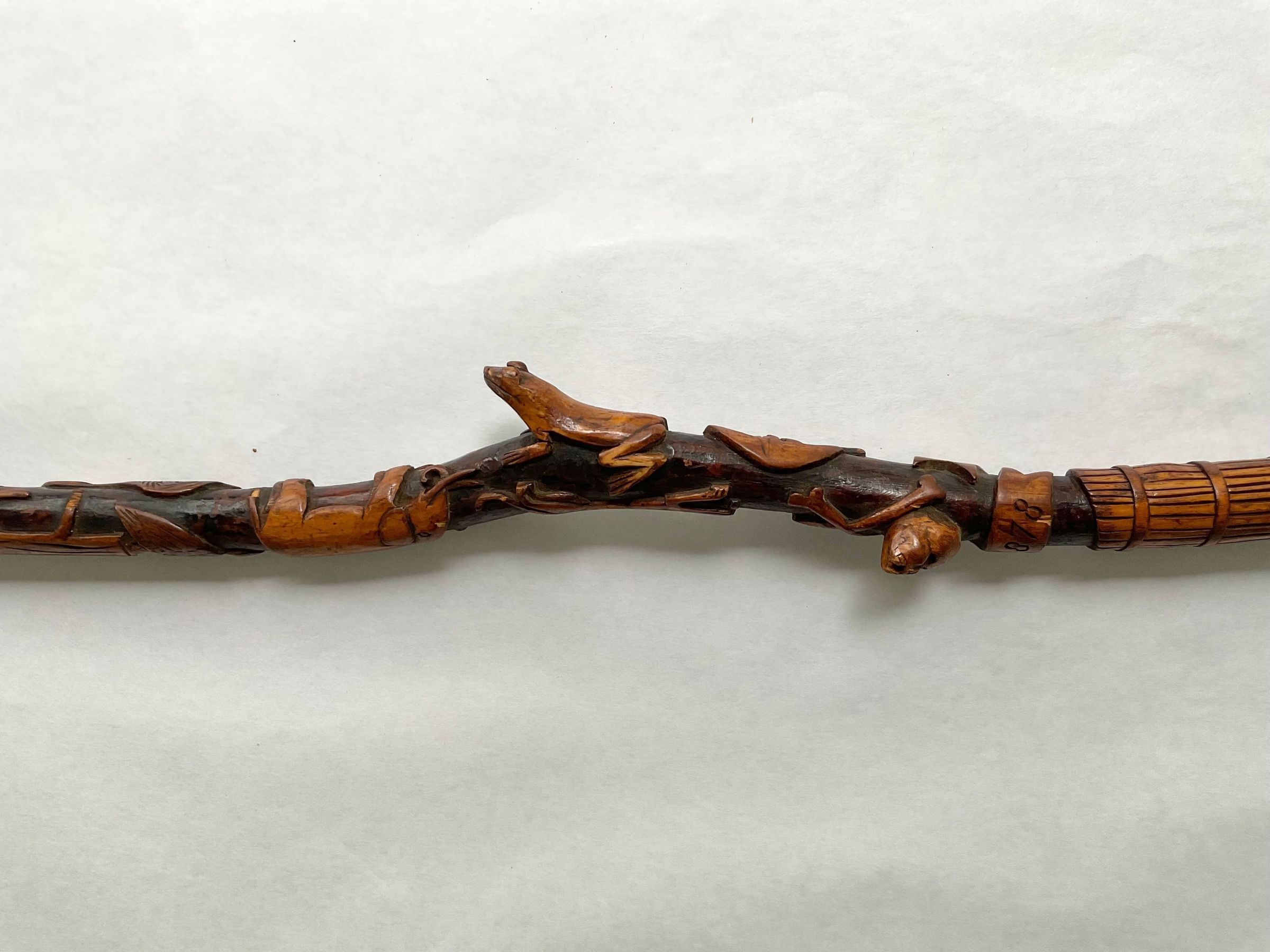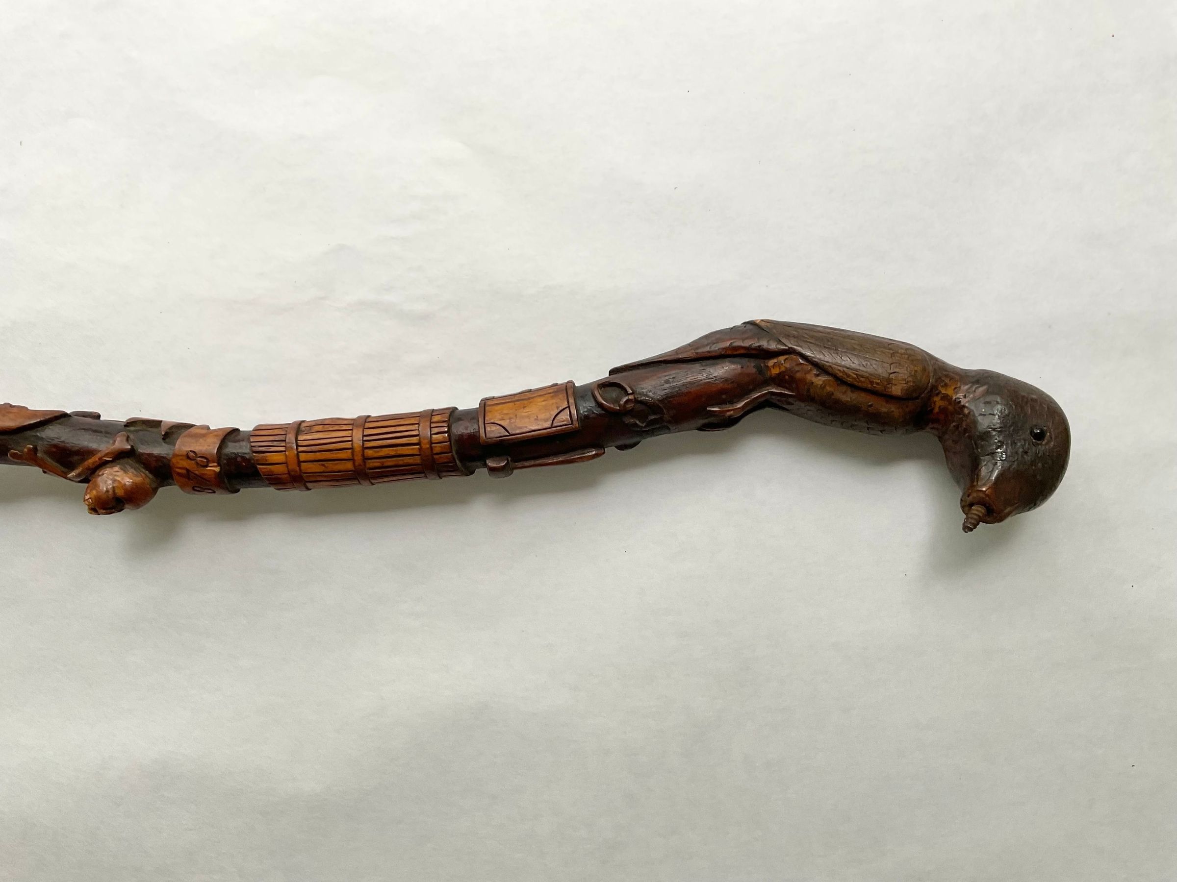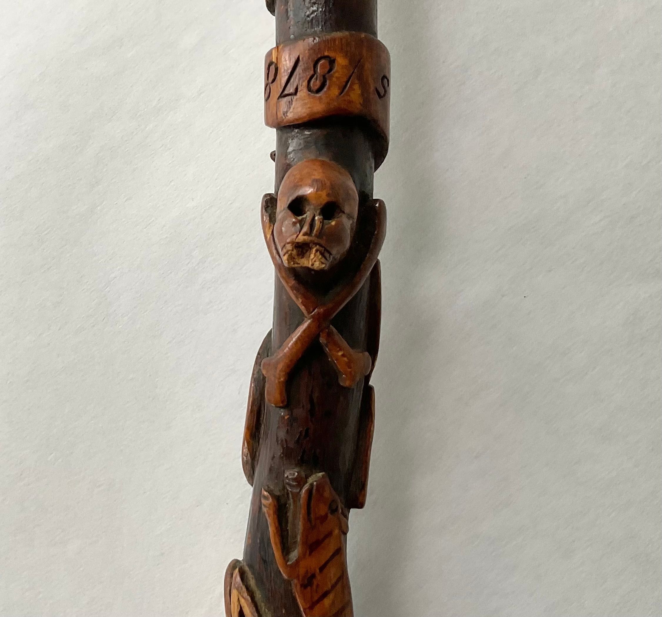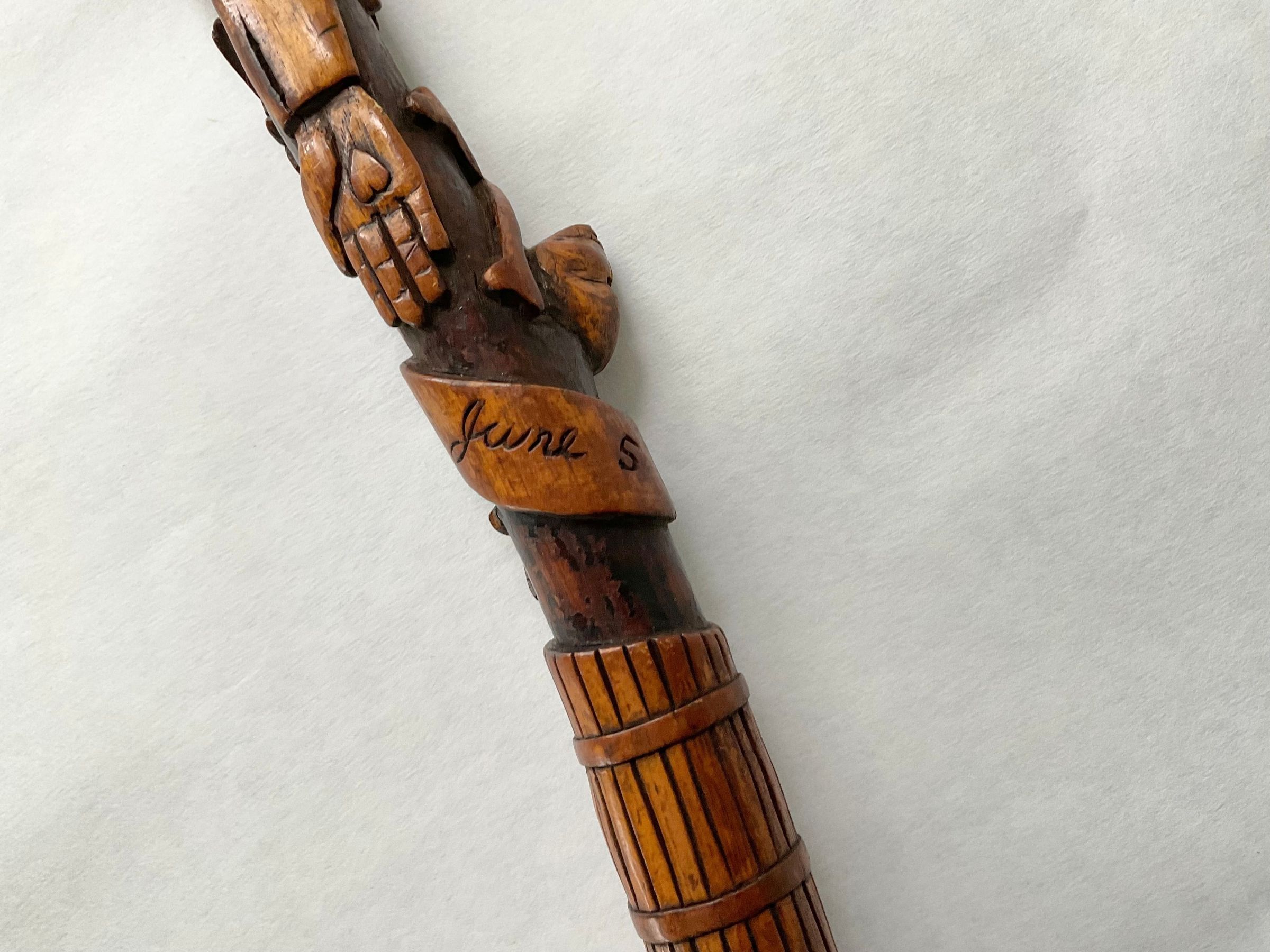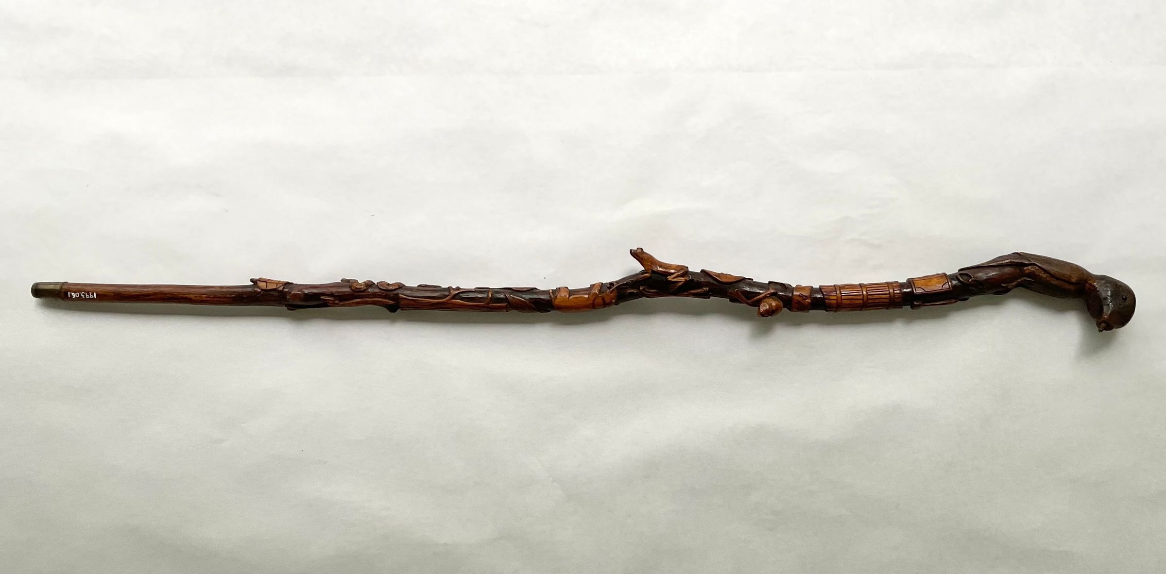 Carved wood cane with symbols: bird three chain links and one eye book gavel wooden planks ribbon (June 5 1878) a skull and crossbones hand moon frog cat elephant fish lion owl snake lizard turtle.Collection