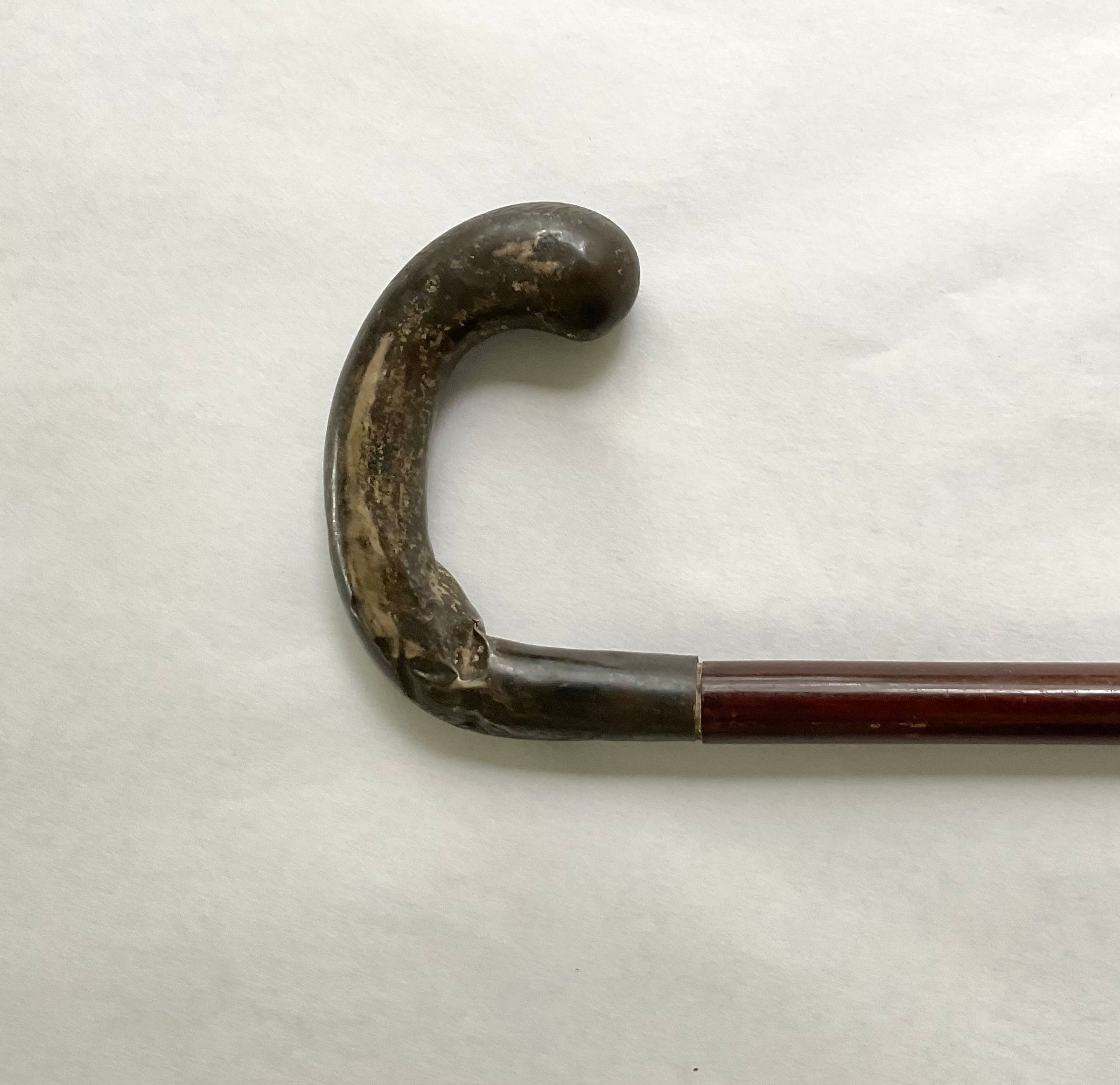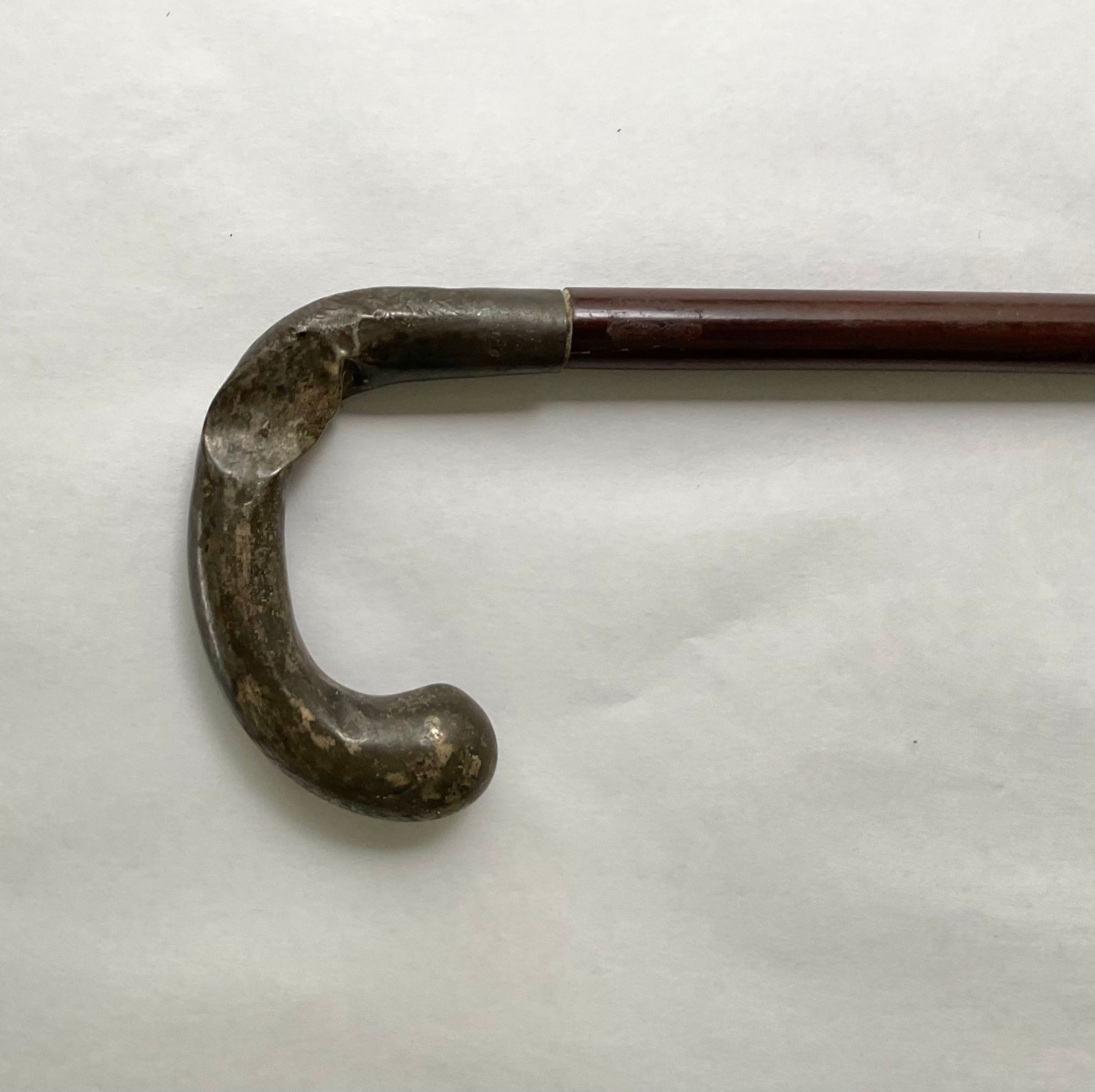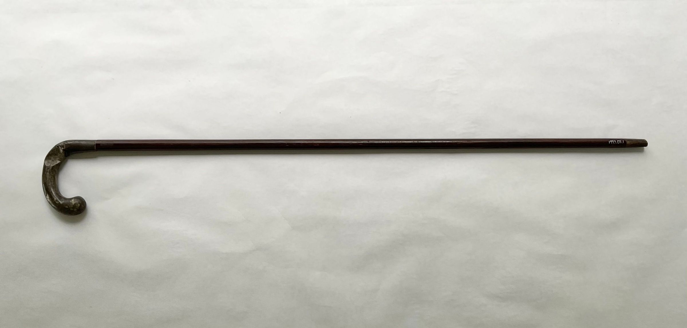 A slender cherry wood cane. The smashed handle and protective tip are possibly made of German silver.Collection