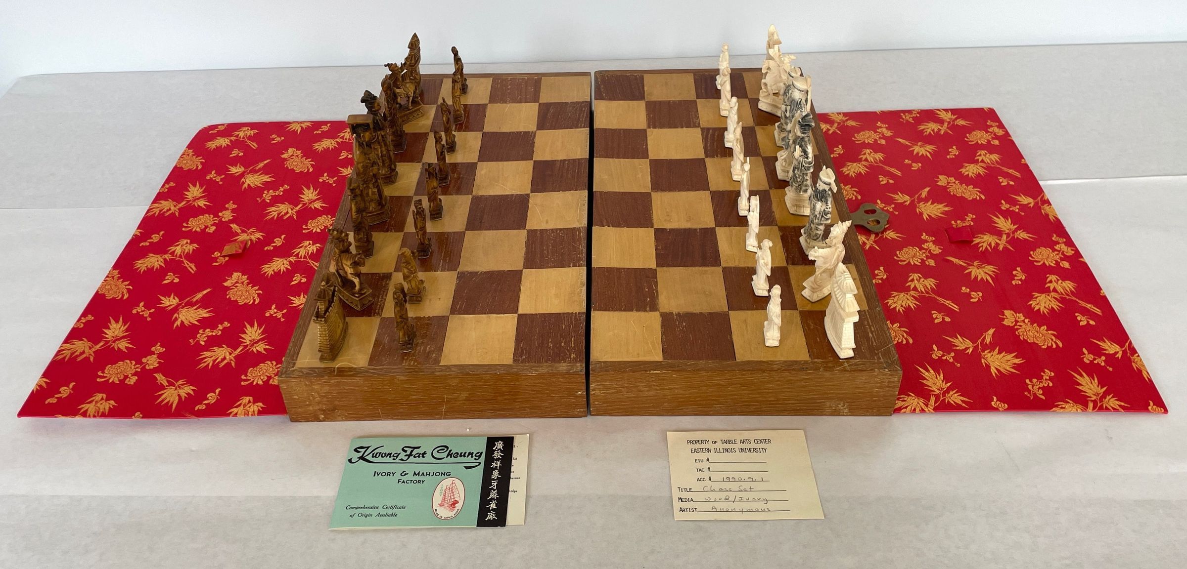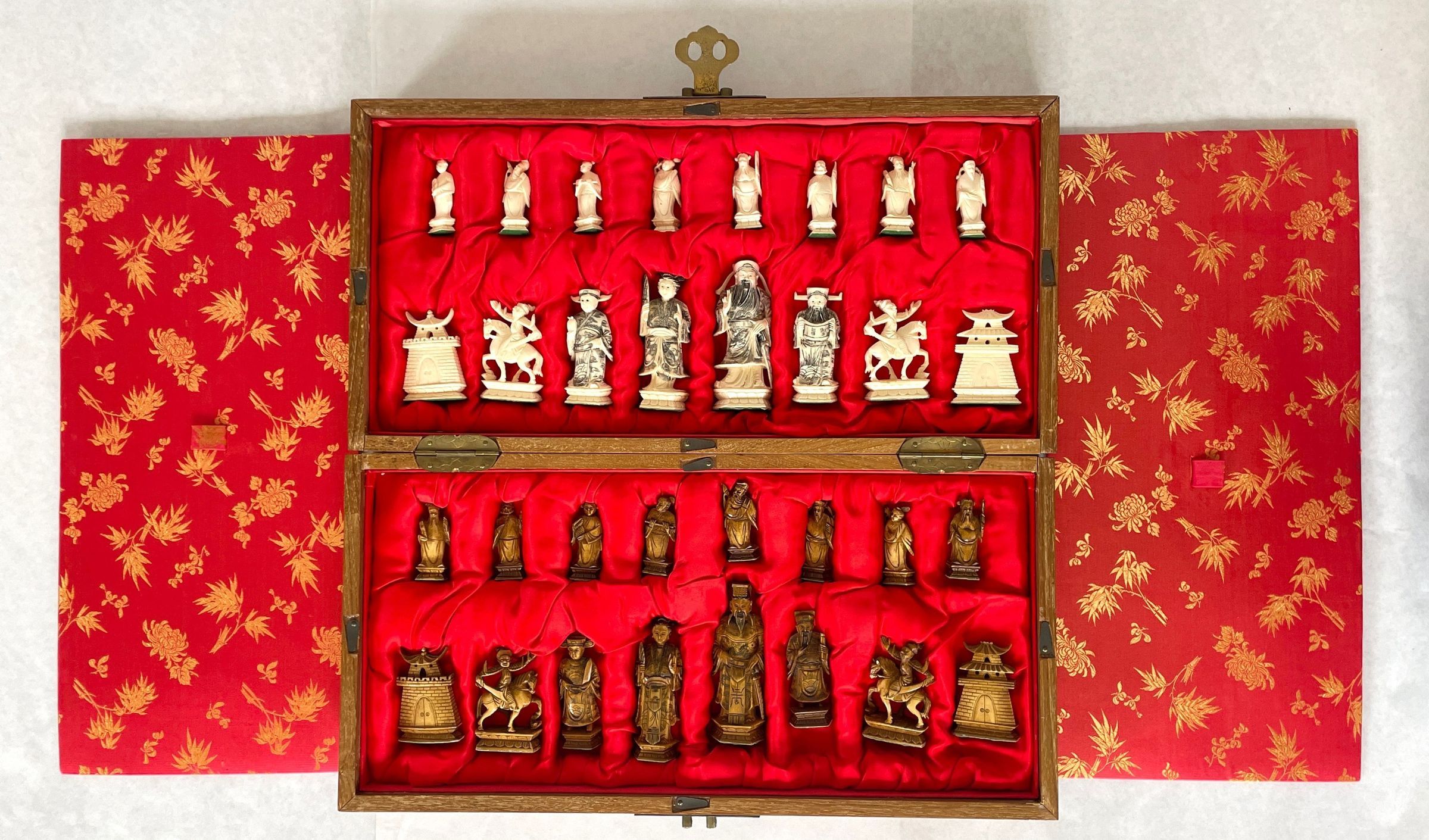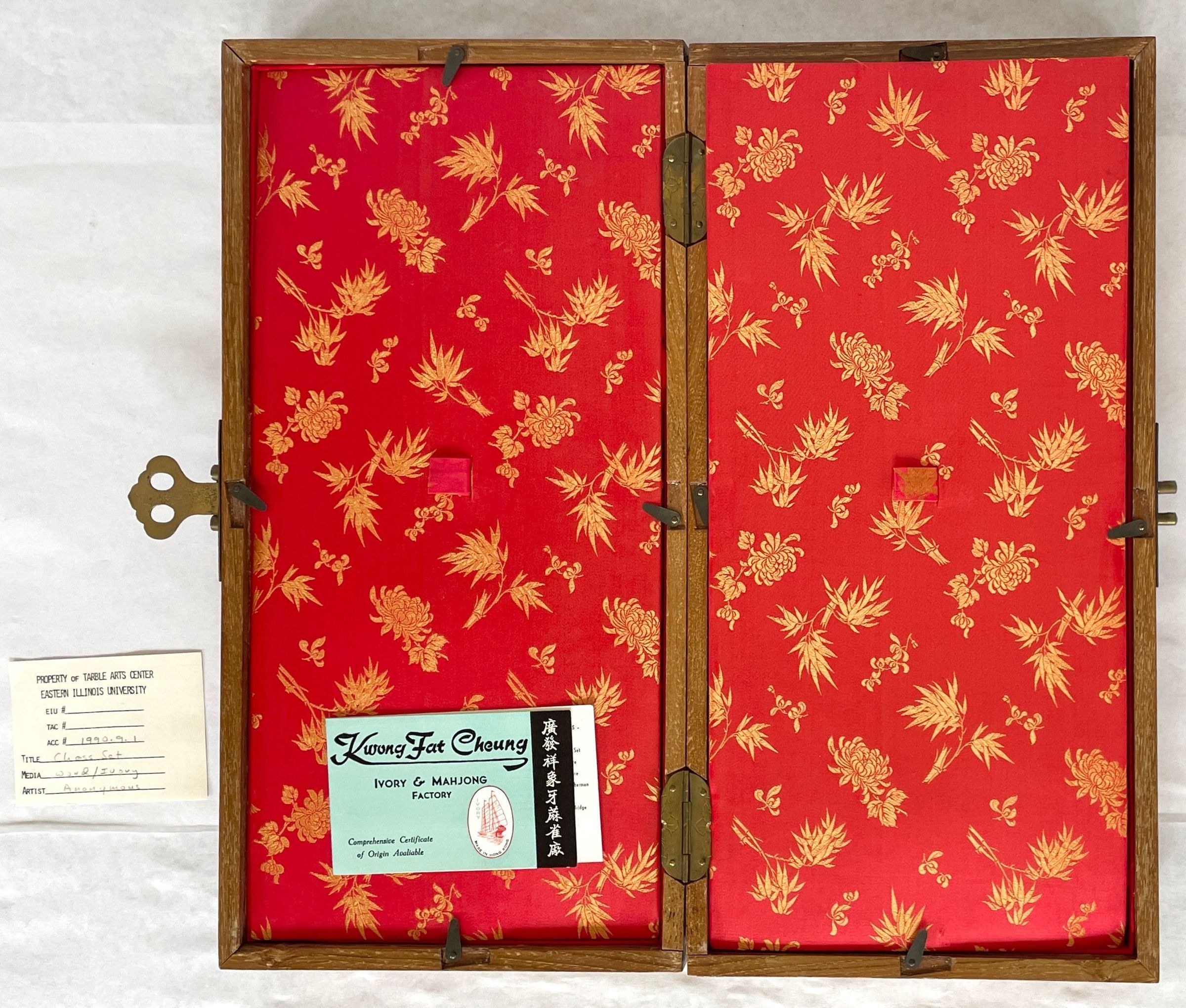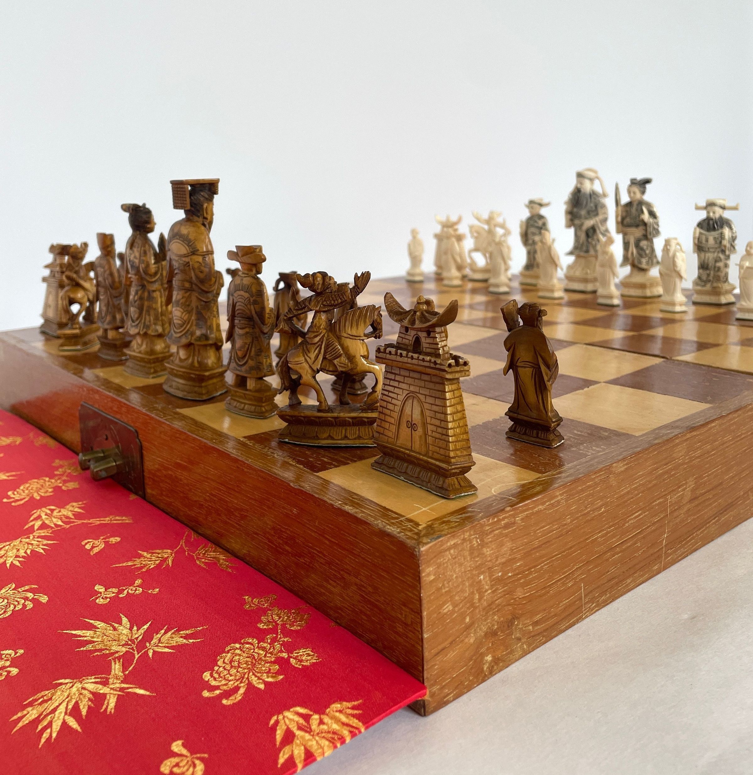 The case which is also the game board when unfolded houses the thirty-two carved ivory playing pieces. Both sets of oriental playing pieces are hand carved ivory.Collection