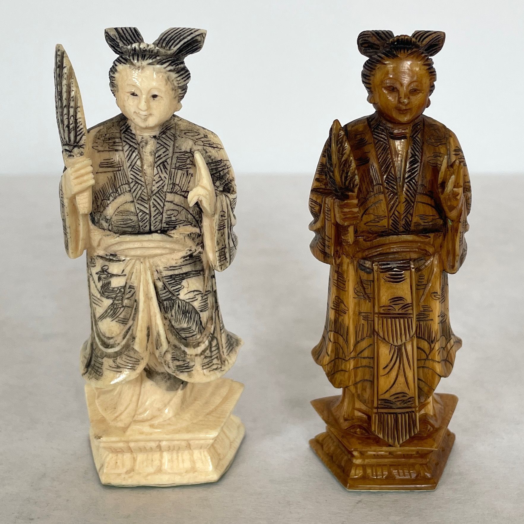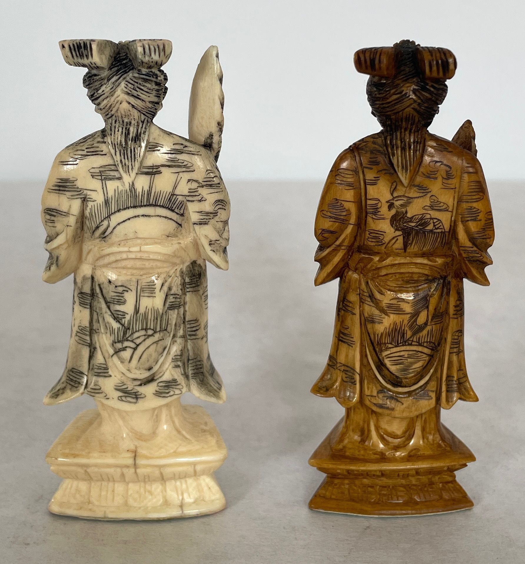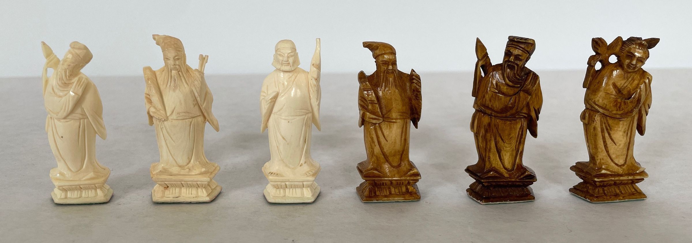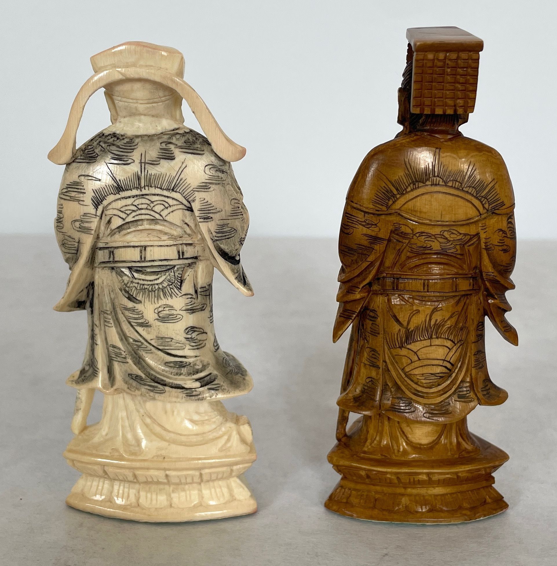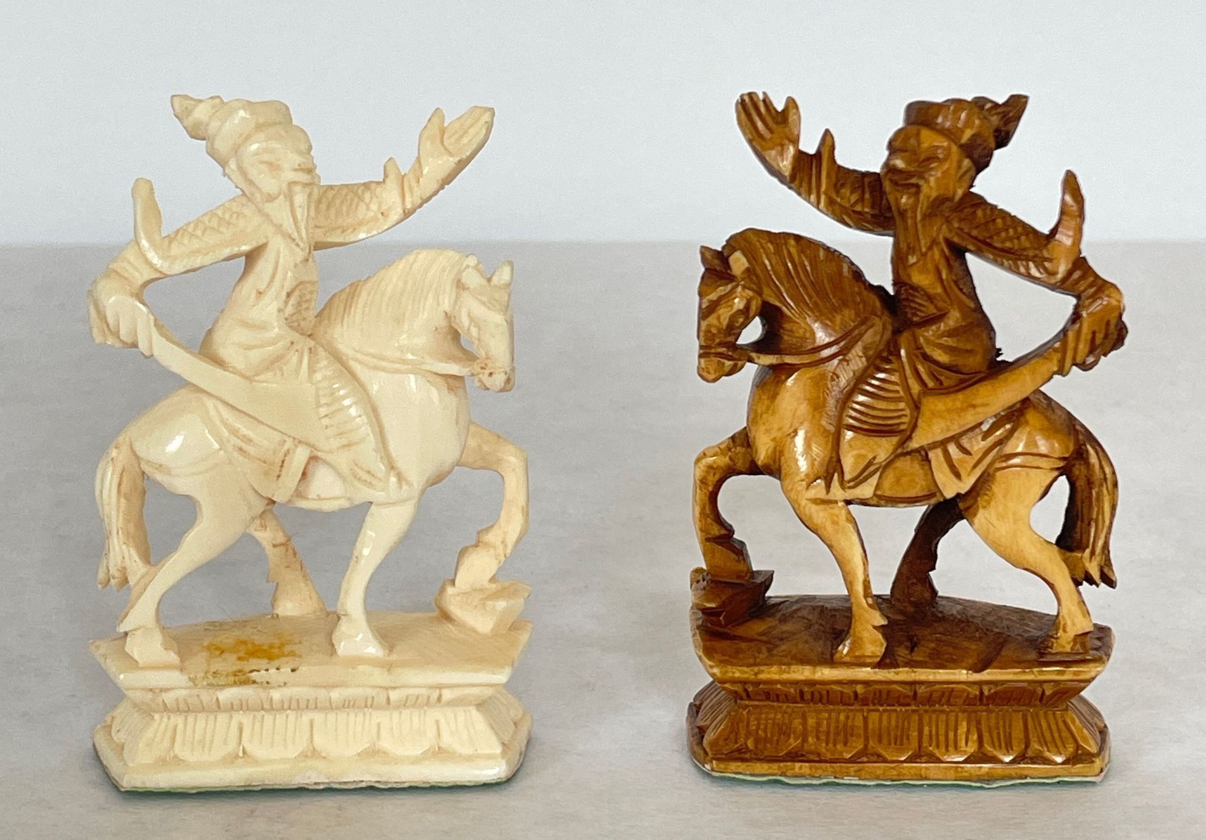 The case which is also the game board when unfolded houses the thirty-two carved ivory playing pieces. Both sets of oriental playing pieces are hand carved ivory.Collection