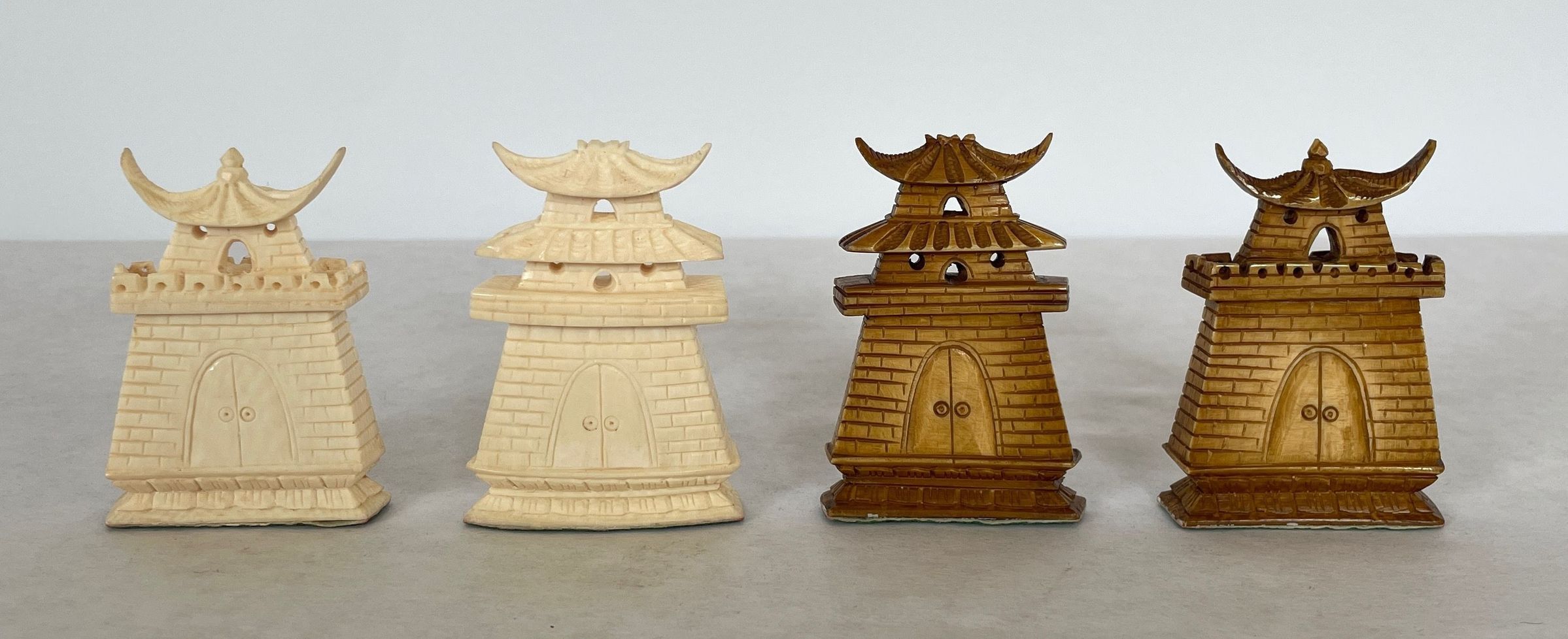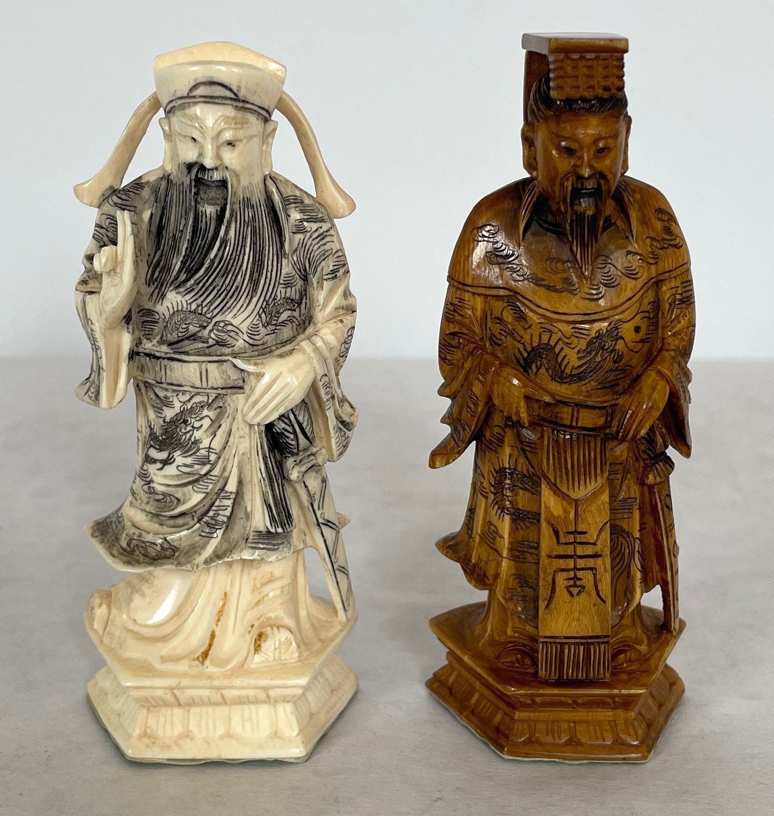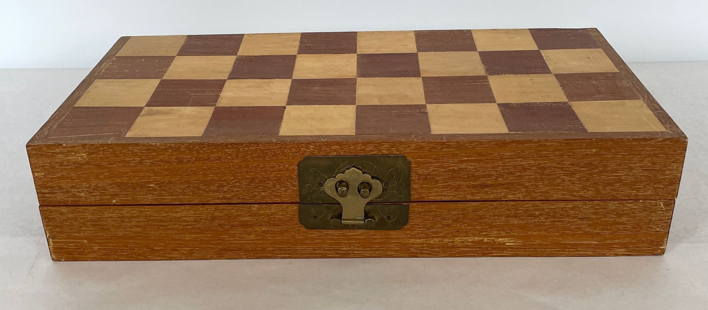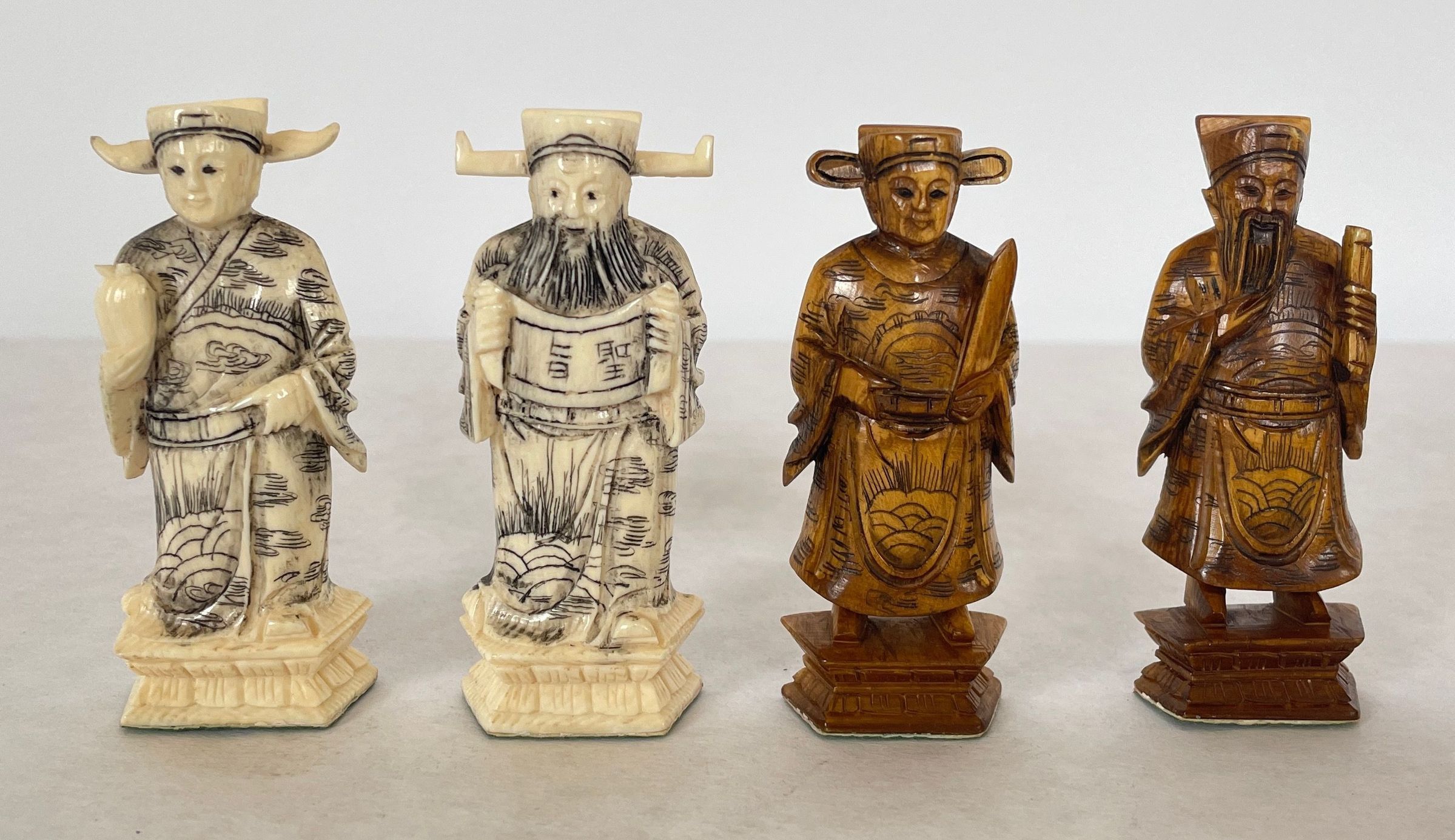 The case which is also the game board when unfolded houses the thirty-two carved ivory playing pieces. Both sets of oriental playing pieces are hand carved ivory.Collection