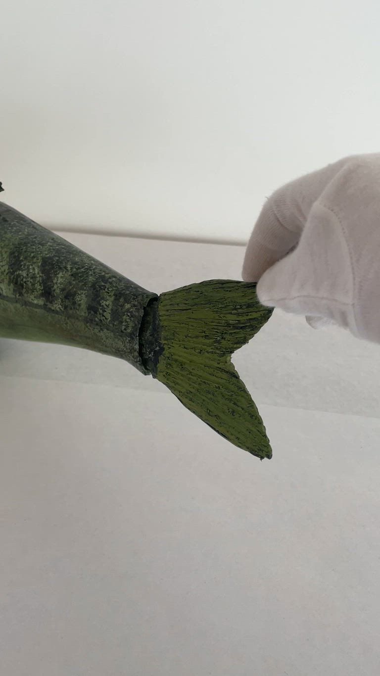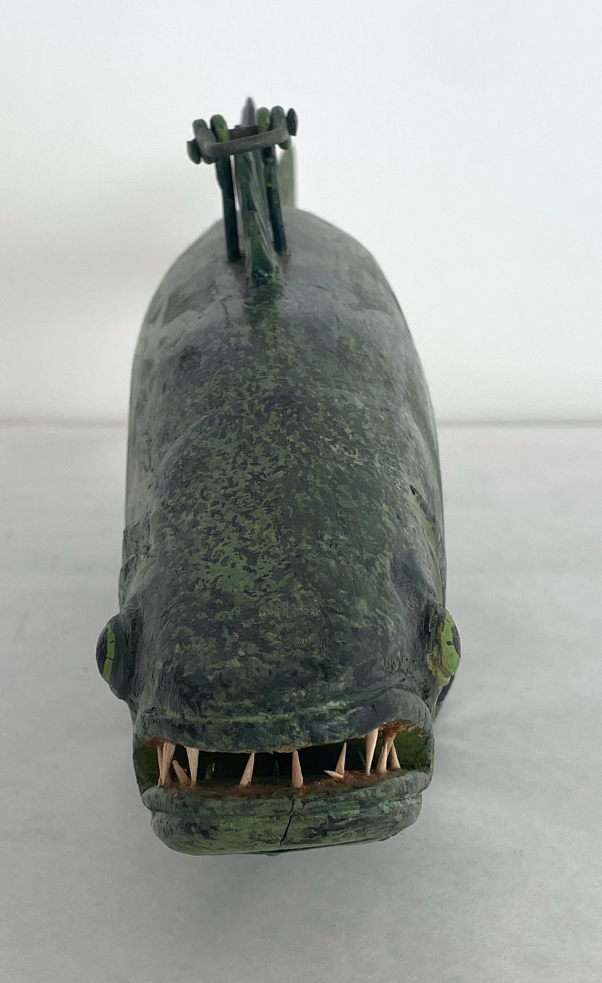Green with black flecks initials ARW on underside near middle metal plate underside of head toothpick teeth moveable tail.Collection
