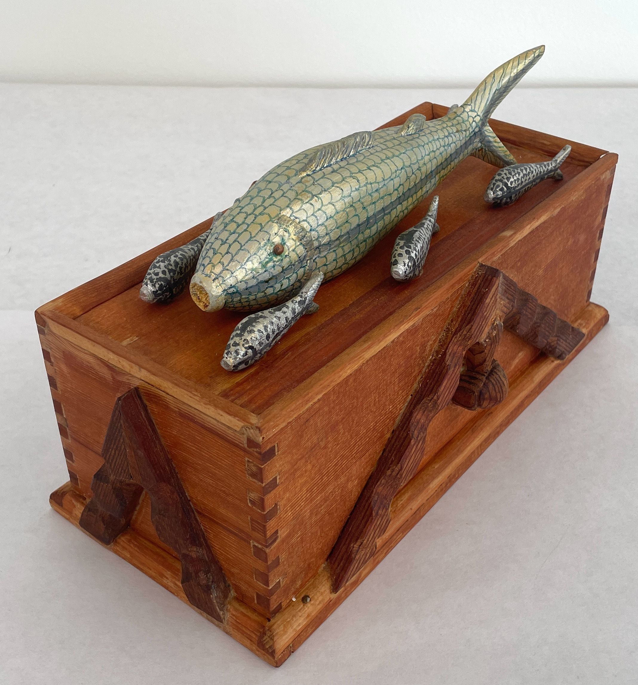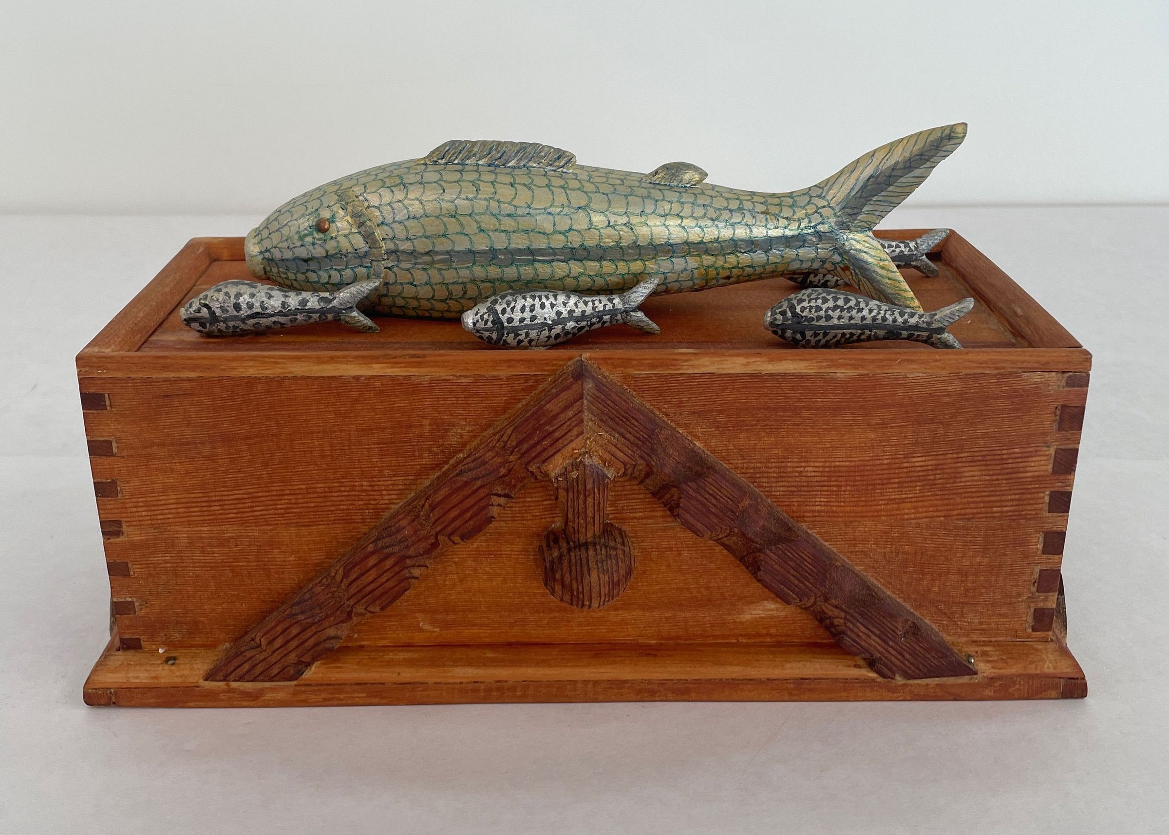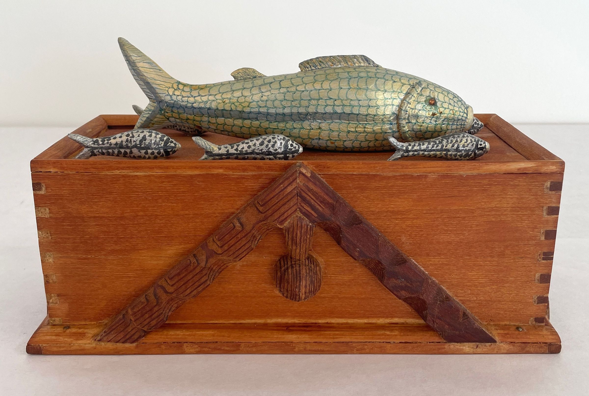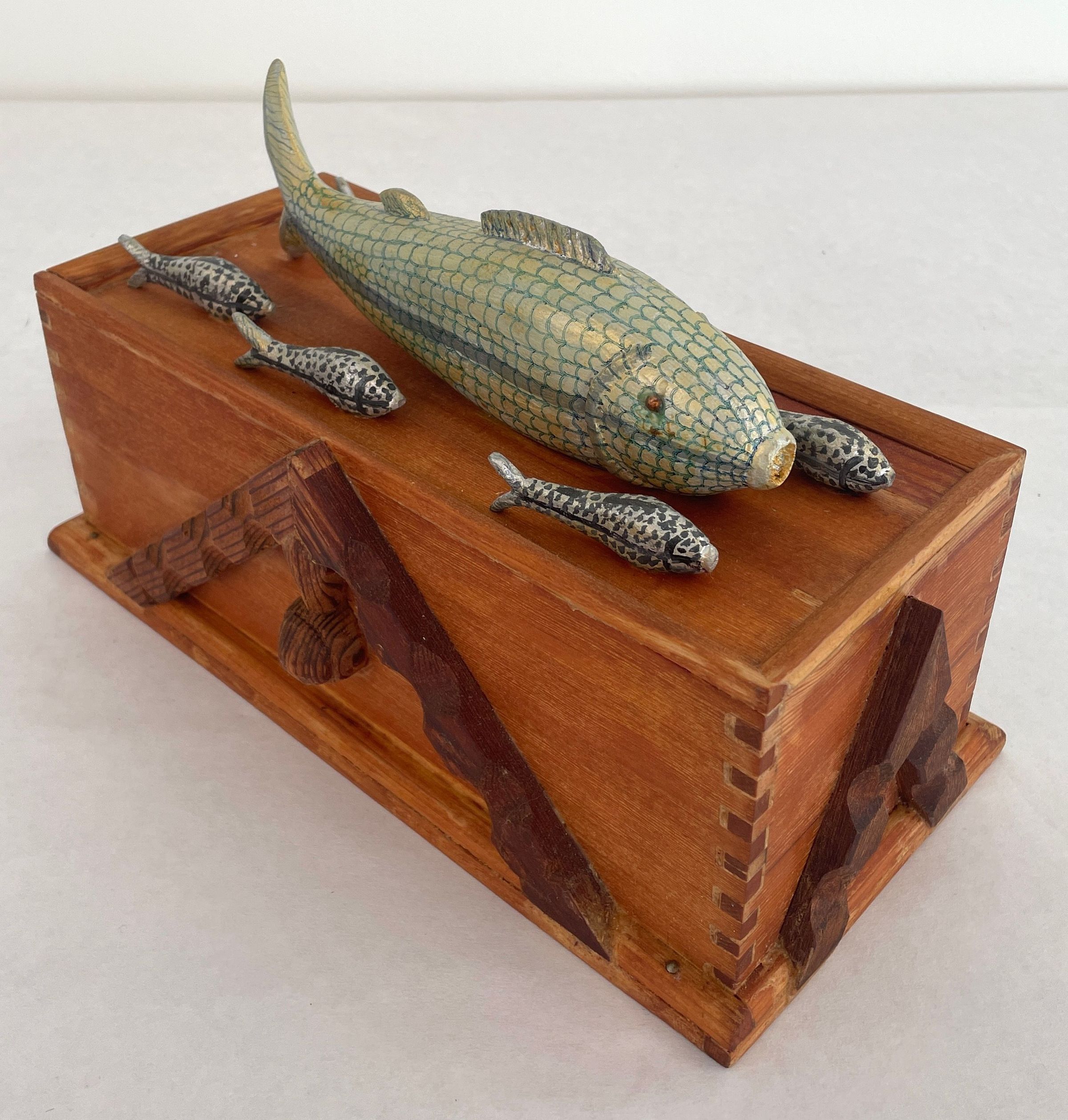 box with minnows on lidone minnow 8" long and has three on each side of it 2 1/4" long.Collection