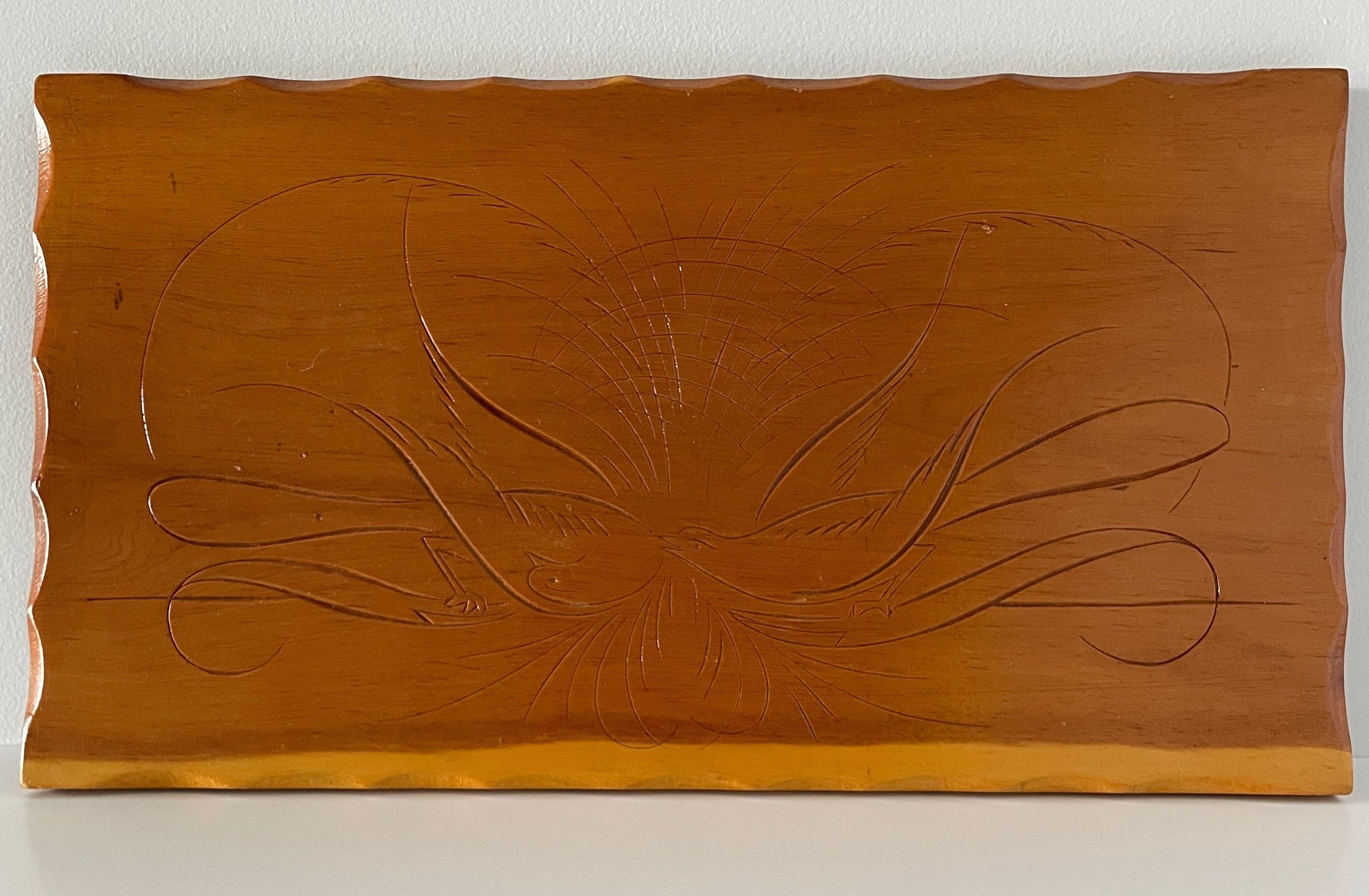 Incised pattern of two birds done in very delicate lines. Various free-flowing patterns surround and are incorporated into bird design. Done on light toned wood, carved, scalloped edges.Collection