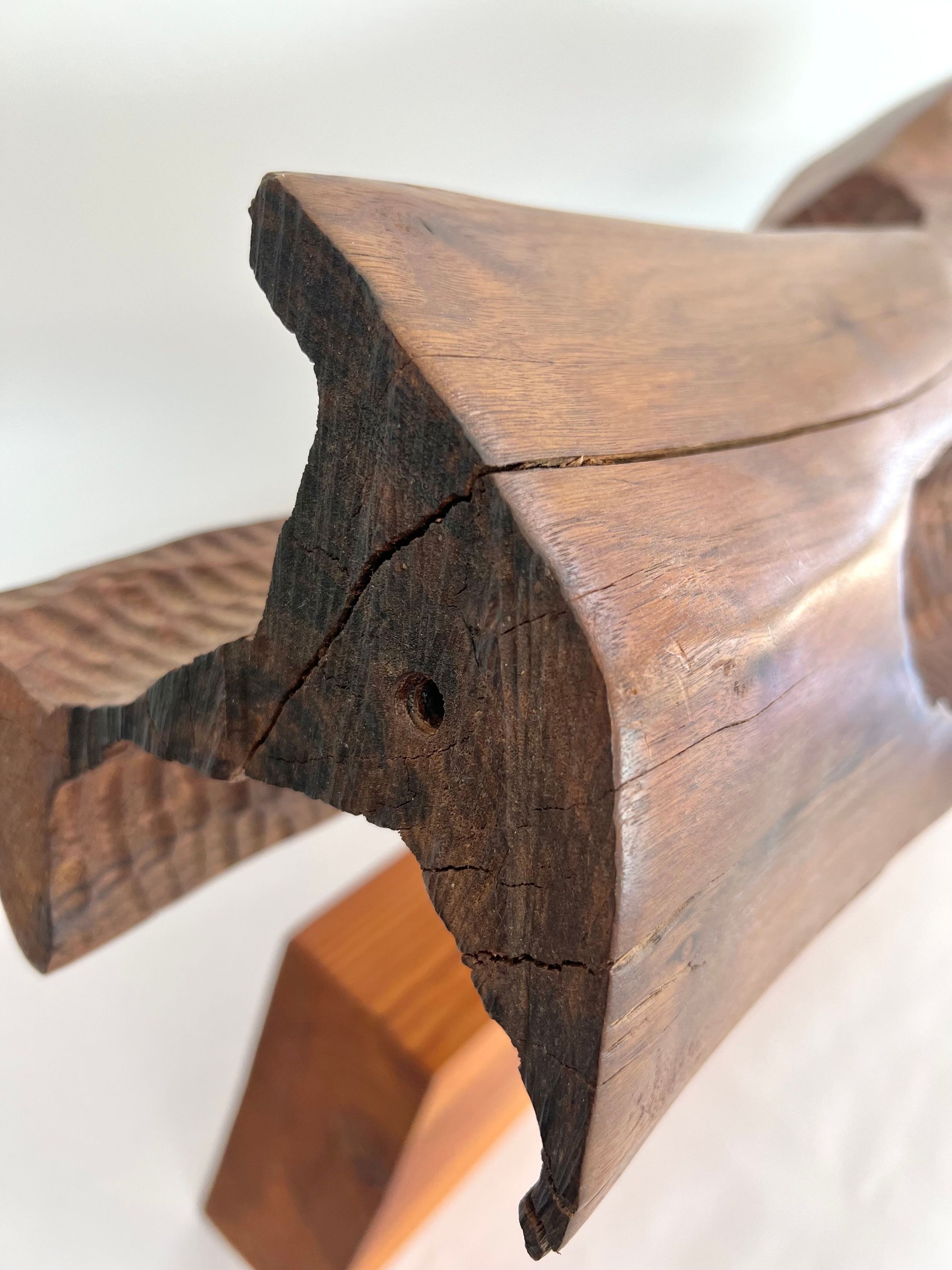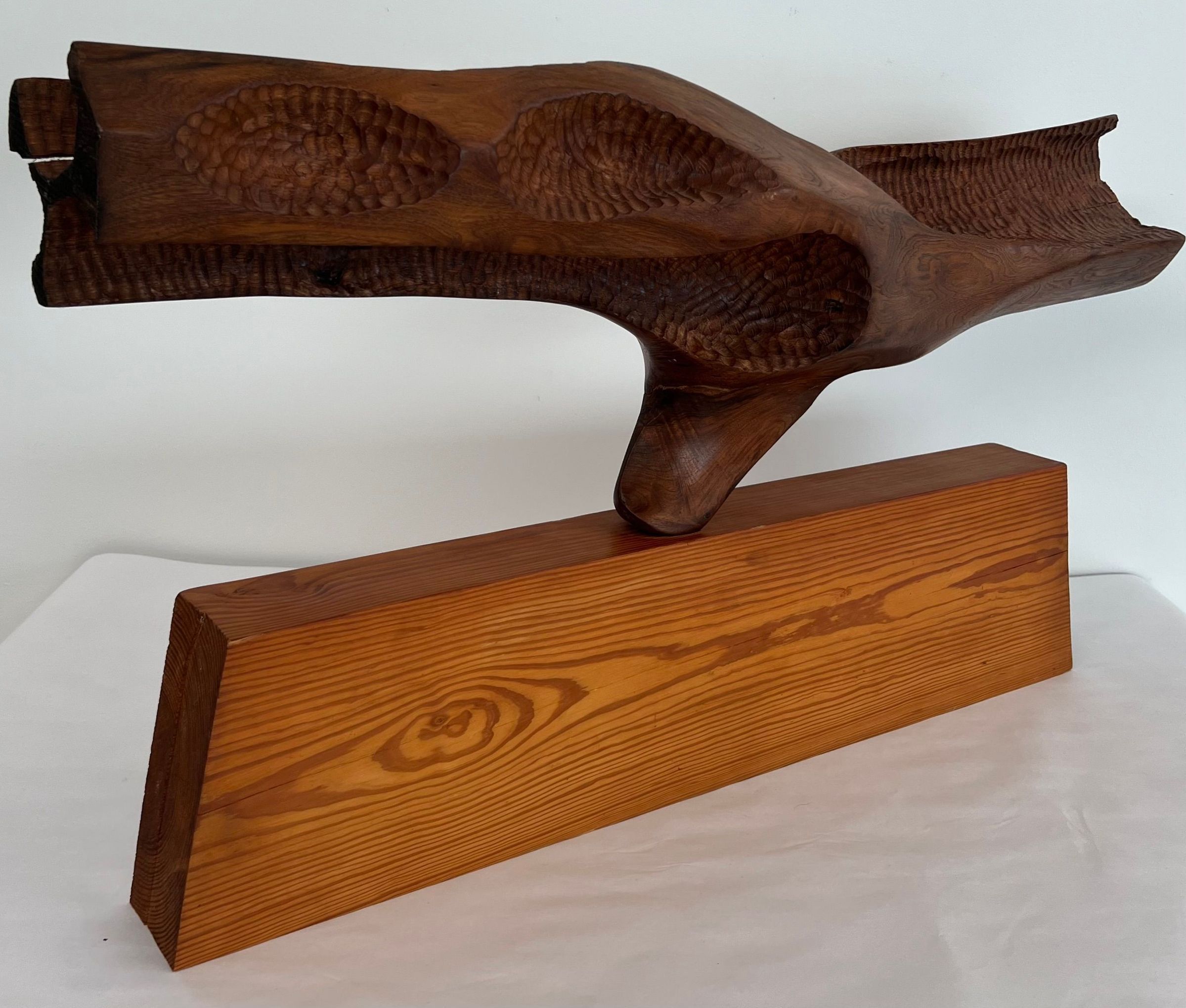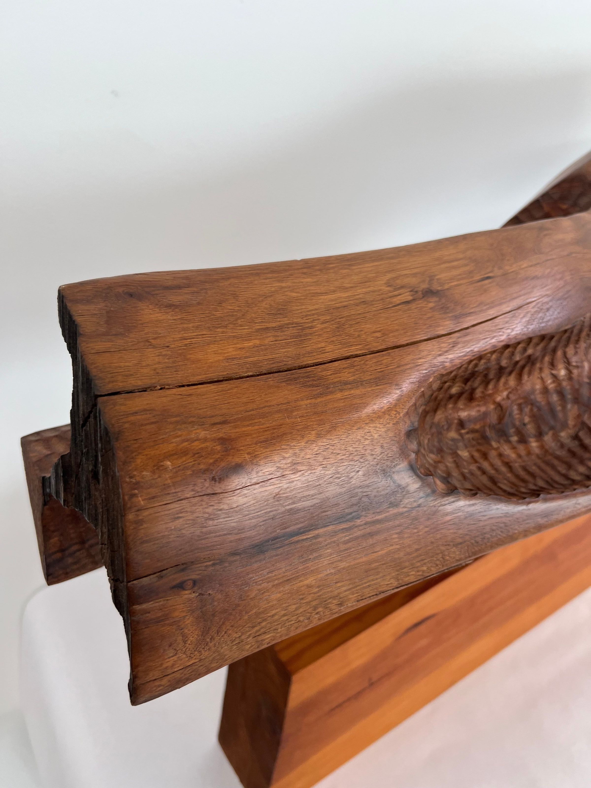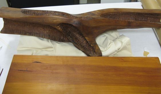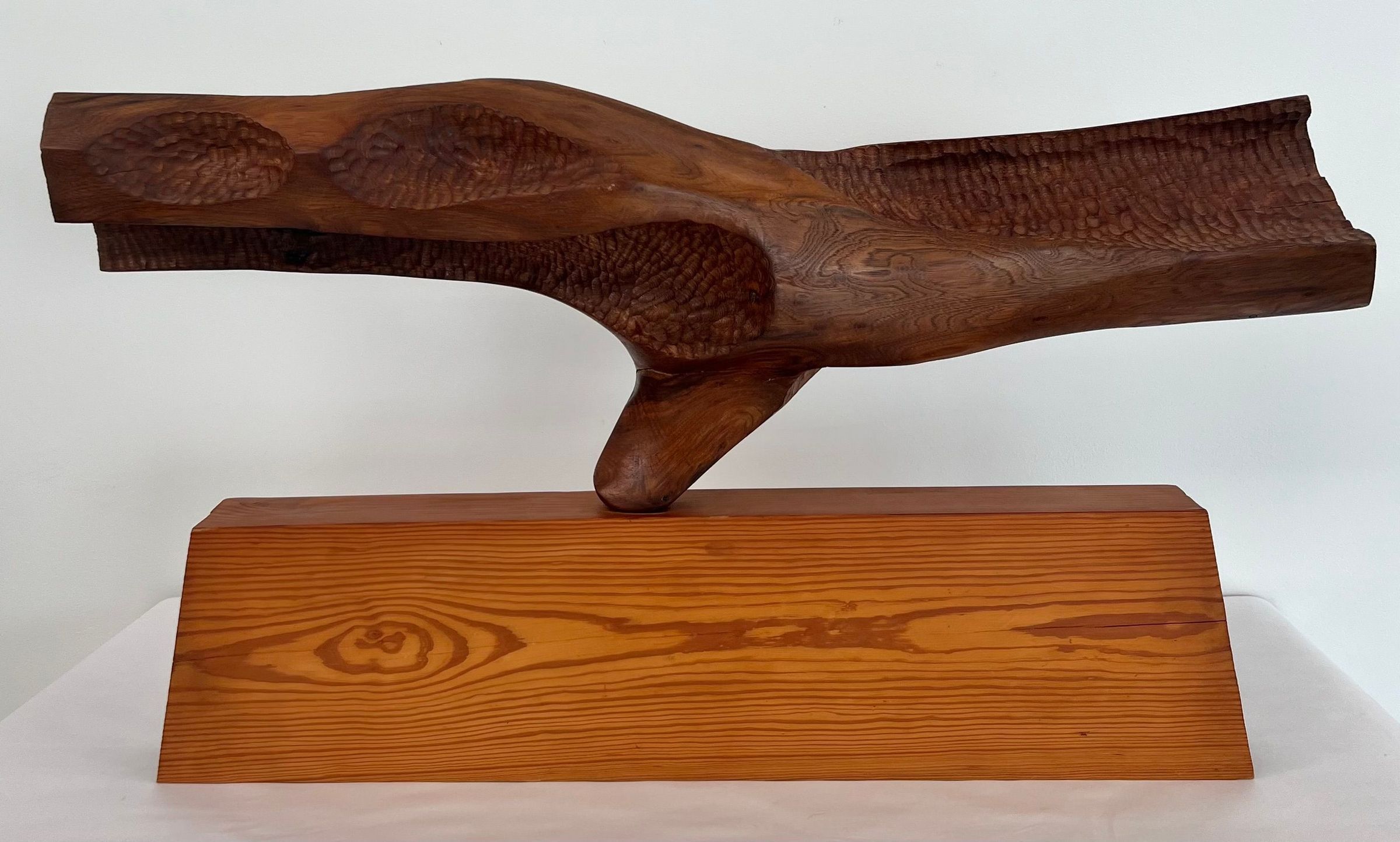 Carved horizontal log form set upon long wooden base.Location