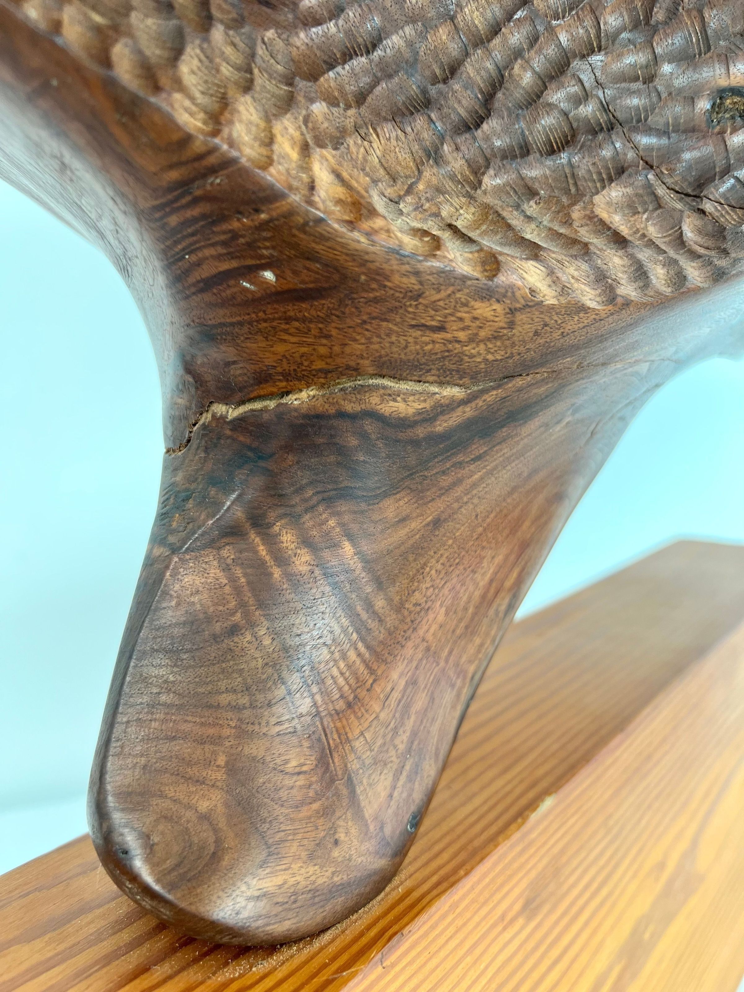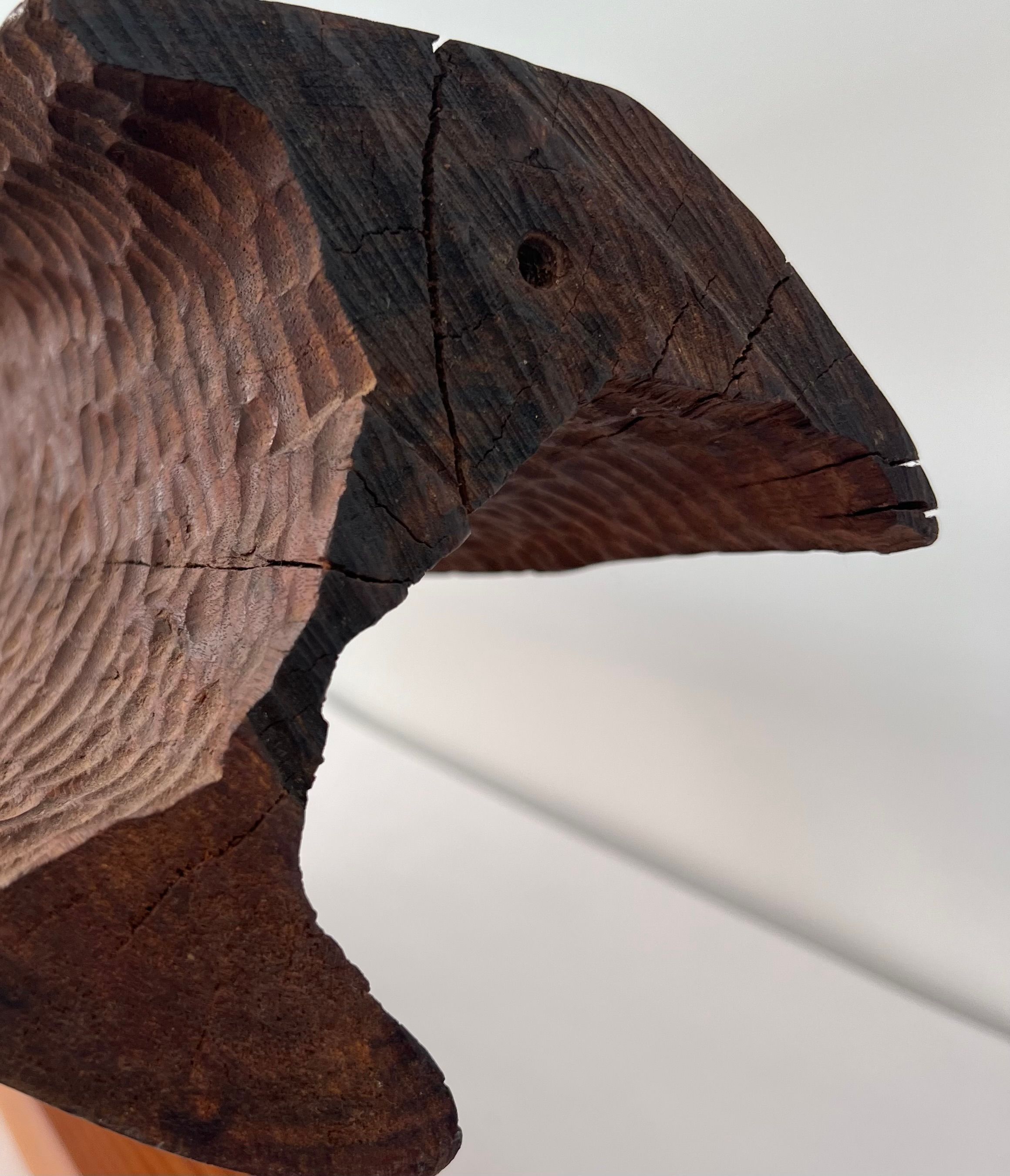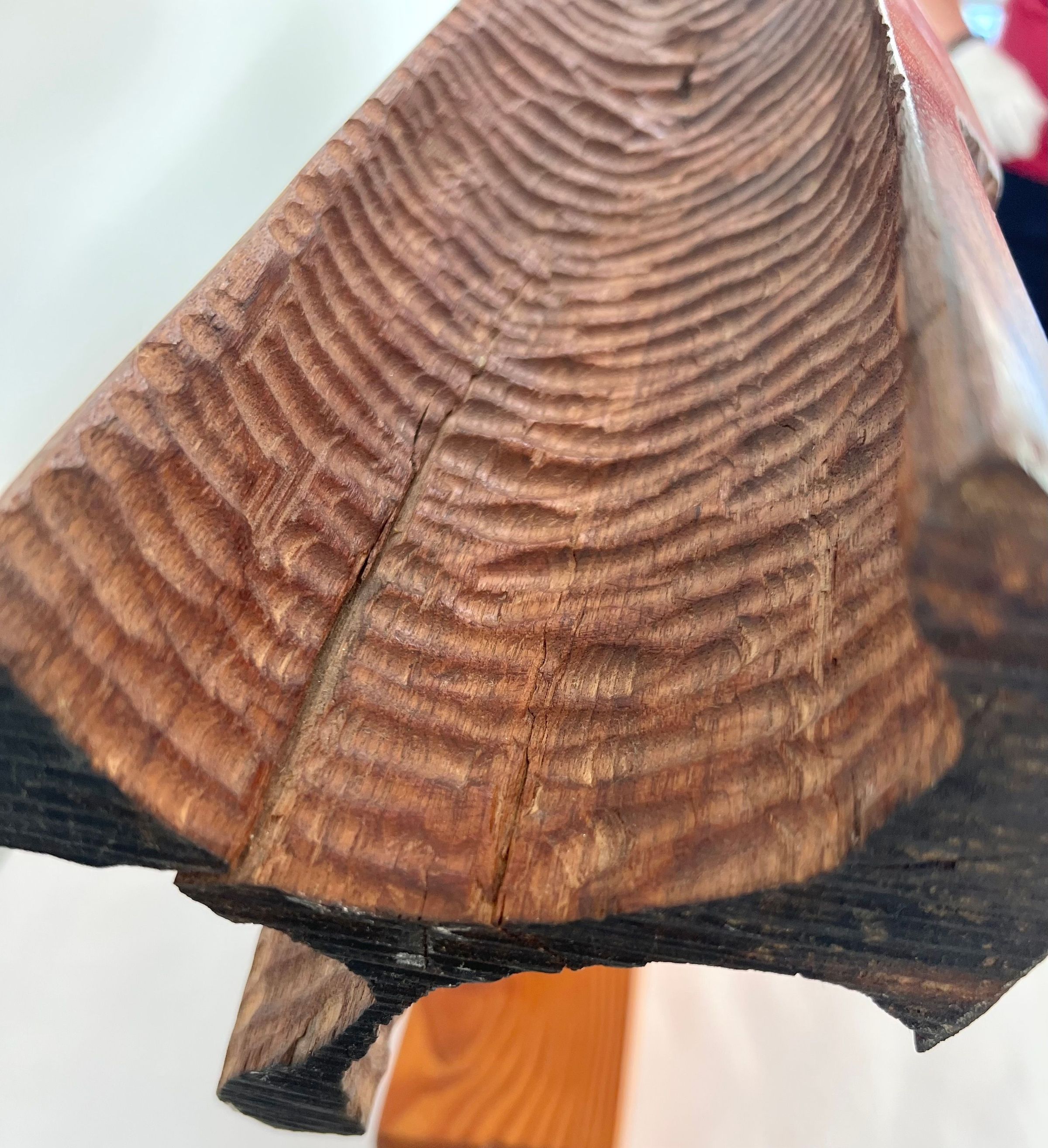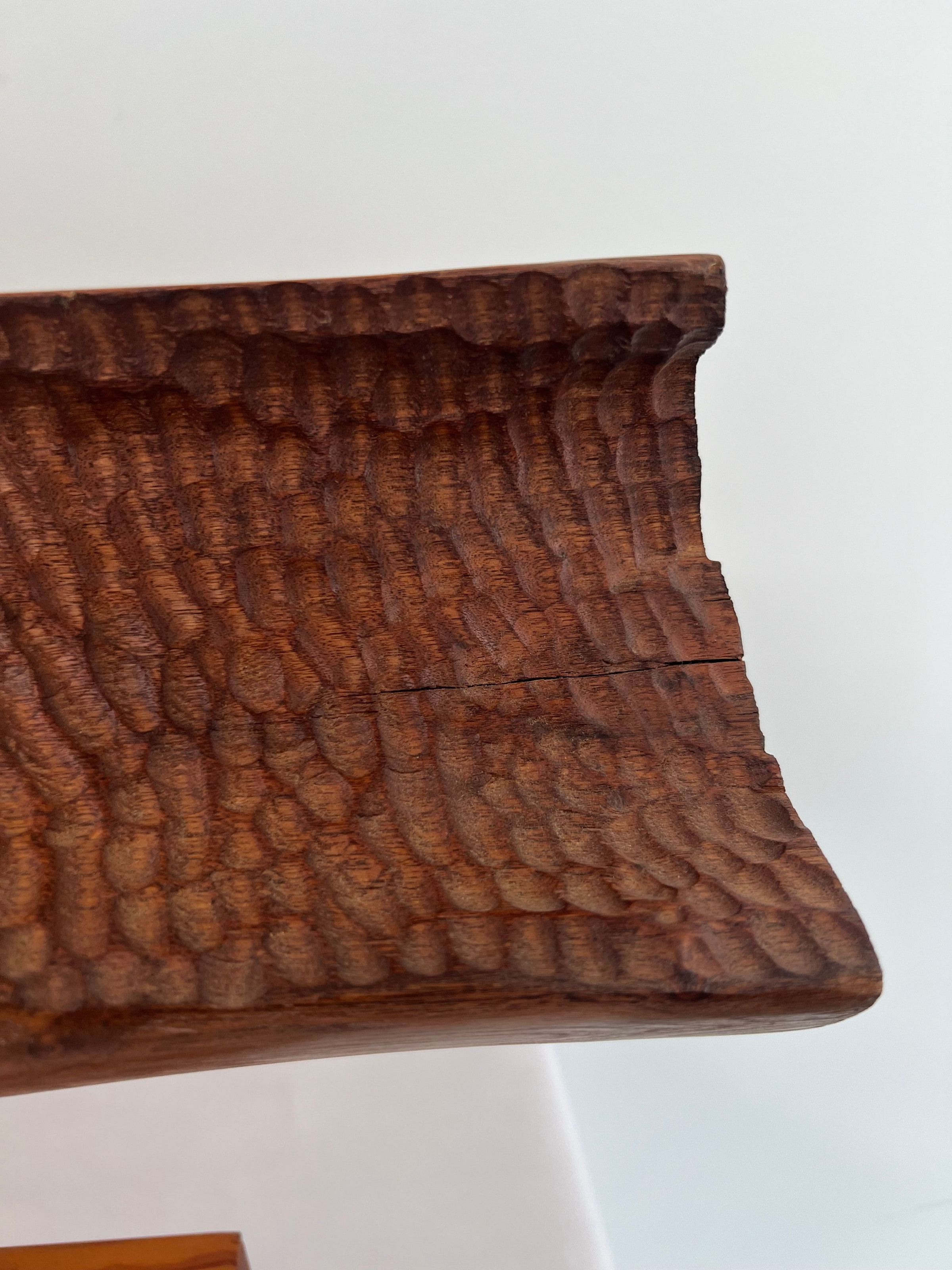 Carved horizontal log form set upon long wooden base.Location