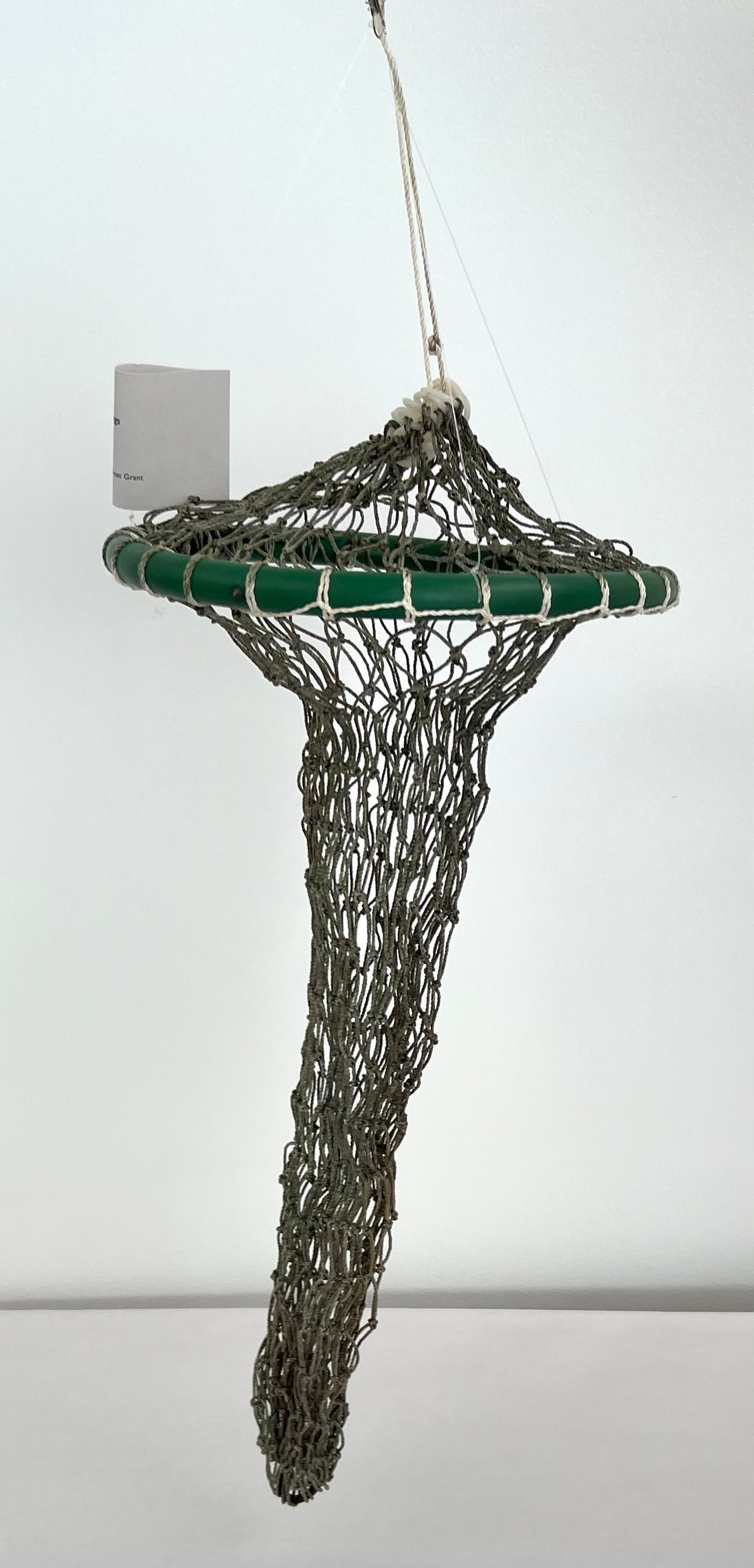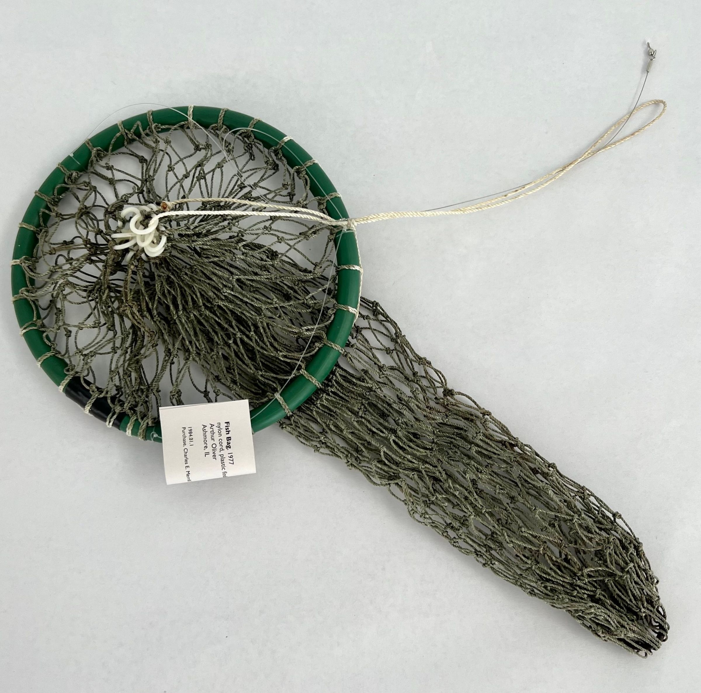 Hand knit fish bag. Hoop at top is green plastic tubing. Nylon threading is green white threading around top hoop.Collection