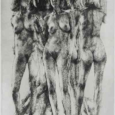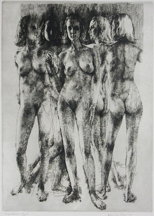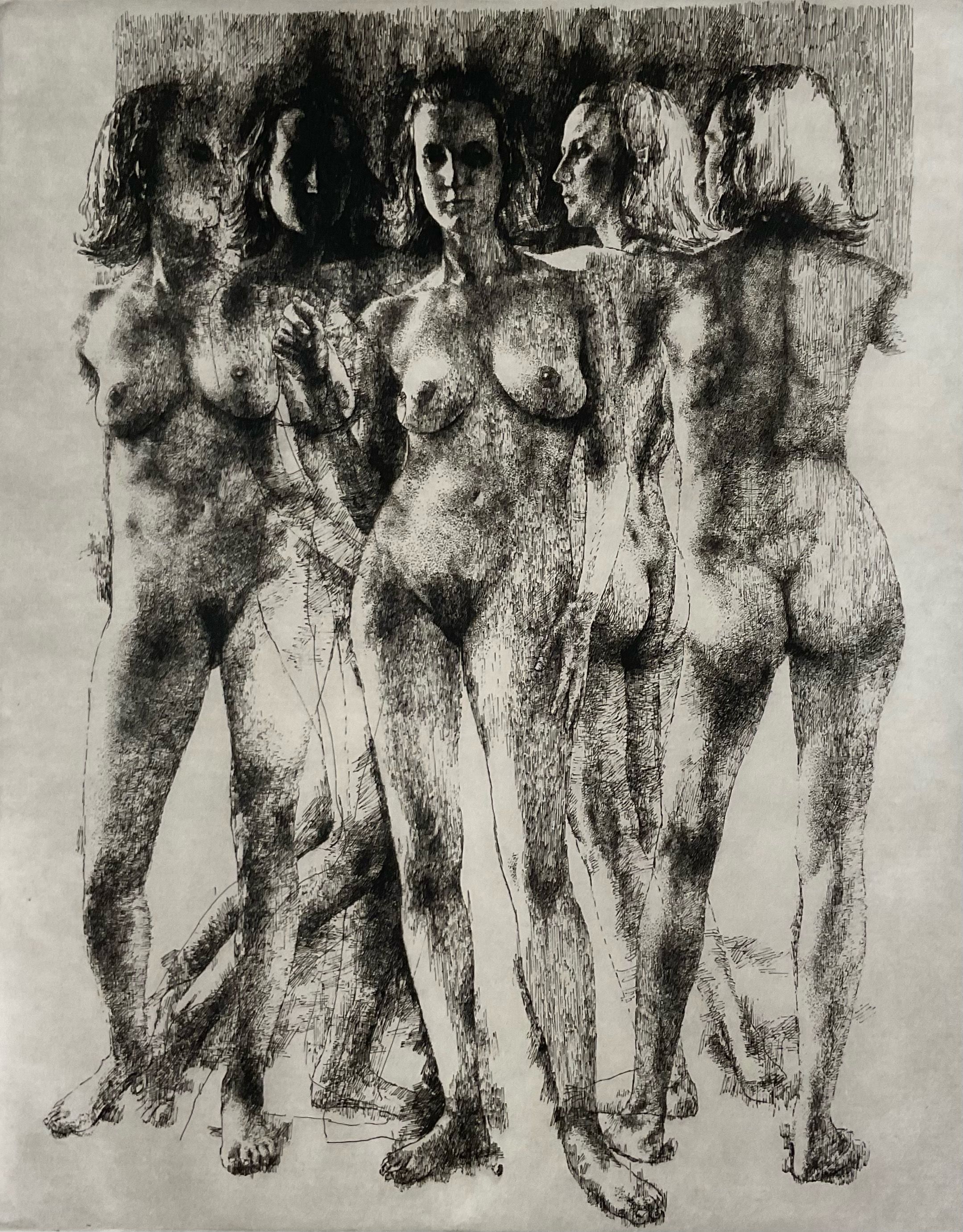 Black & white, five studies of same standing nude model. Slightly and variously overlapping. Half of the print shows the figures white on black, lower half is reversed.Collection
