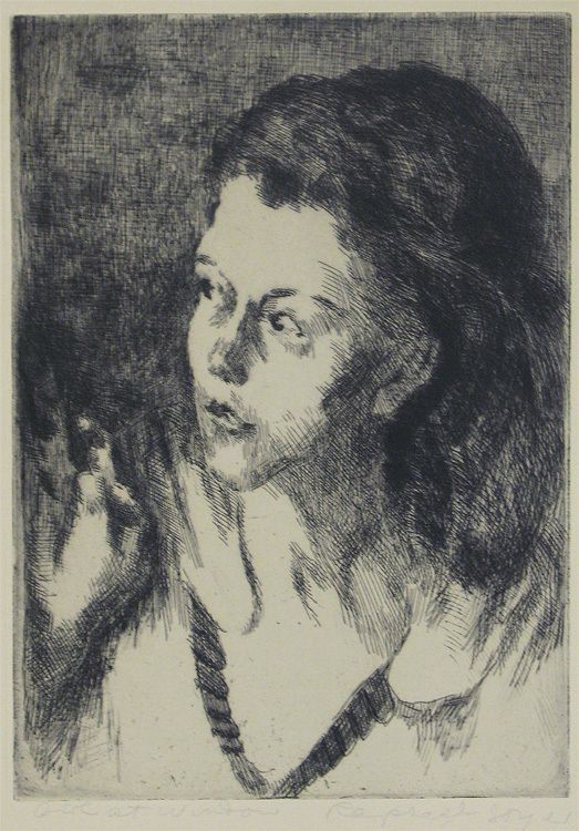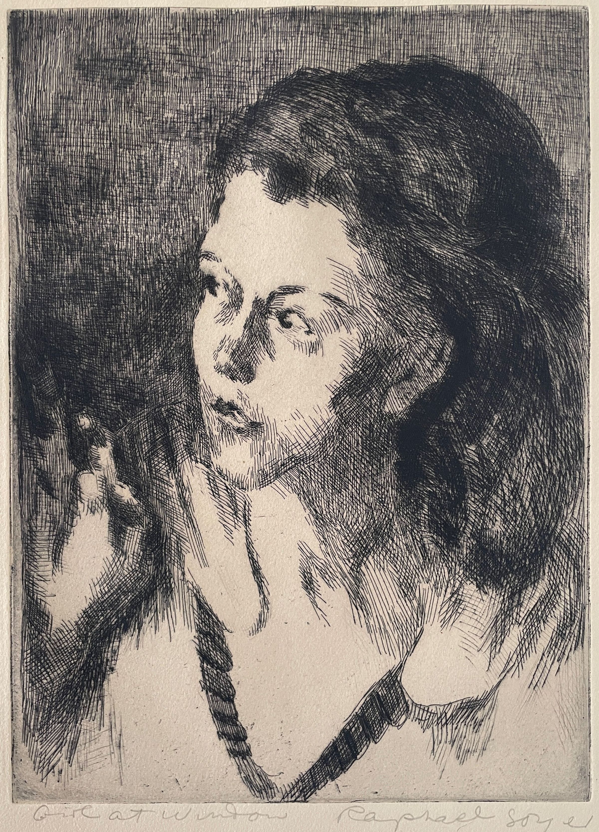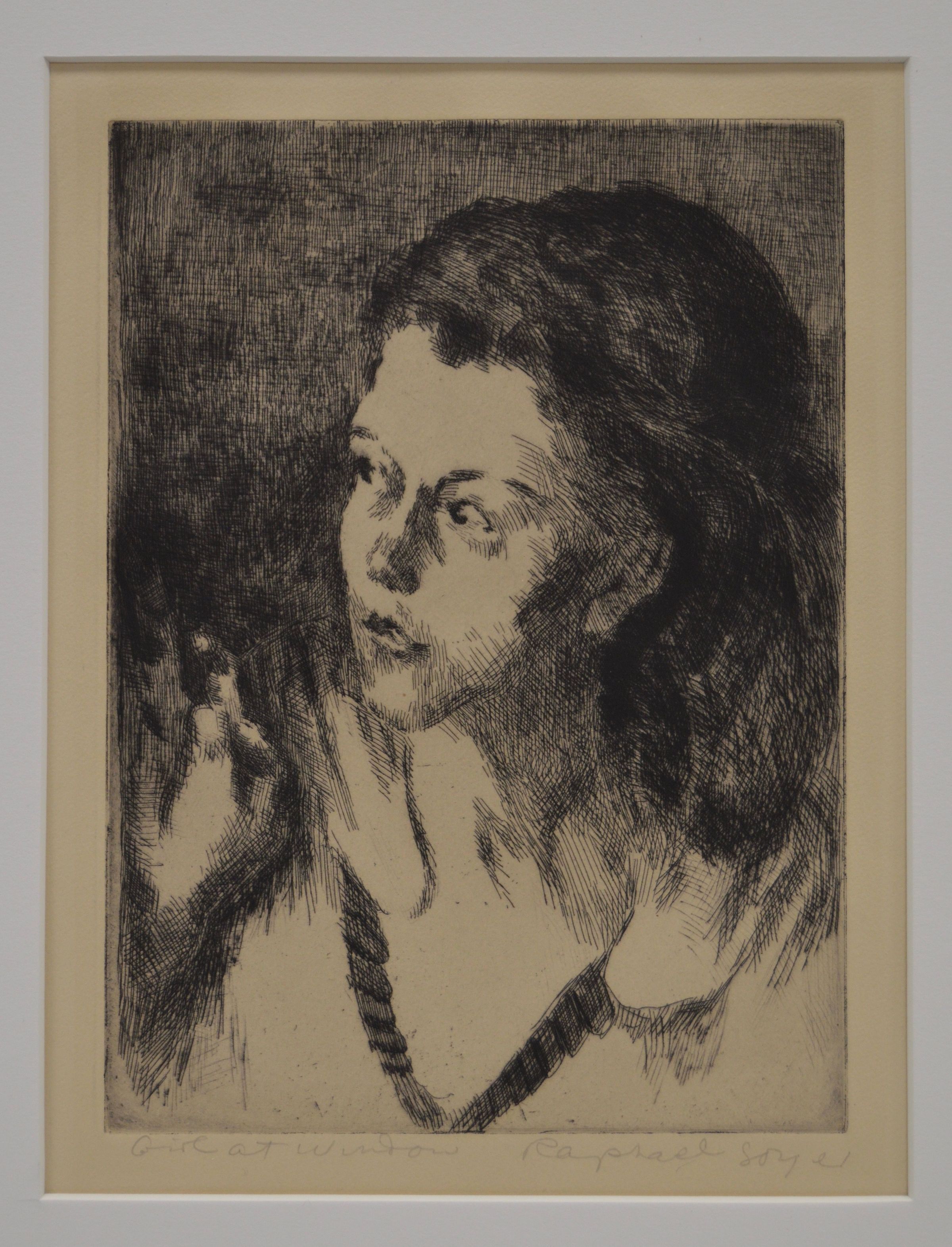 Girl with hand on window looking to left. Wearing a V-Neck. Black and white Commissioned by Associated American Artists.Collection