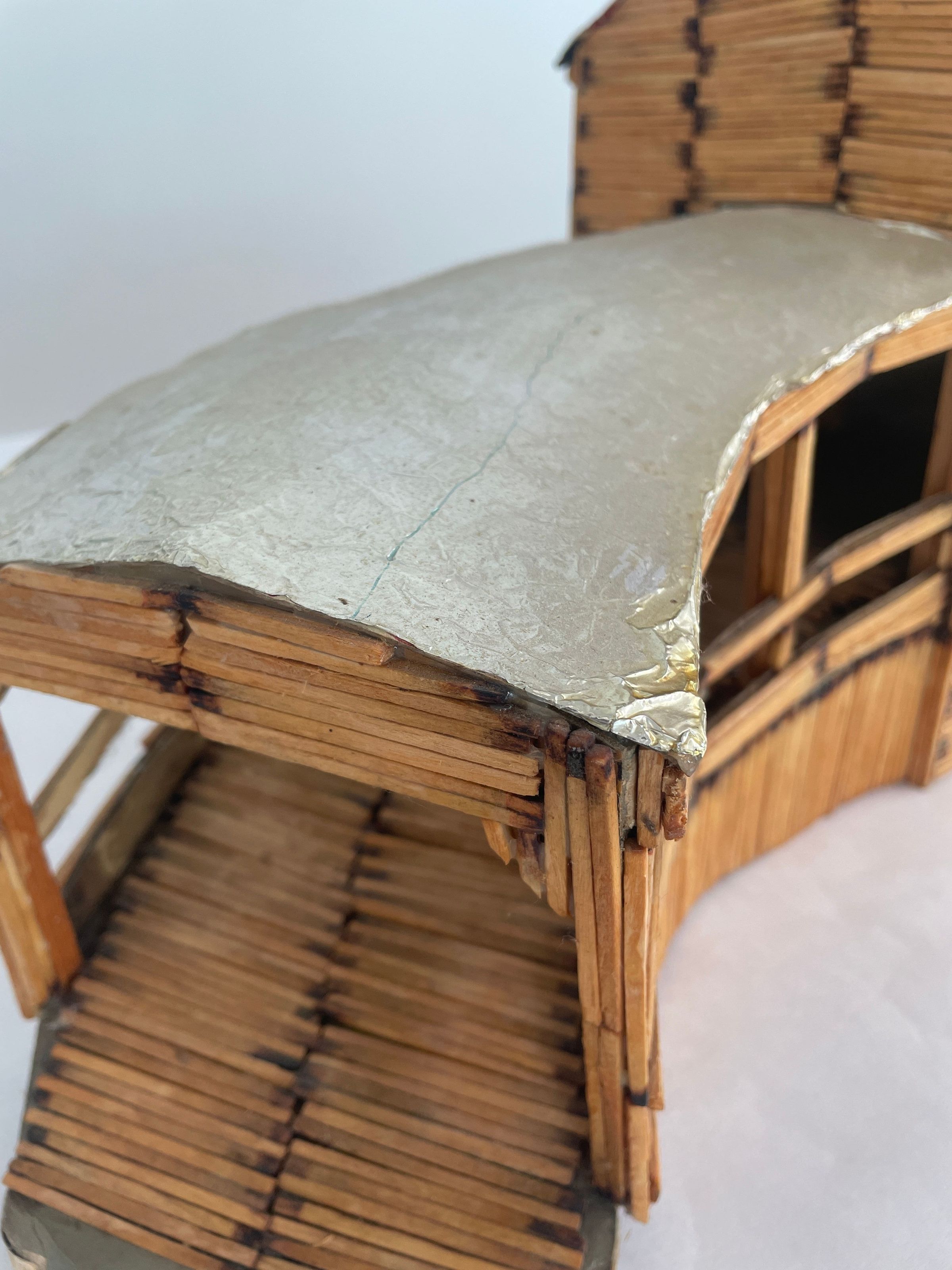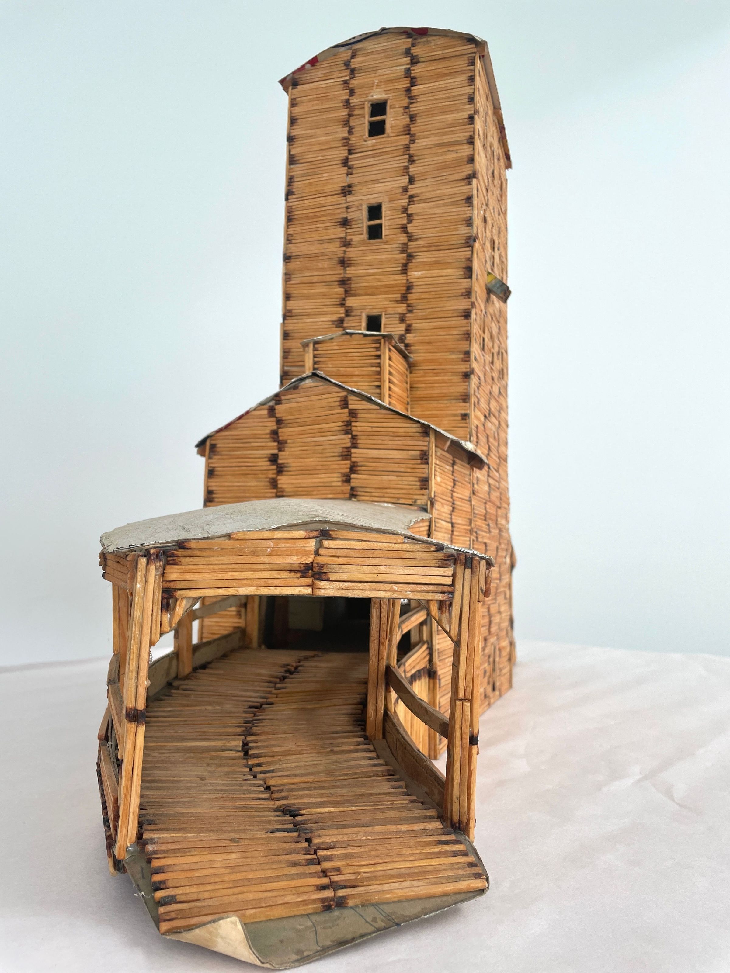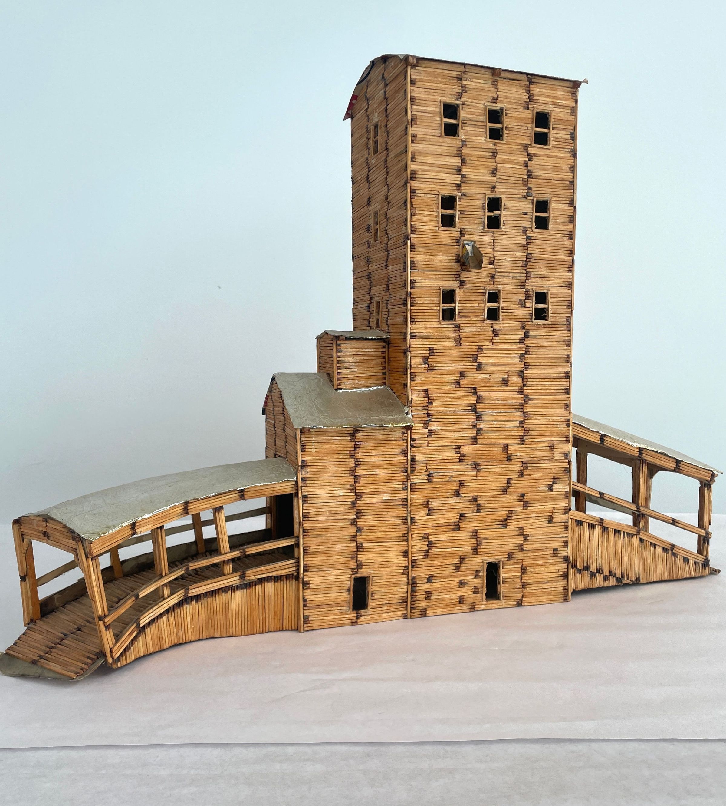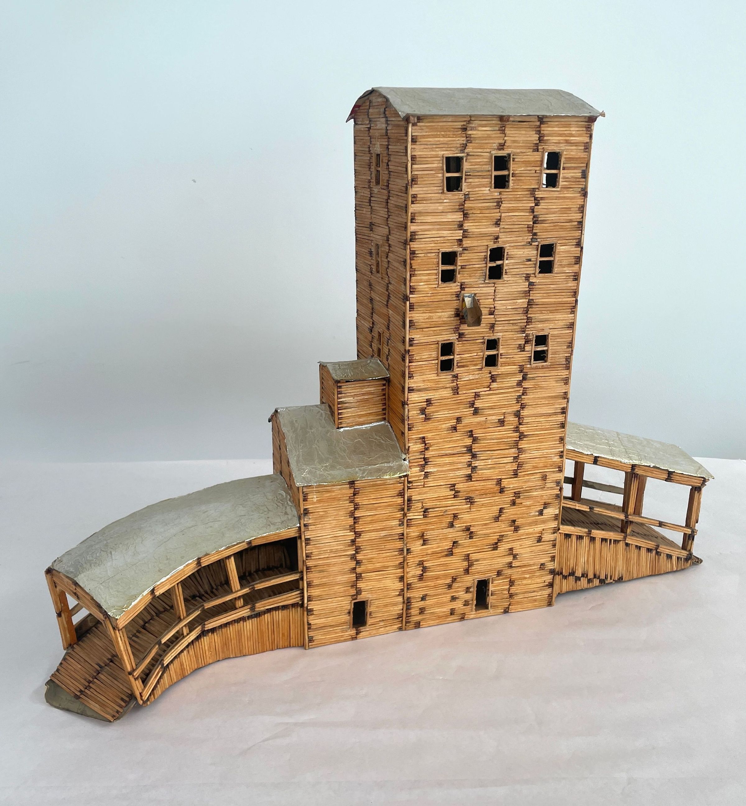 Large structure with tall square tower rising from mid-section. Low arched decks (loading) descend from either side of structure. Roofed sections are made from cardboard.Artwork Details