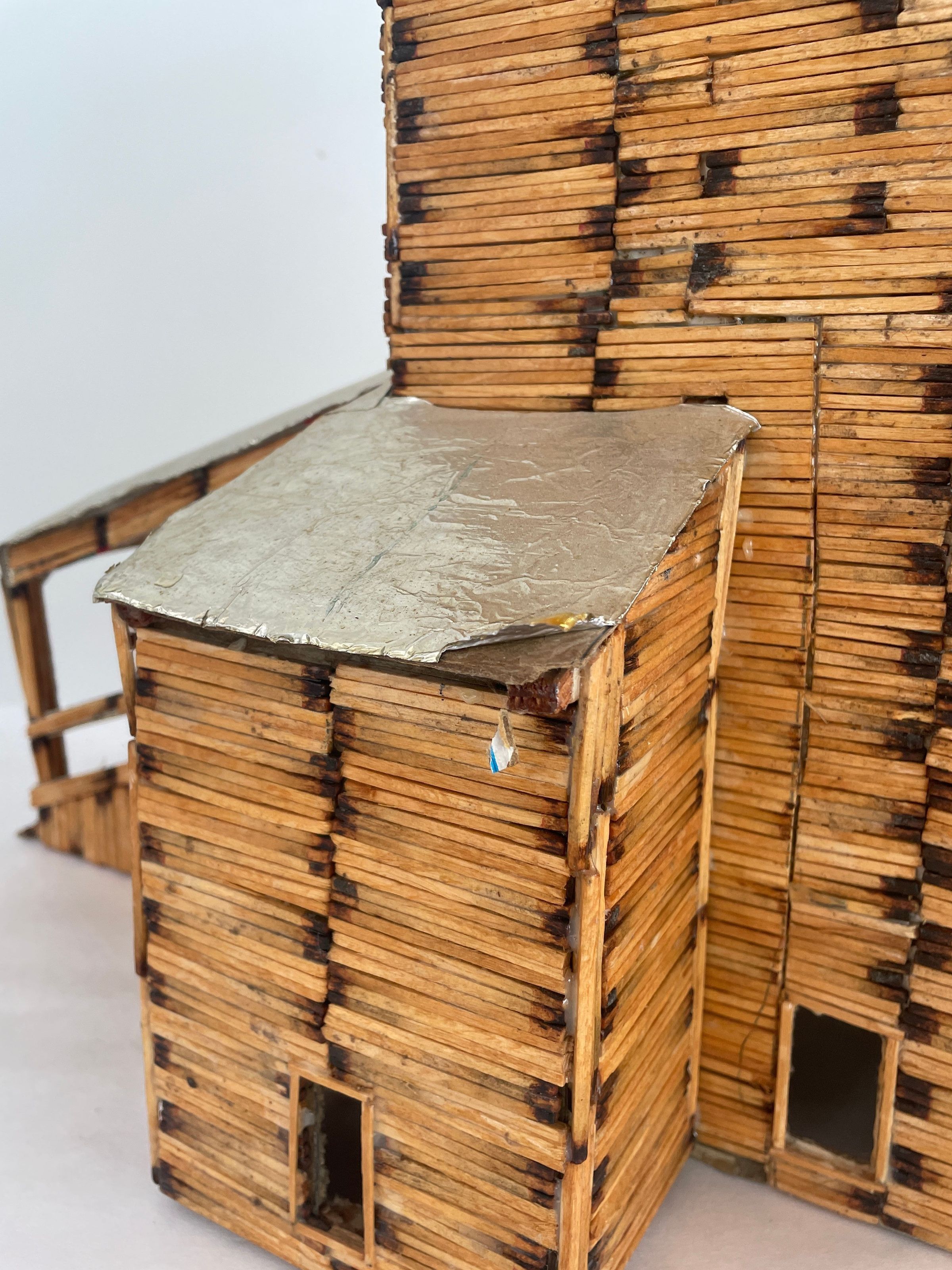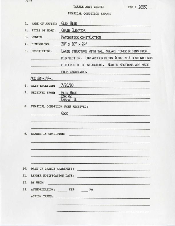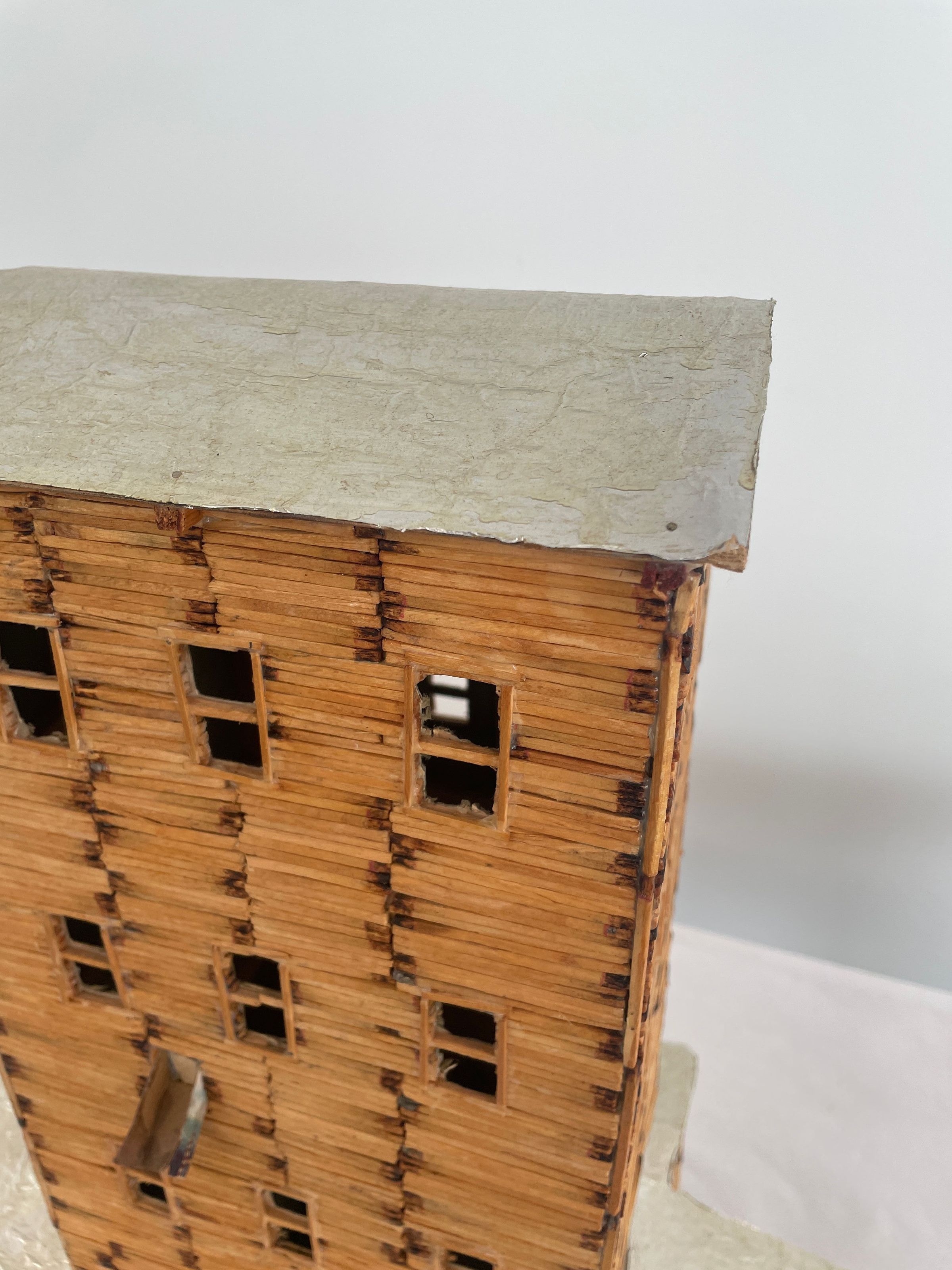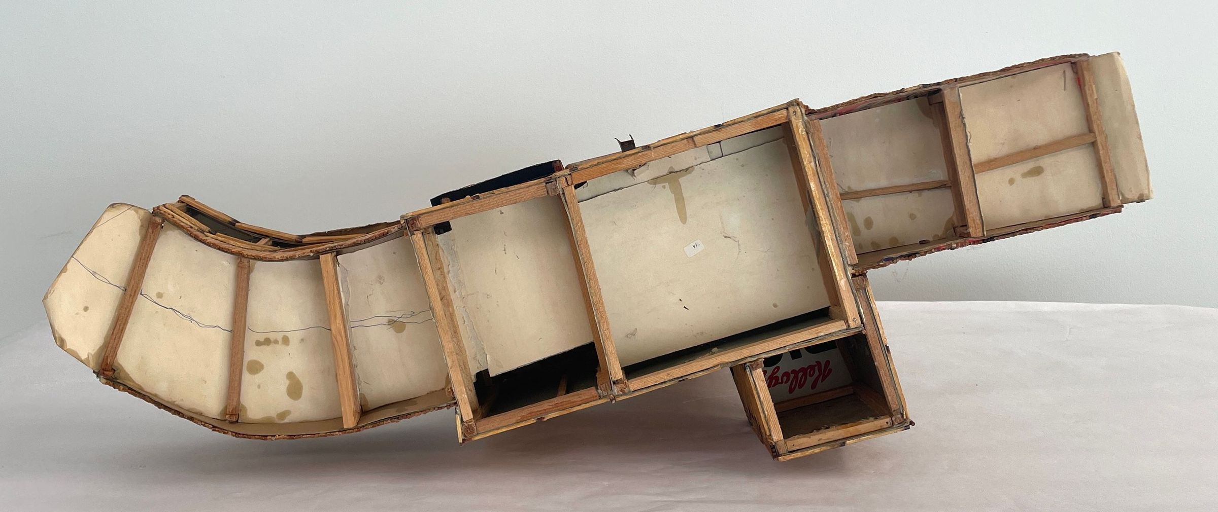 Large structure with tall square tower rising from mid-section. Low arched decks (loading) descend from either side of structure. Roofed sections are made from cardboard.Artwork Details