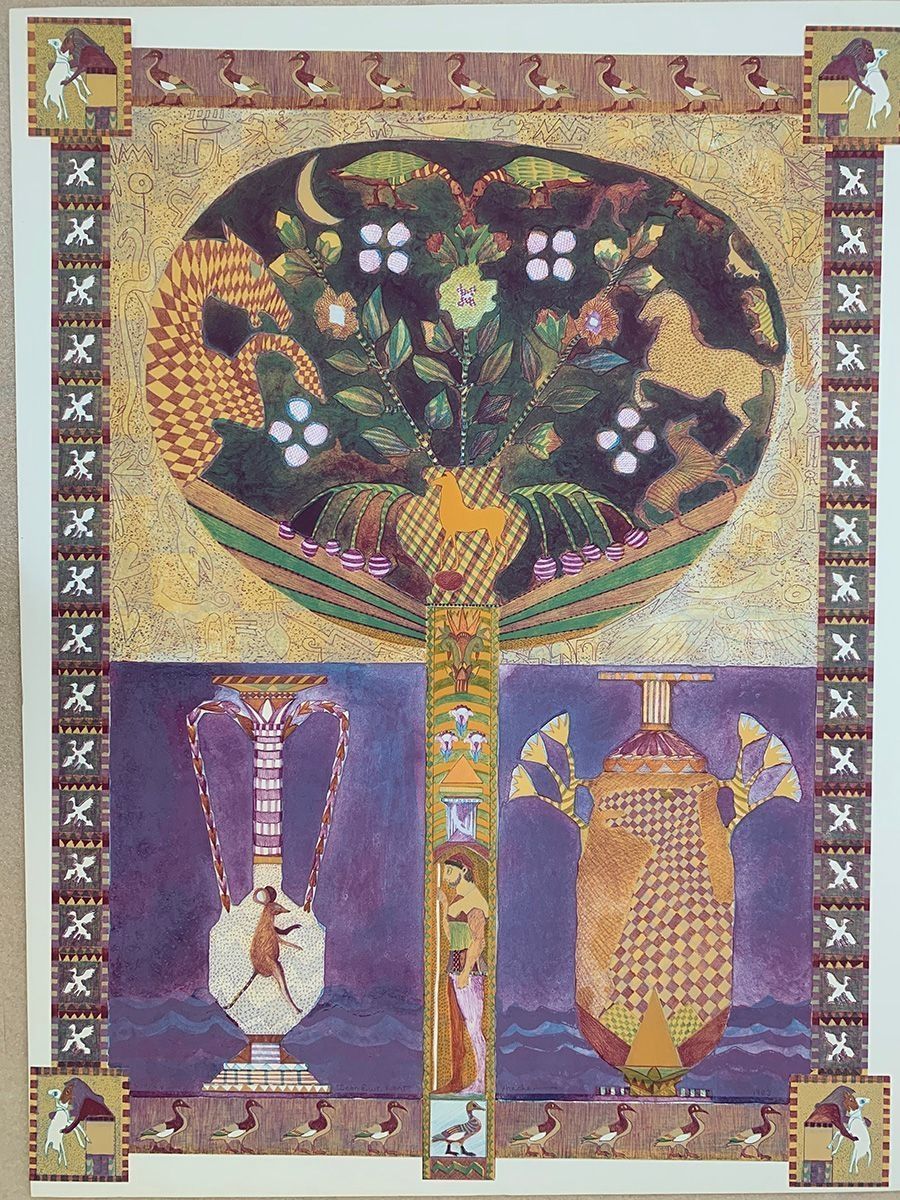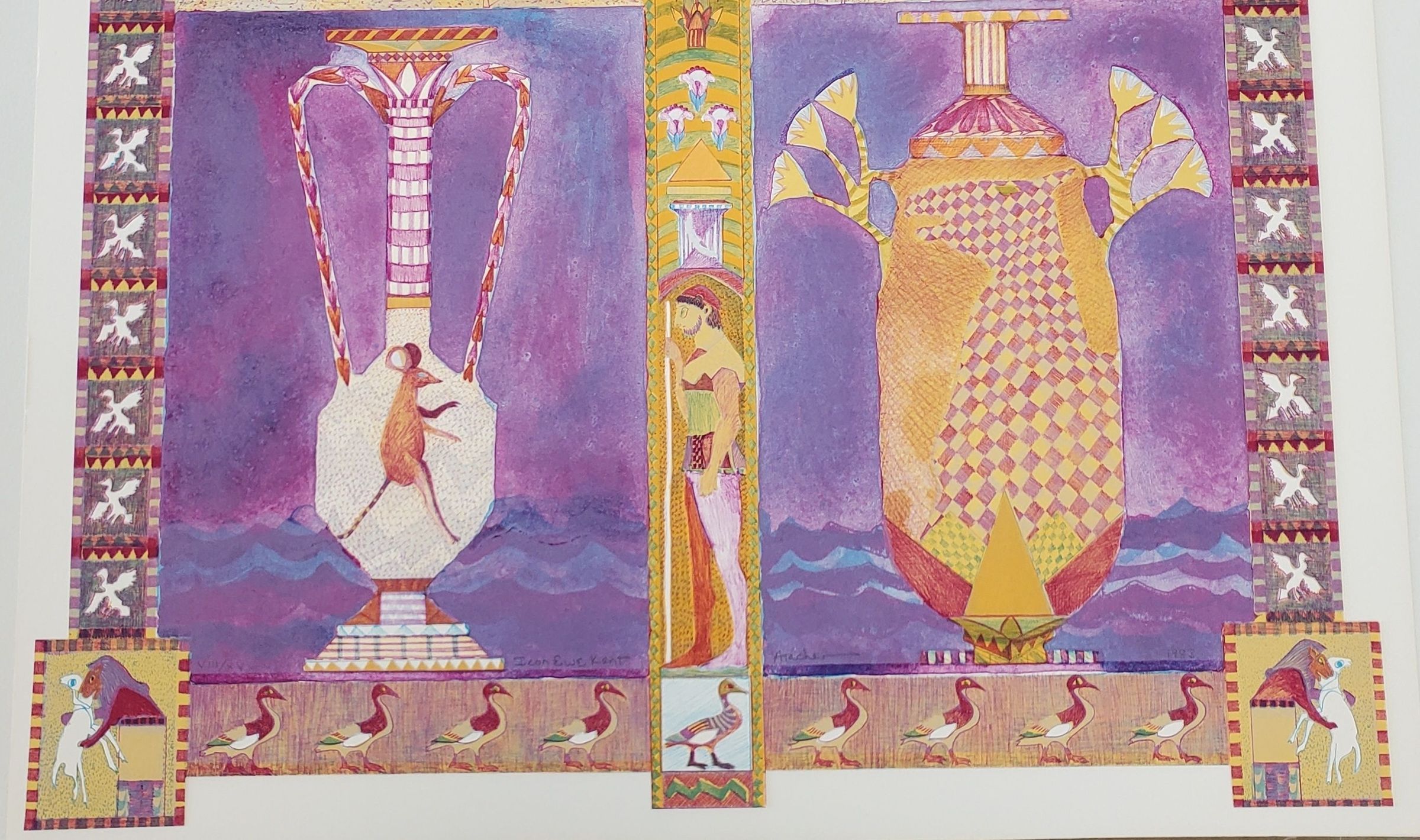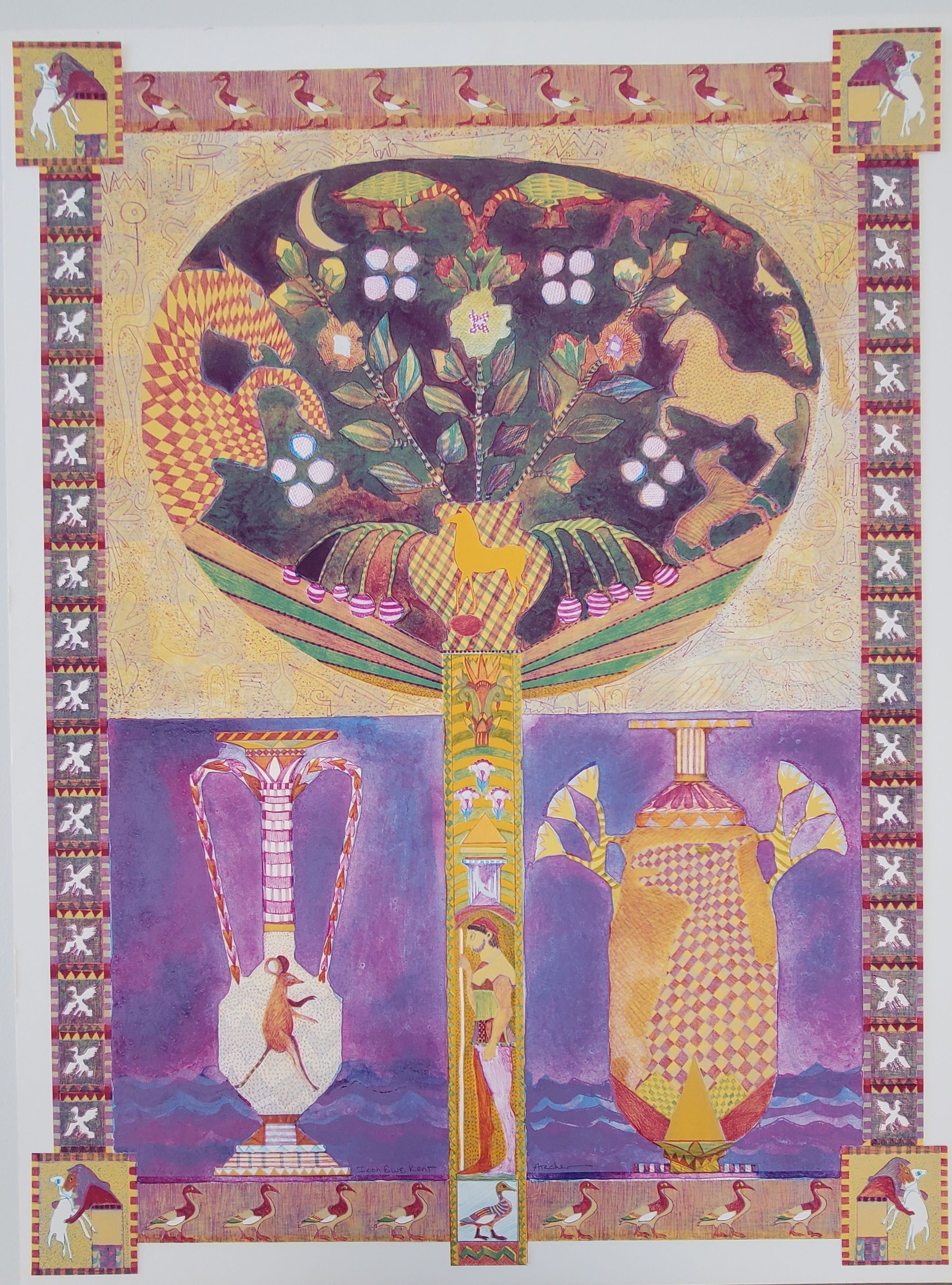 Hiroglyphic-like animals and symbols. Greek styled vase in lower half of piece with mouse in left vase. Ducks on border of print; lower left edition number "VIII/XV" lower middle signed "Icon Ewe Kant" "Archer" lower right dated "1983."Collection
