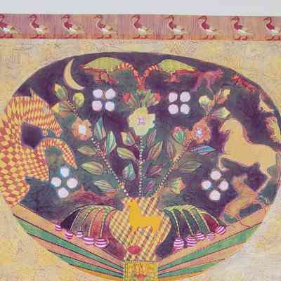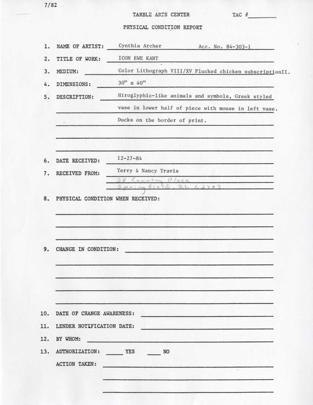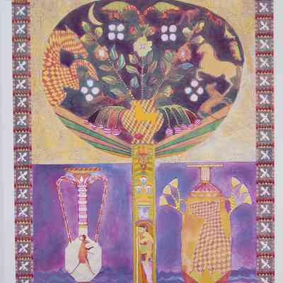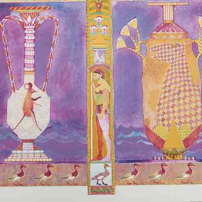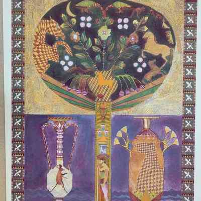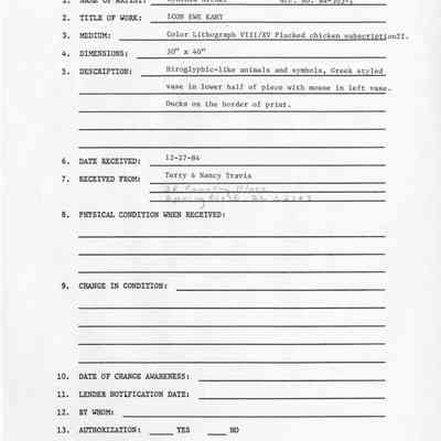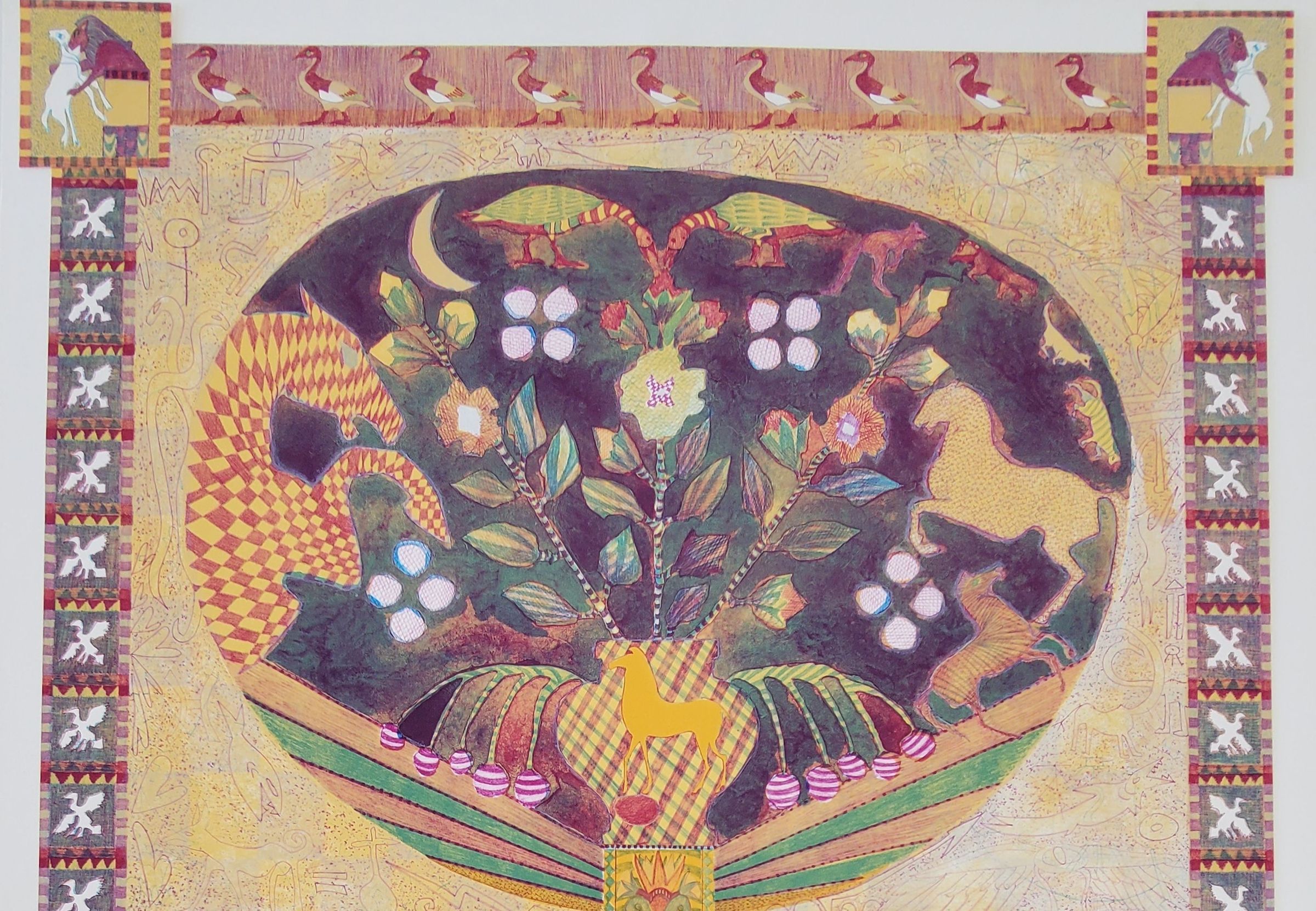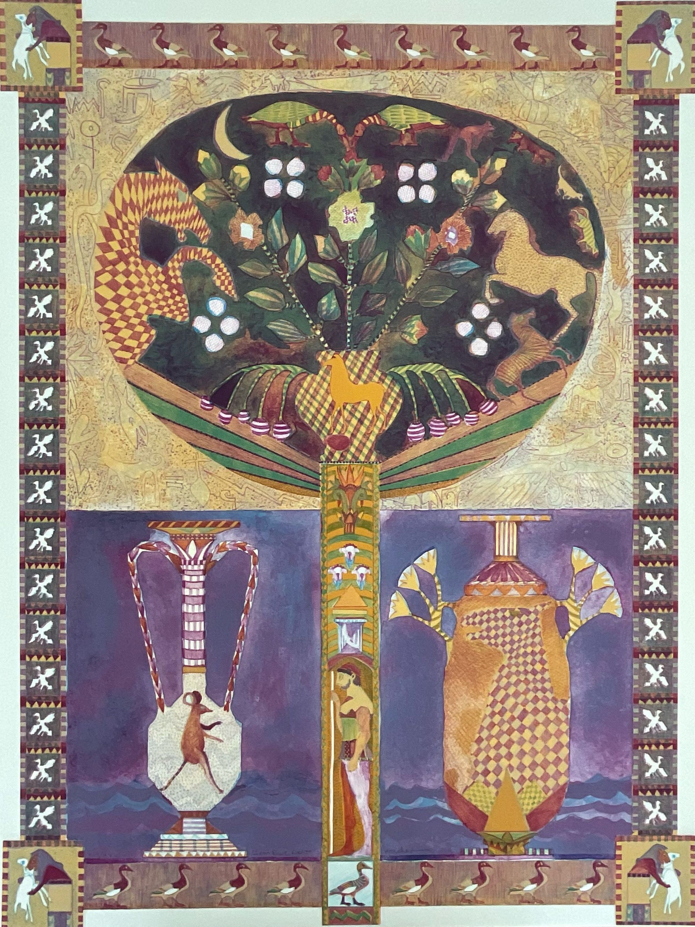Hiroglyphic-like animals and symbols. Greek styled vase in lower half of piece with mouse in left vase. Ducks on border of print; lower left edition number "VIII/XV" lower middle signed "Icon Ewe Kant" "Archer" lower right dated "1983."Collection