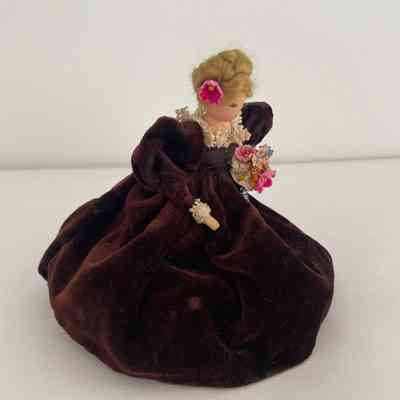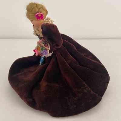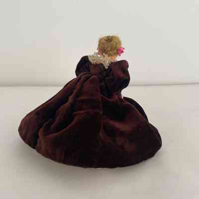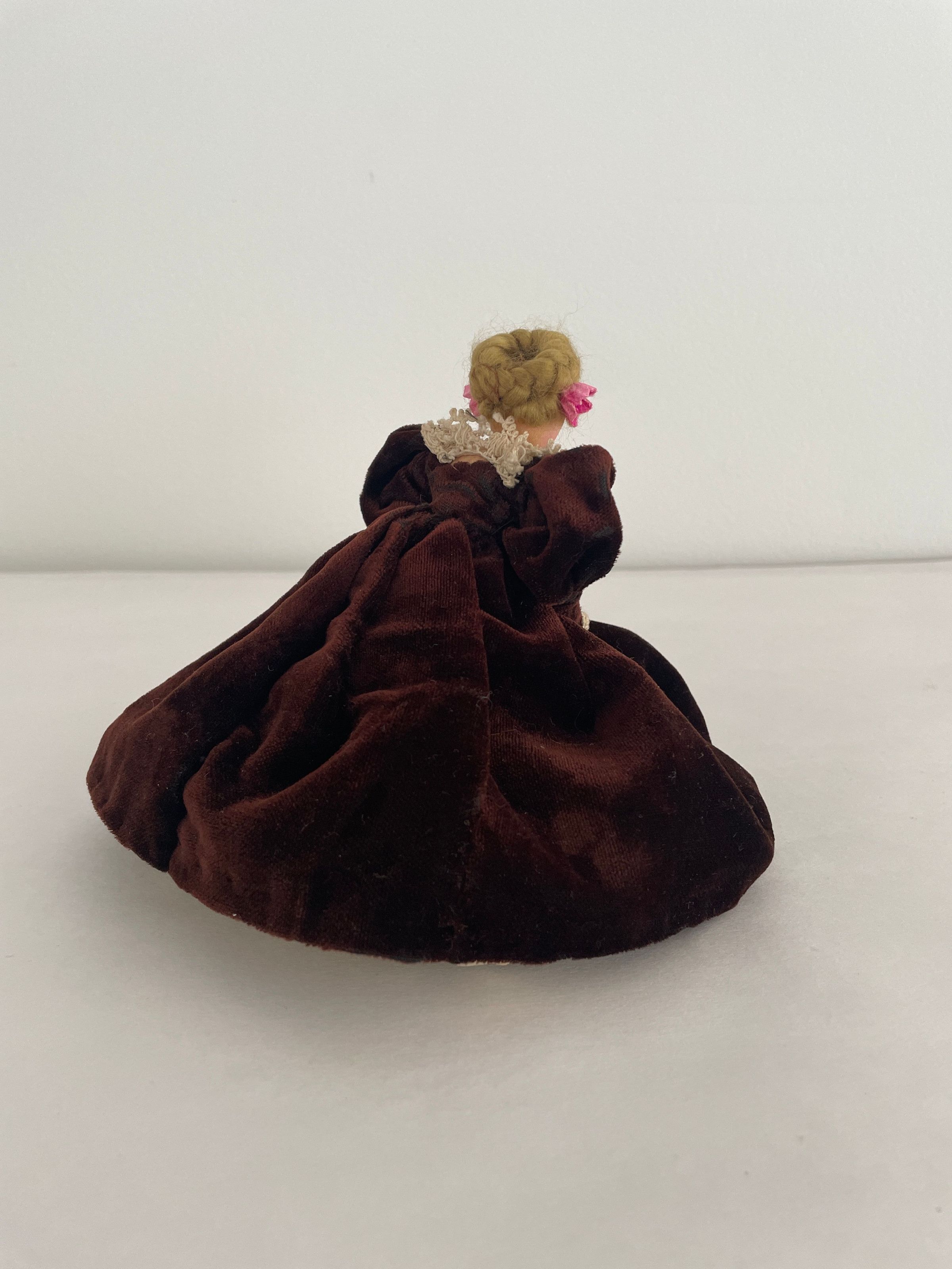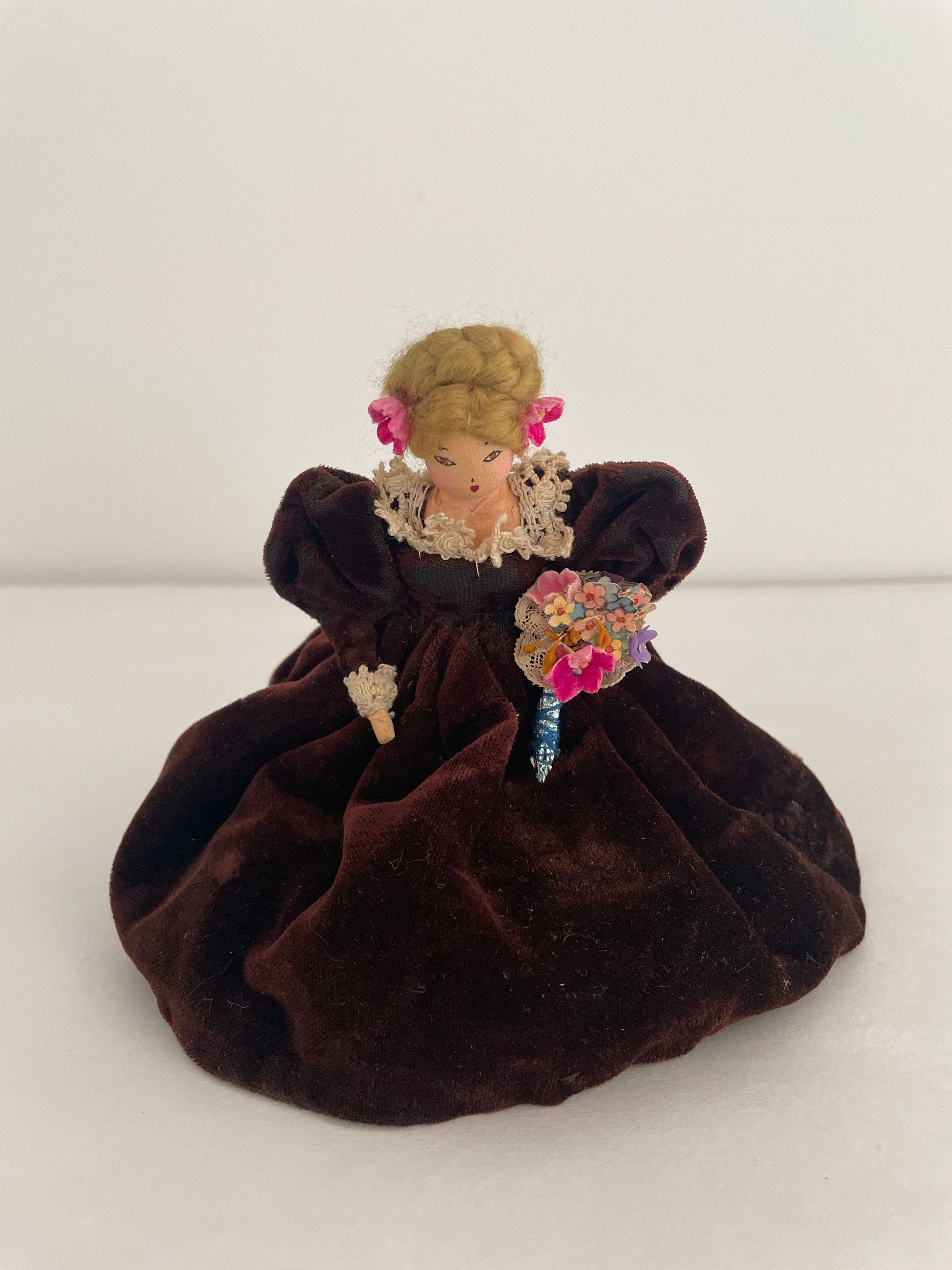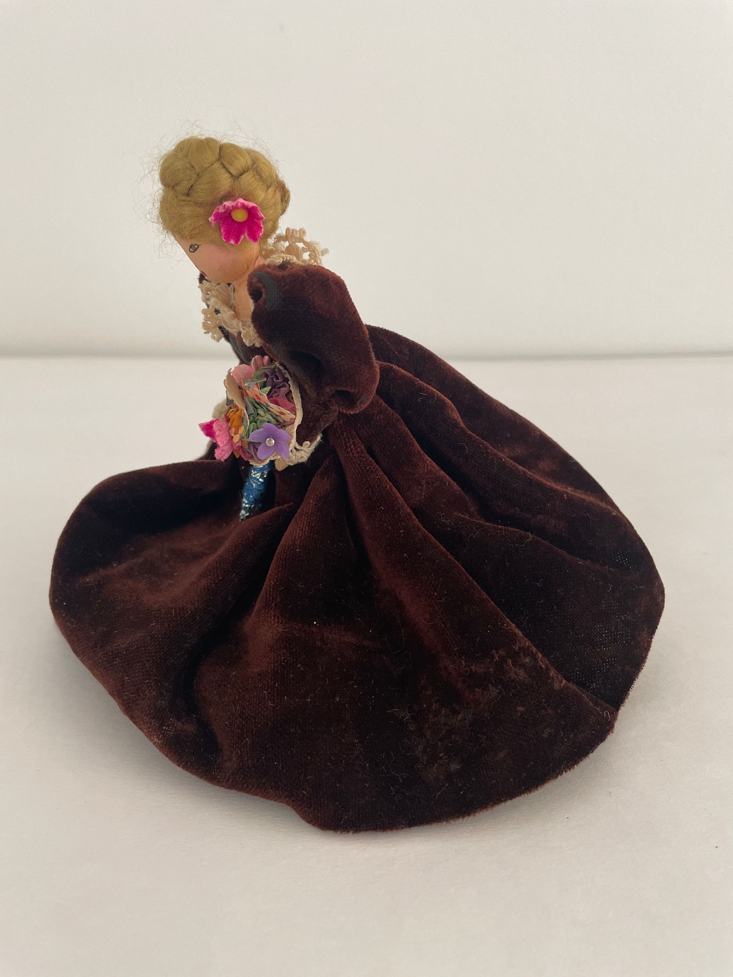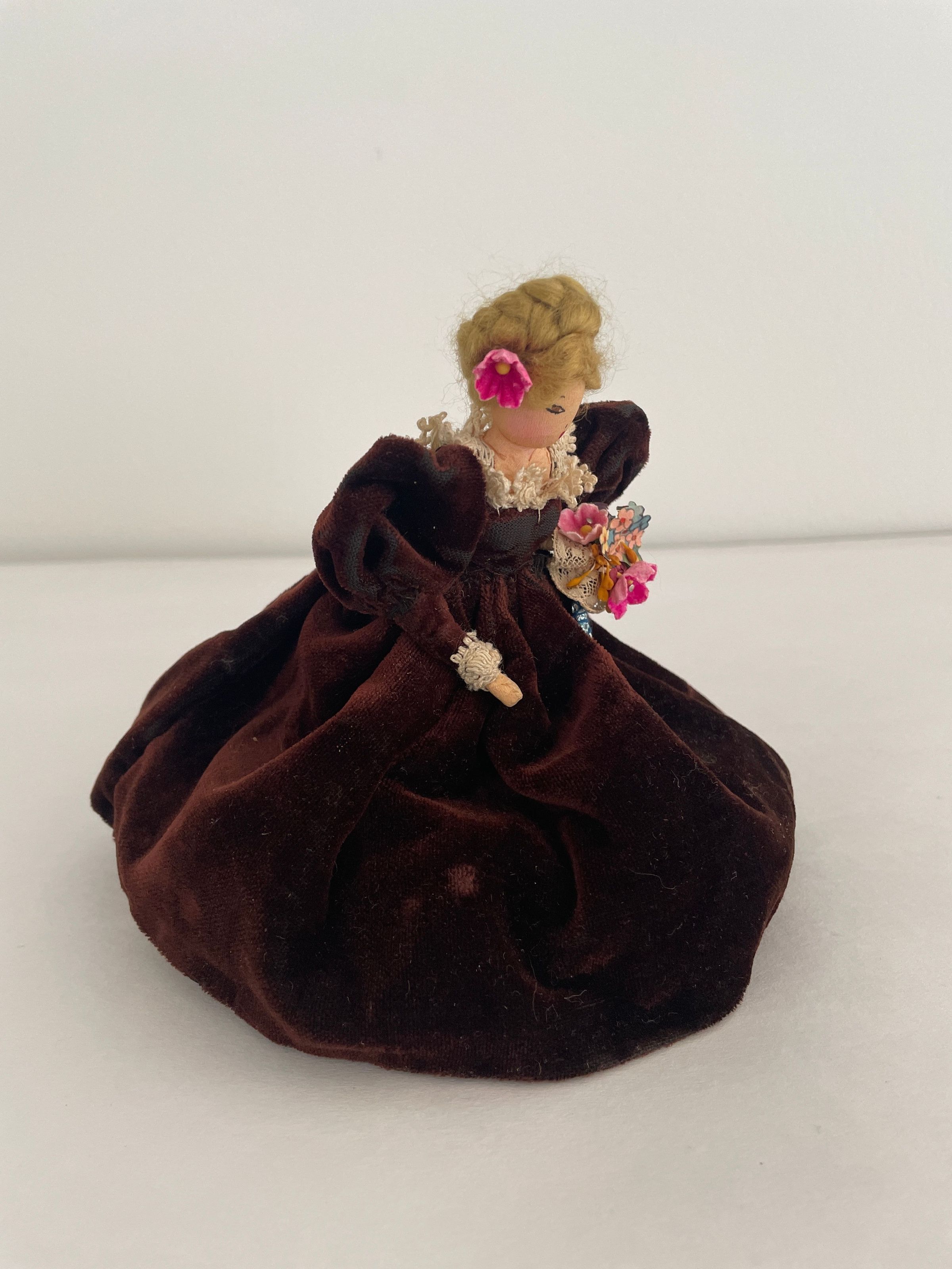 Standing position, holds bouquet of flowers in left arm. Wears dark brown velvet dress accented at scooped neckline and cuffs with cream lace. Puffed sleeves, hooped bottom, light brown hair with pink flowers on either side.Collection
