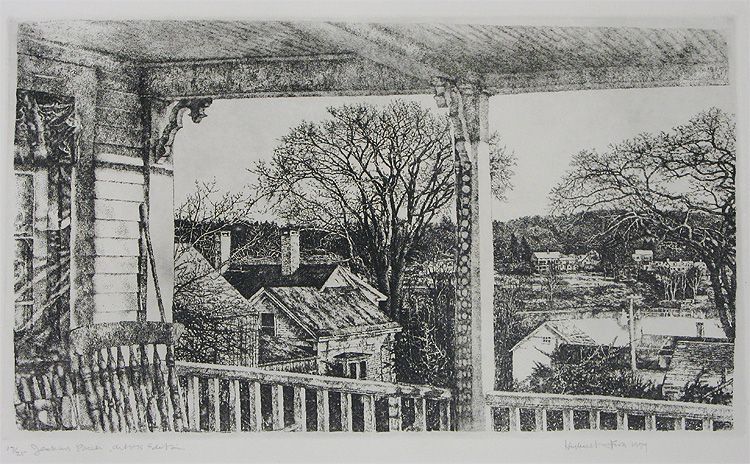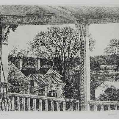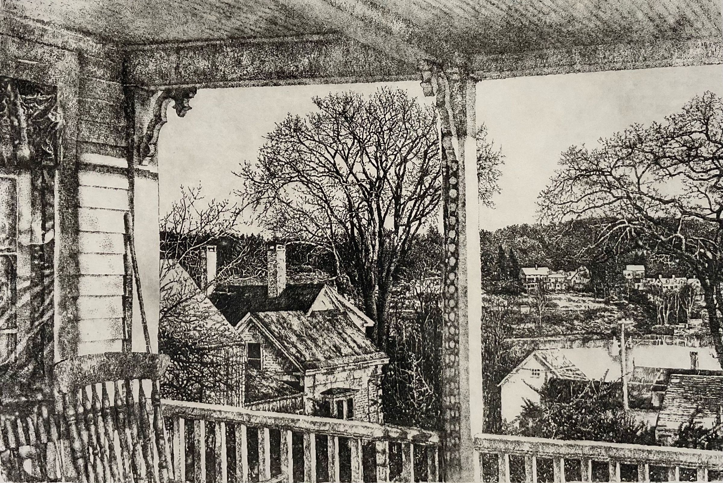 Black and white. Rural landscape of mid-western town framed by the "porch". Weathered boarded houses & Winter trees looks like early morning or twilight realist.Collection
