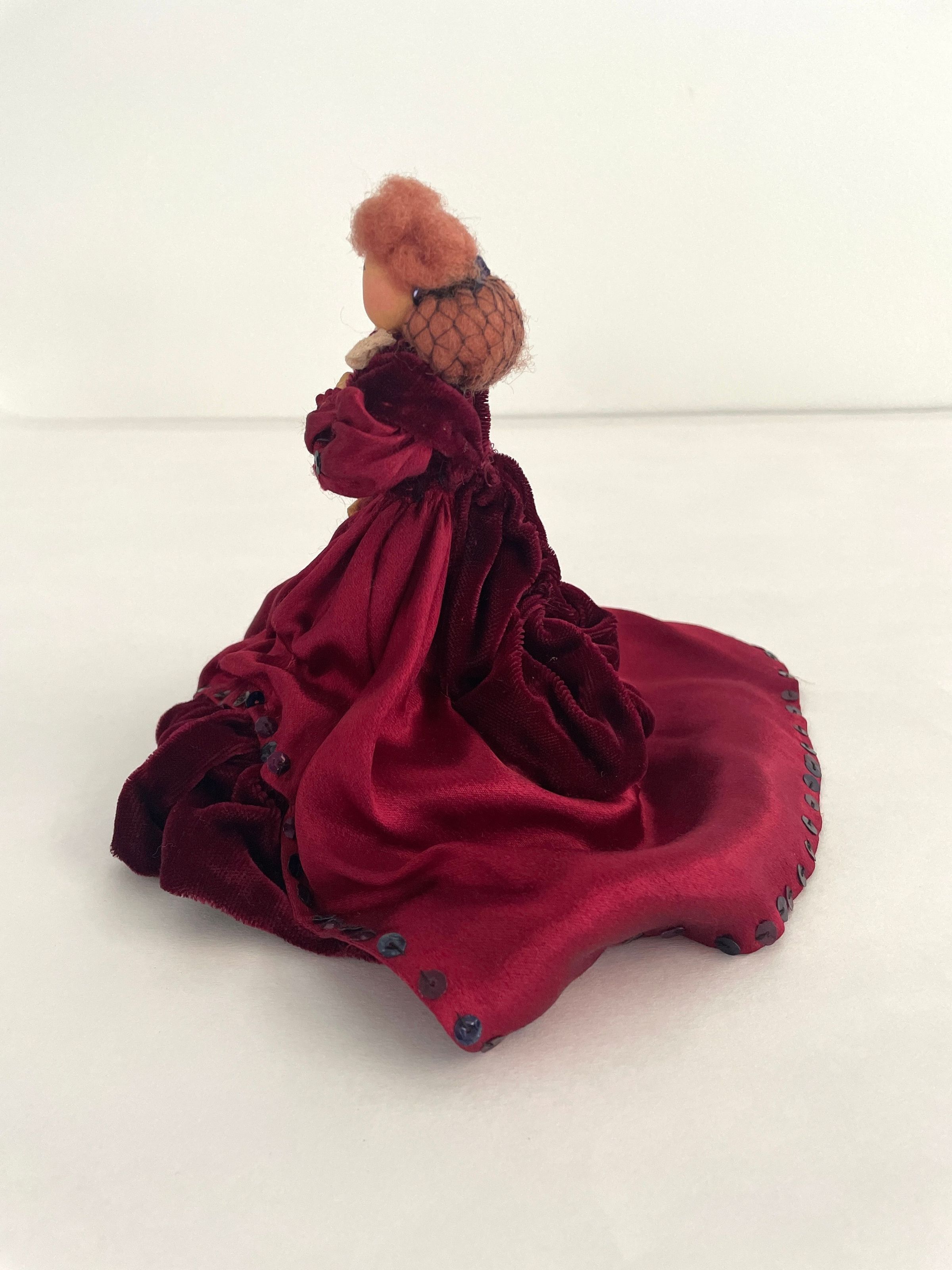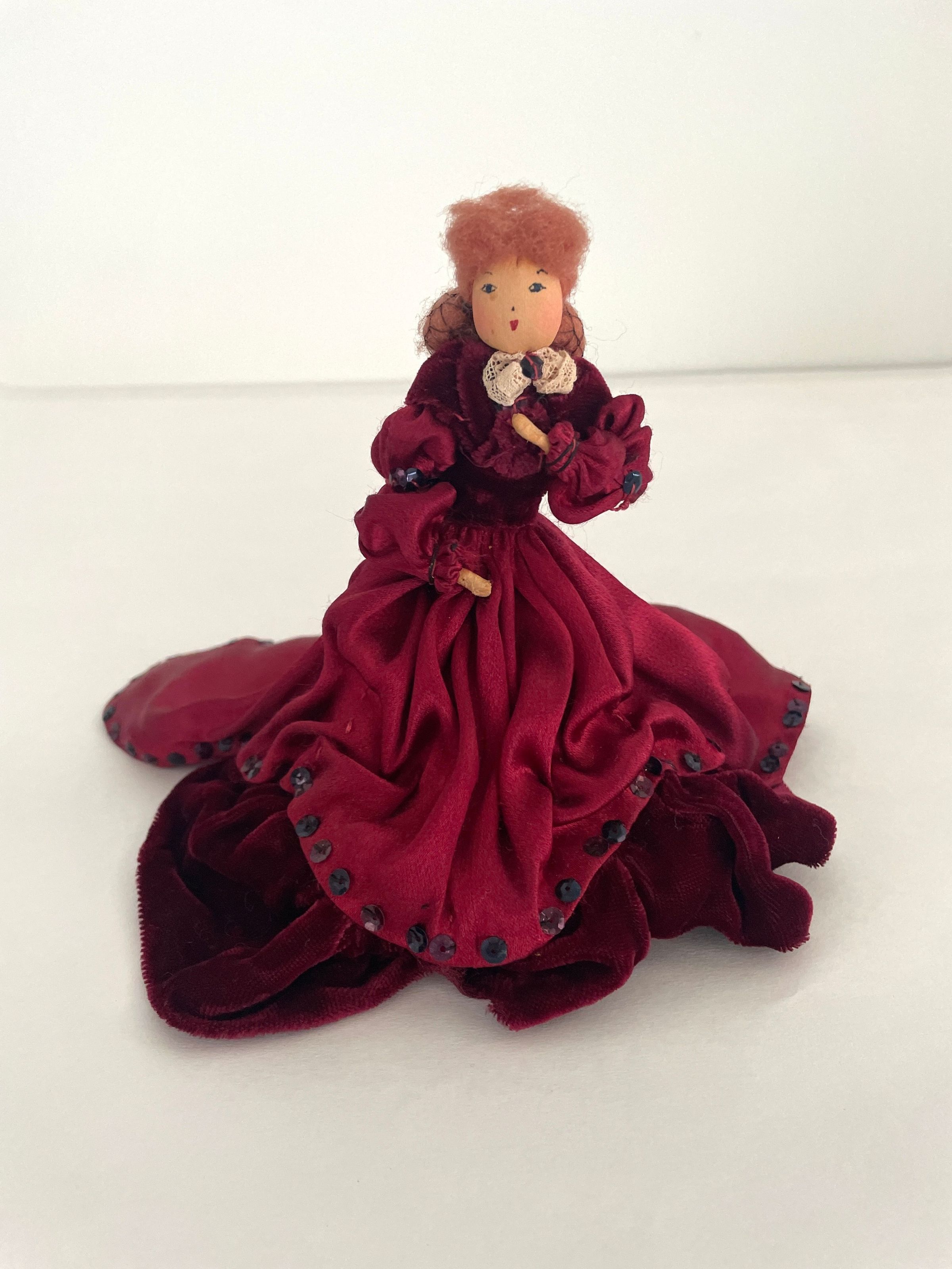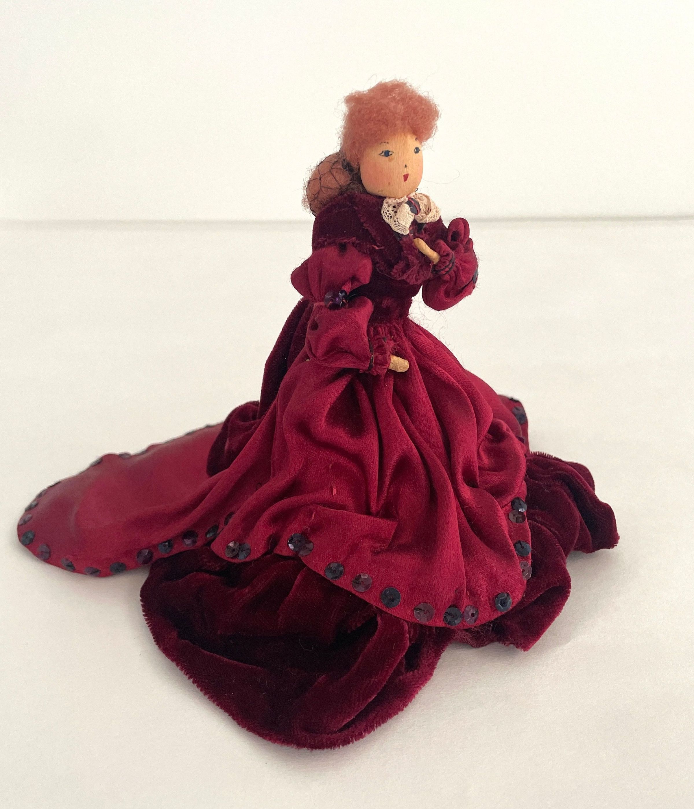 Standing position, left hand on chest, wears wine satin dress with wine velvet peplum, bottom tier and shawl, train in back. Sequins edge bottom of dress and train. Leg-of mutton sleeves. White lace at collar. Brown hair caught it back with netting.Collection