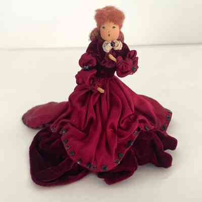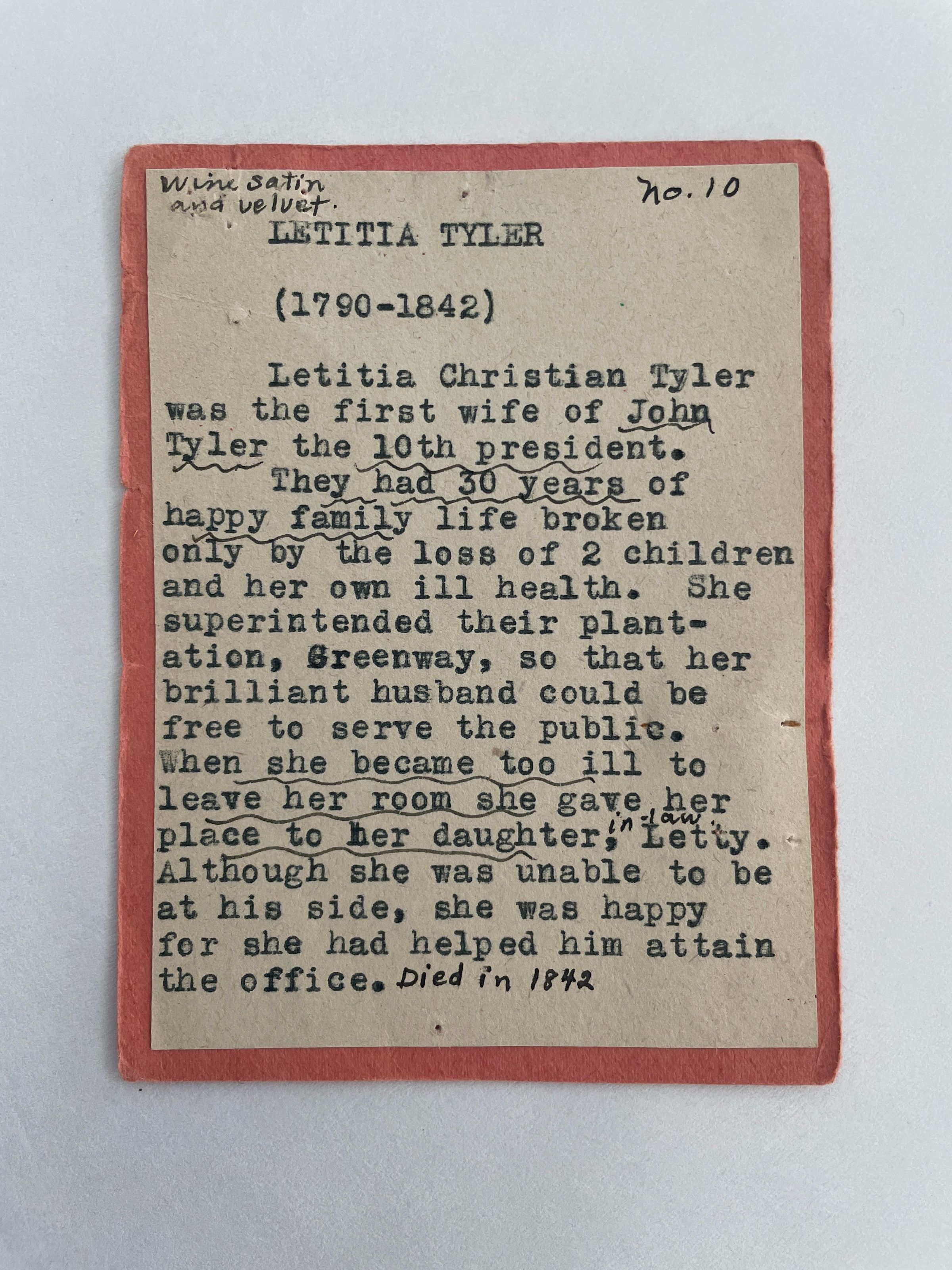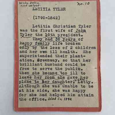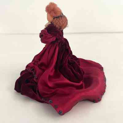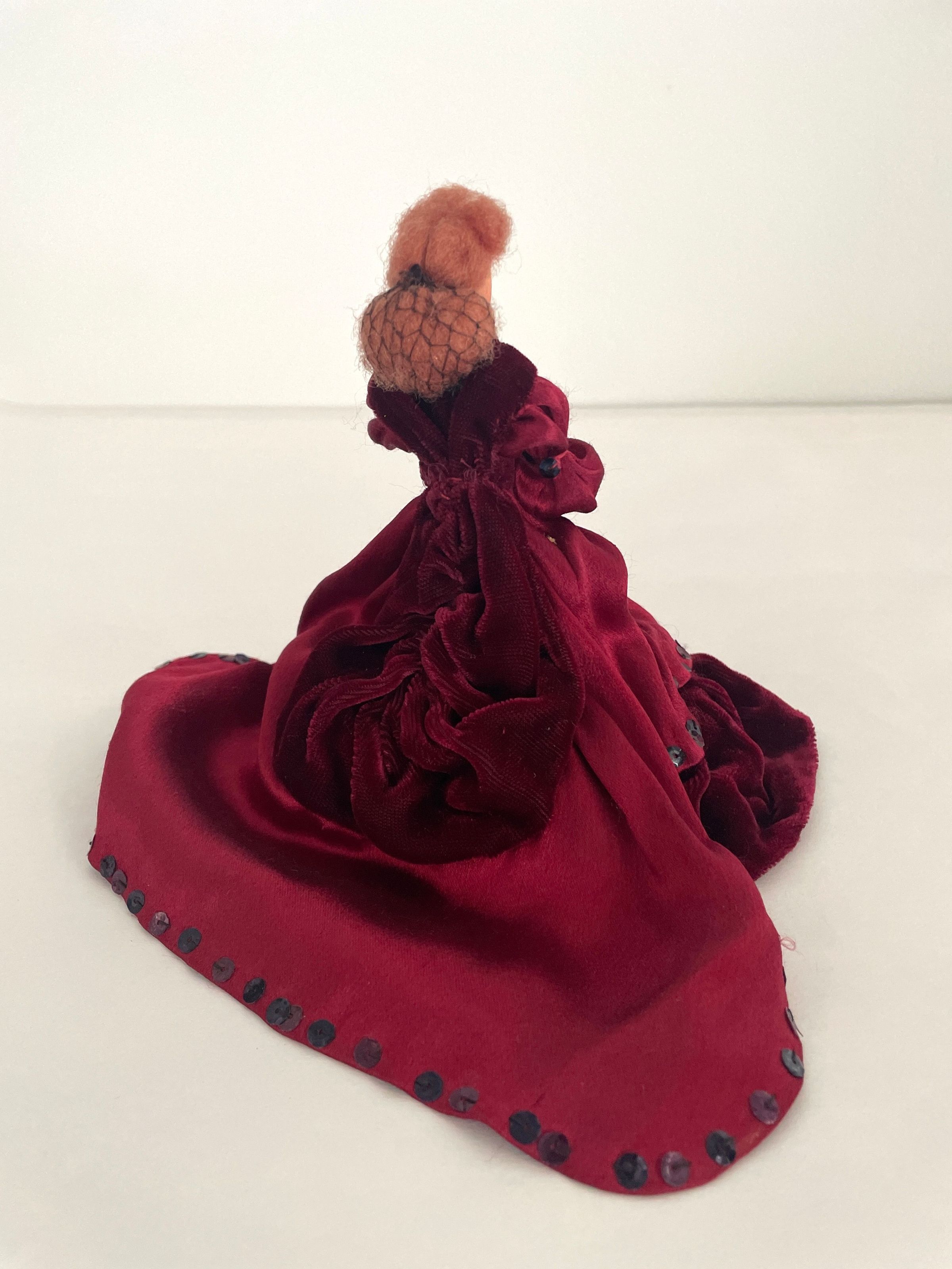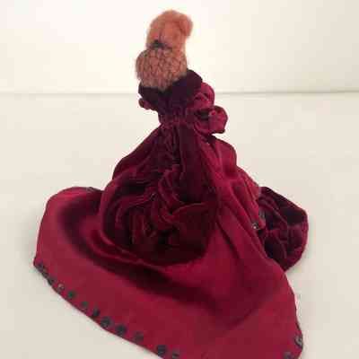 Standing position, left hand on chest, wears wine satin dress with wine velvet peplum, bottom tier and shawl, train in back. Sequins edge bottom of dress and train. Leg-of mutton sleeves. White lace at collar. Brown hair caught it back with netting.Collection