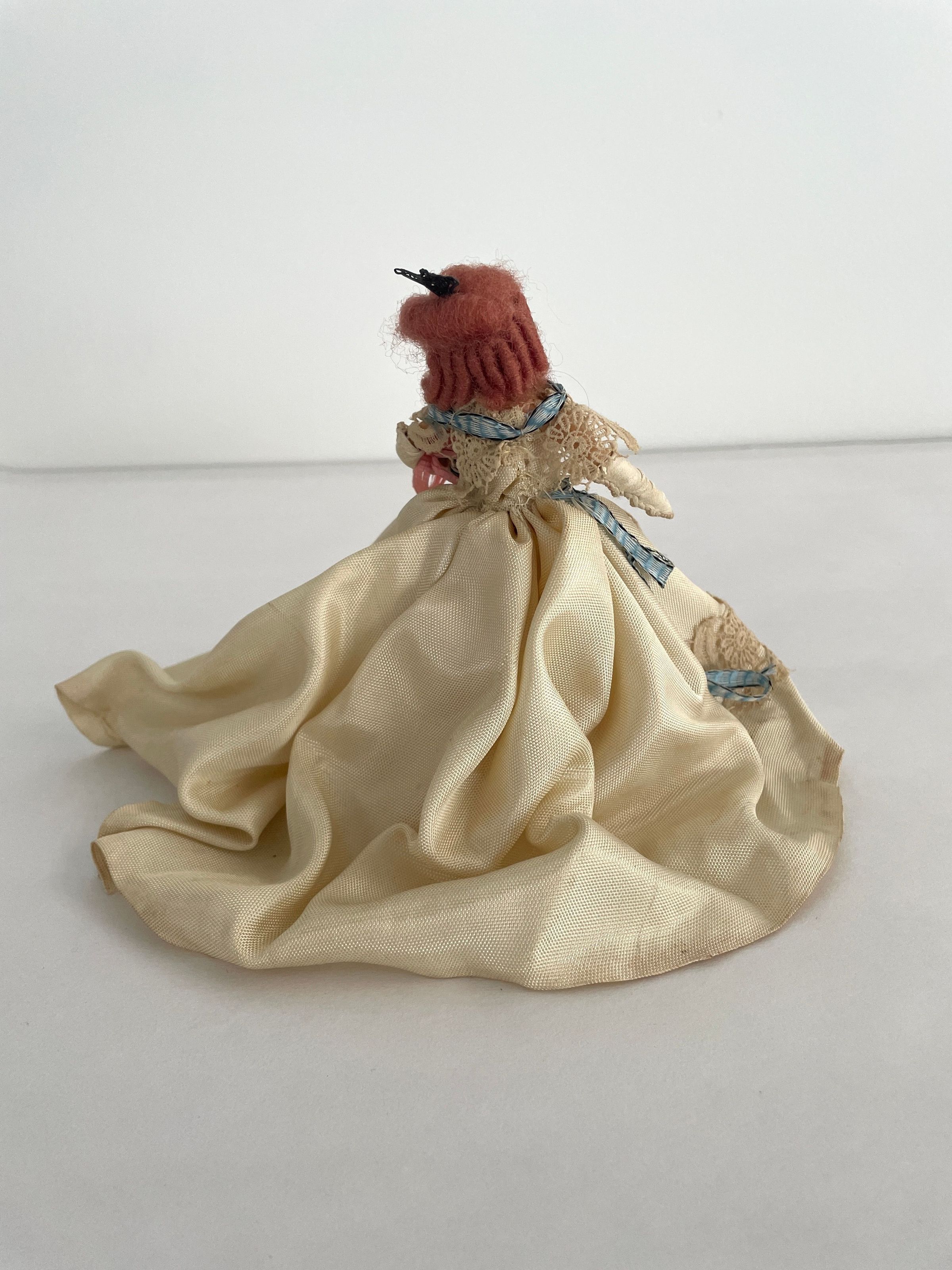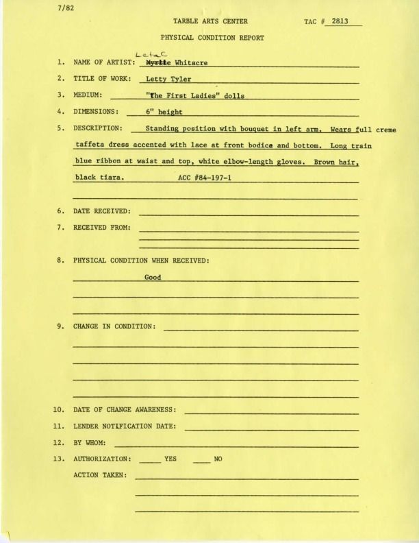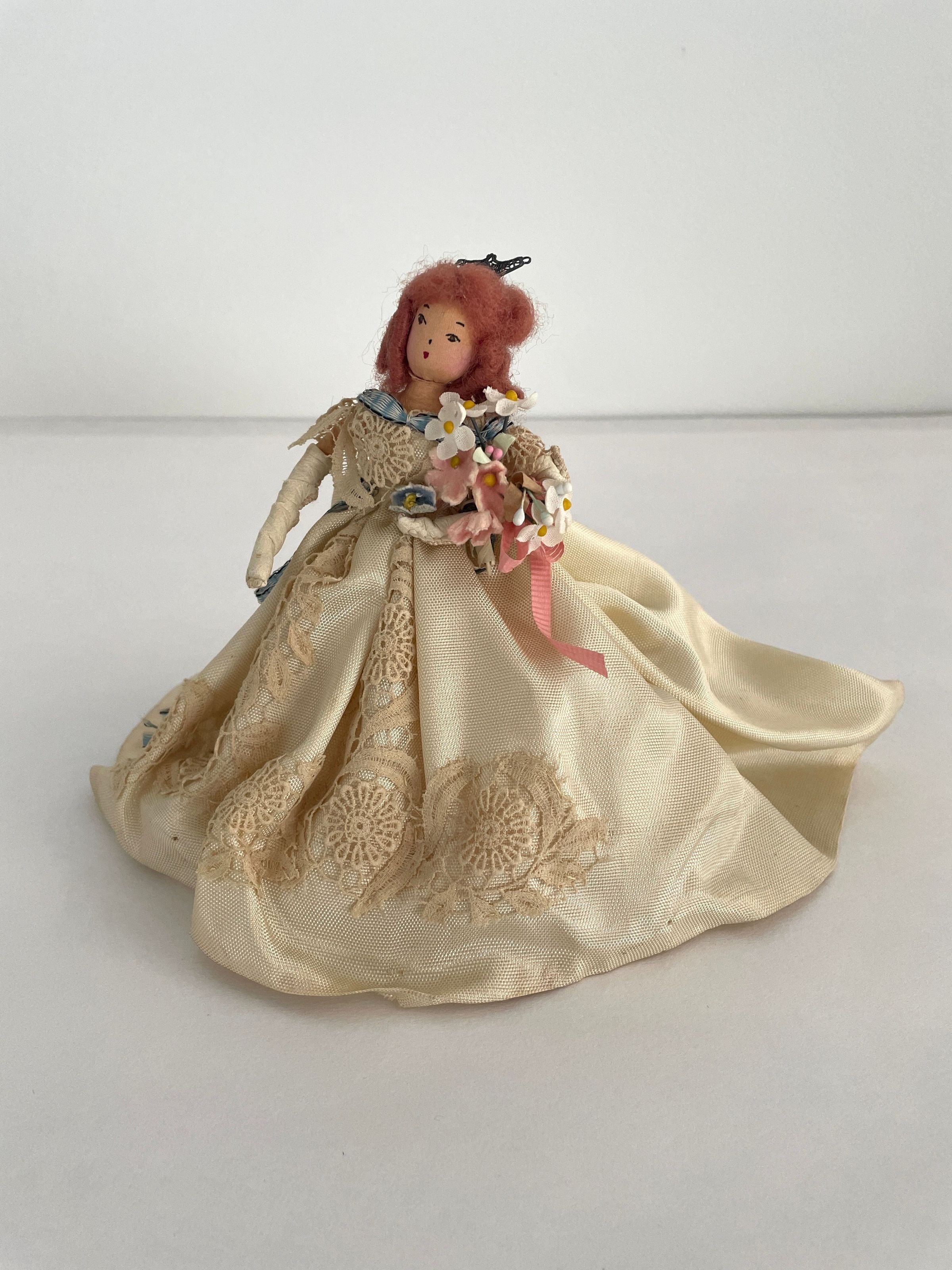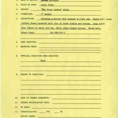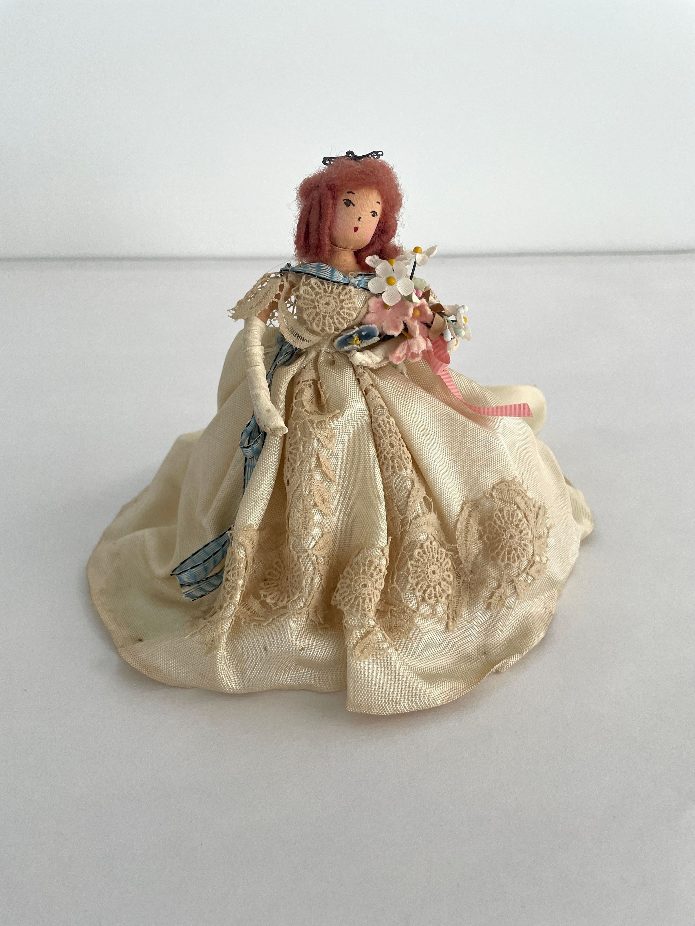 Standing position with bouquet in left arm. Wears full creme taffeta dress accented with lace at front bodice and bottom. Long train blue ribbon at waist and top white elbow-length gloves. Brown hair, black tiara.Collection