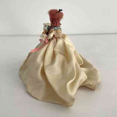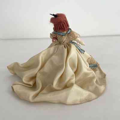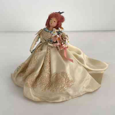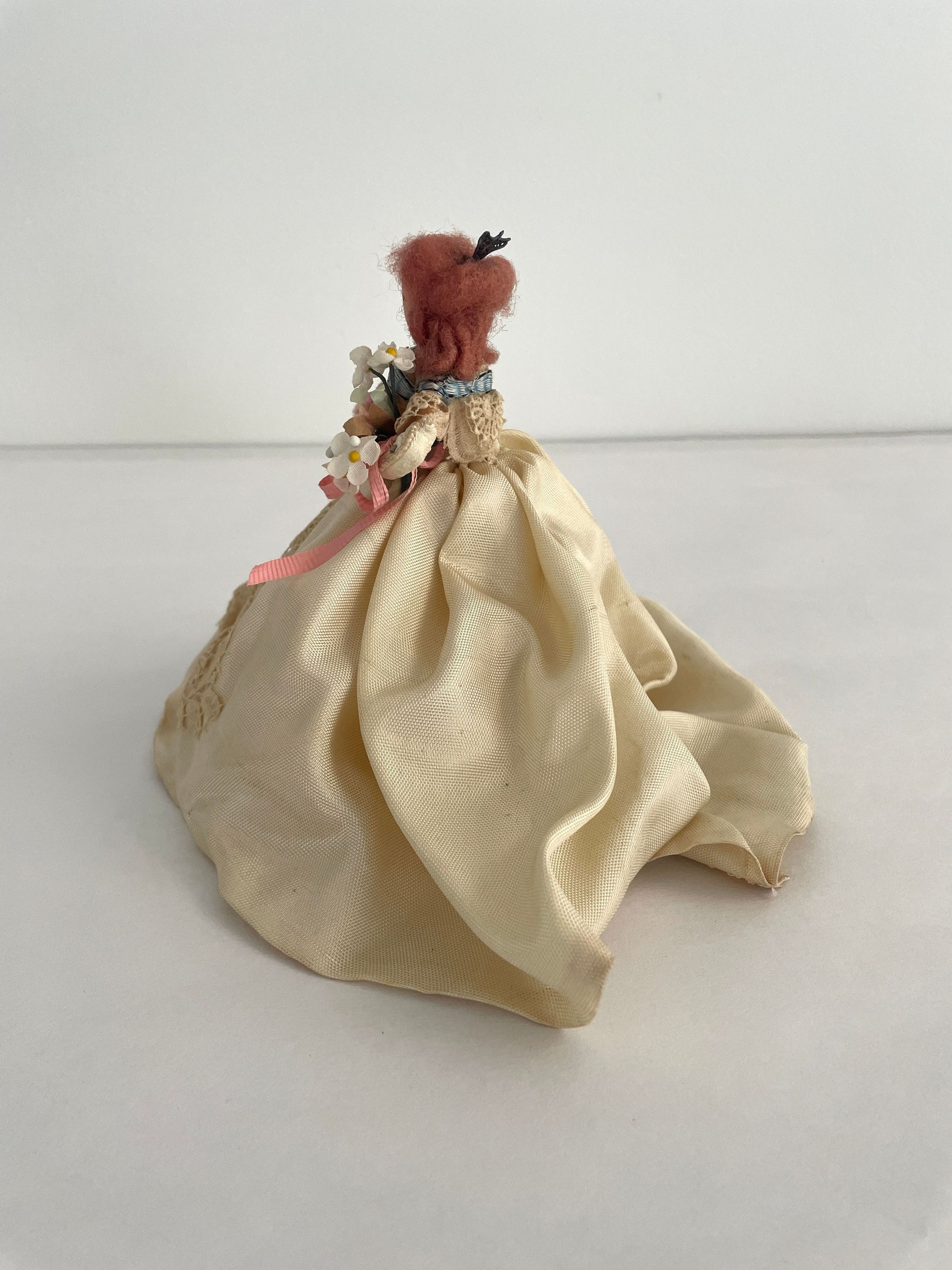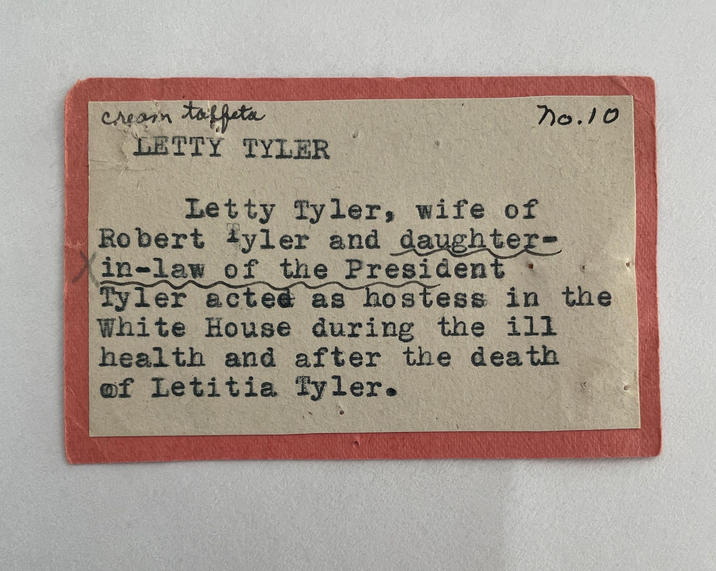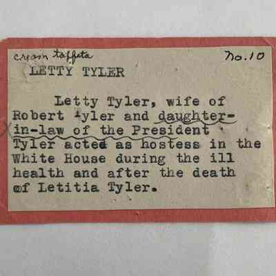 Standing position with bouquet in left arm. Wears full creme taffeta dress accented with lace at front bodice and bottom. Long train blue ribbon at waist and top white elbow-length gloves. Brown hair, black tiara.Collection