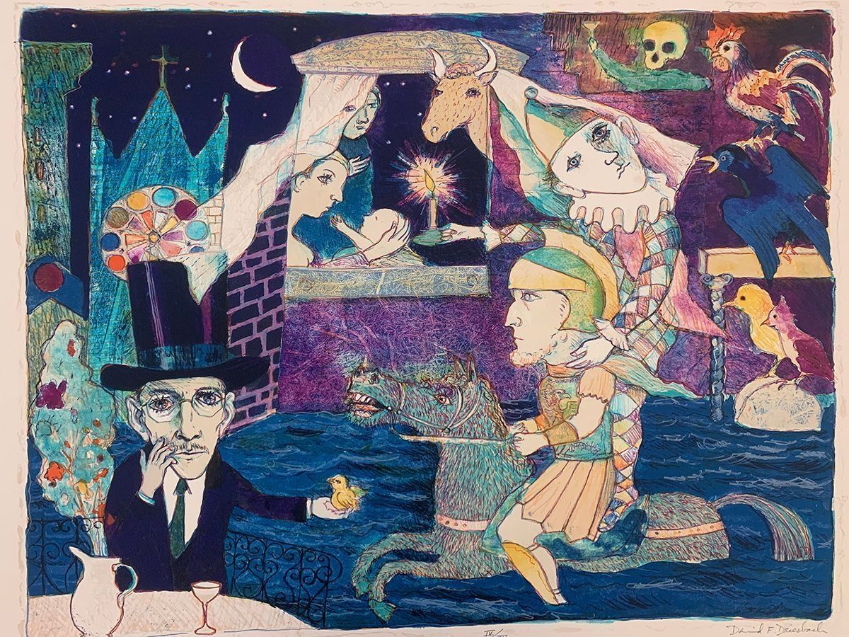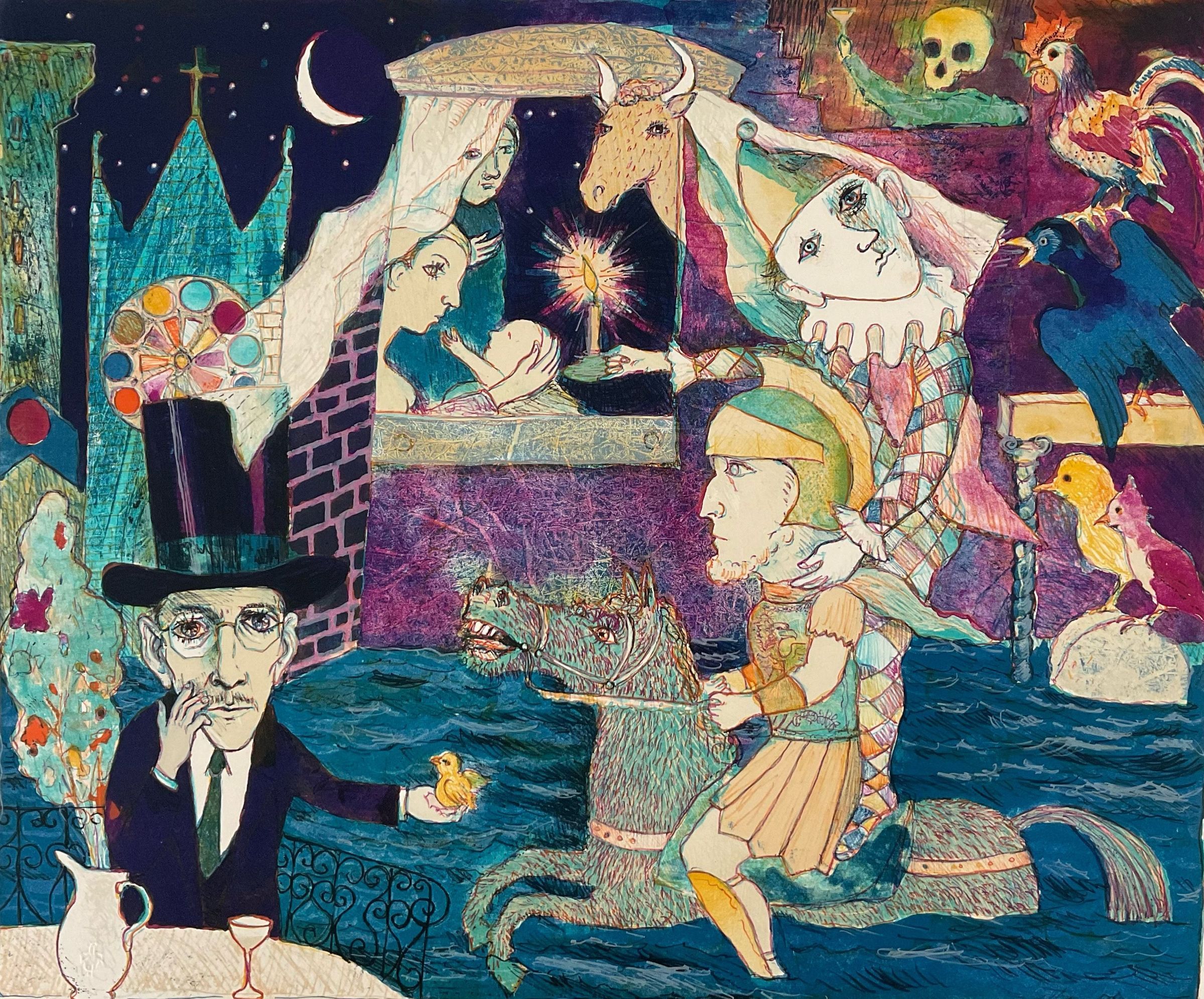 Man in black suit with black top hat, Harlequin, Roman soldier. Bright colors.Collection
