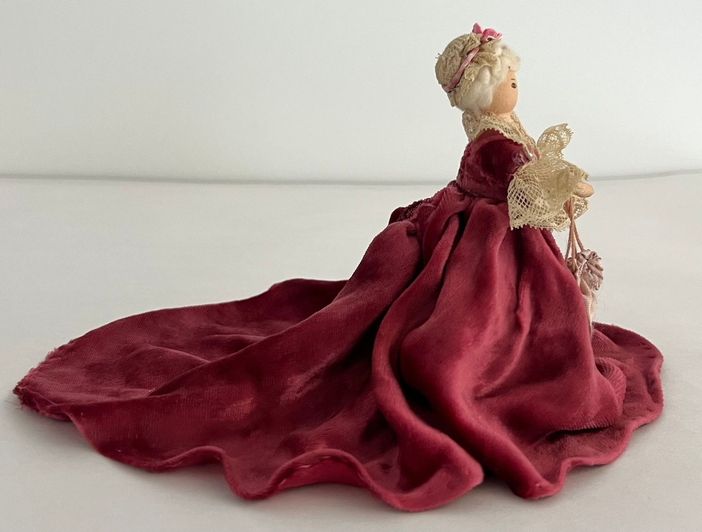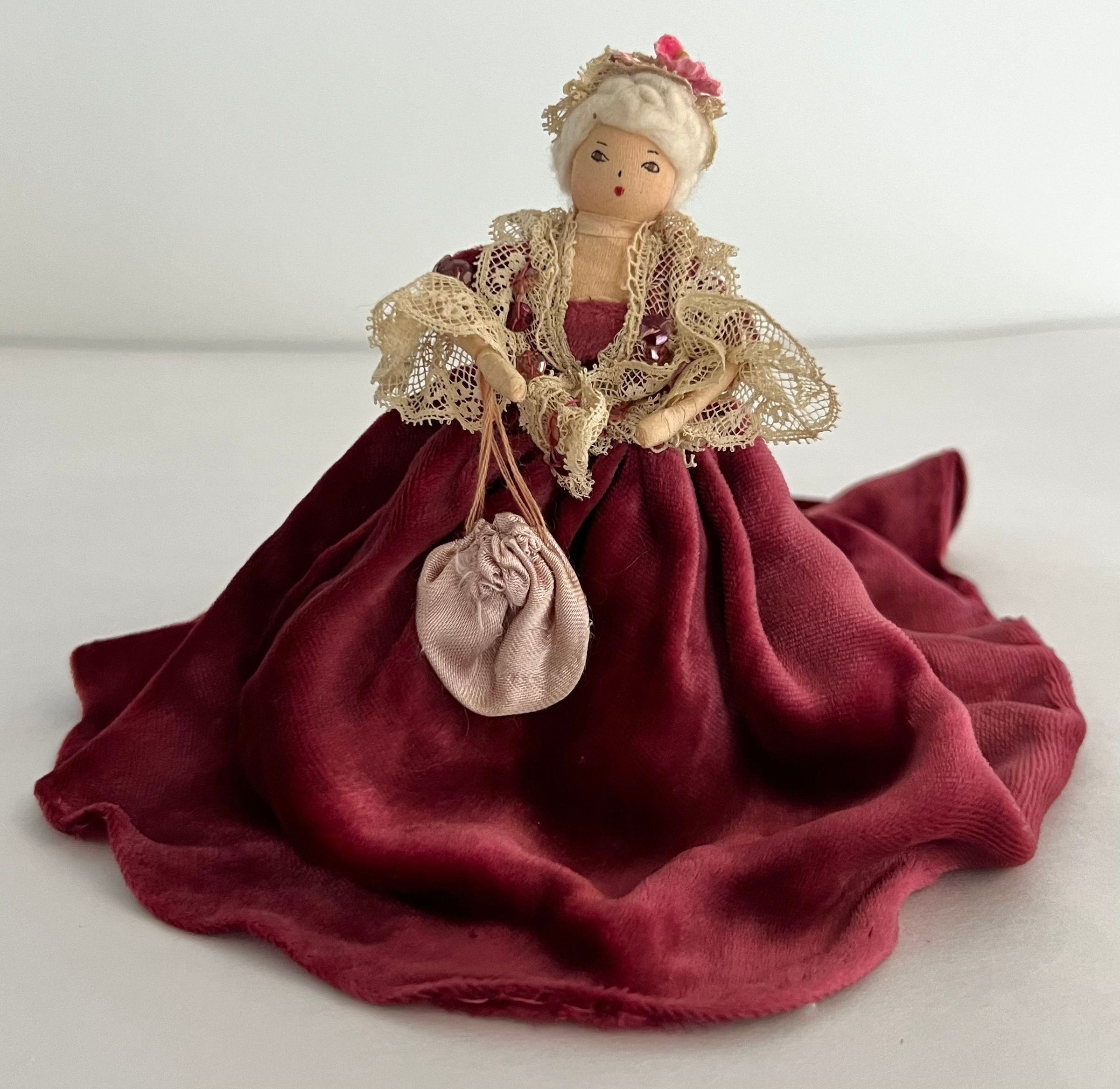 Doll is portrayed in a sitting position. Wears a rose velvet long dress with an extensive train behind. Lace around bodice and sleeves, rose sequin, carries pink drawstring handbag with sequins. White hair, creme lace cap with print ribbon and flower.Collection
