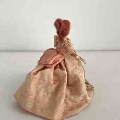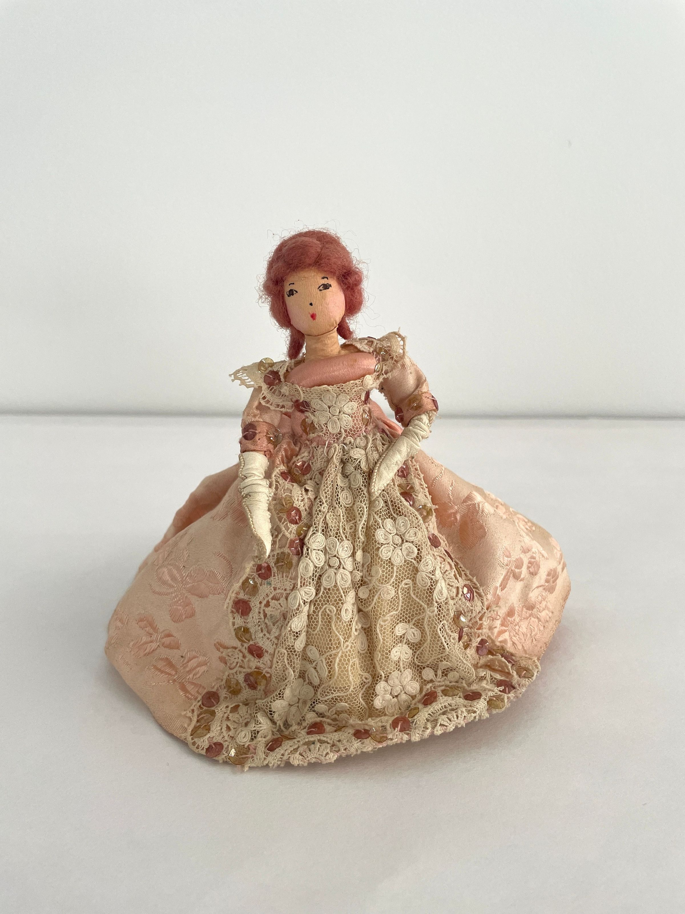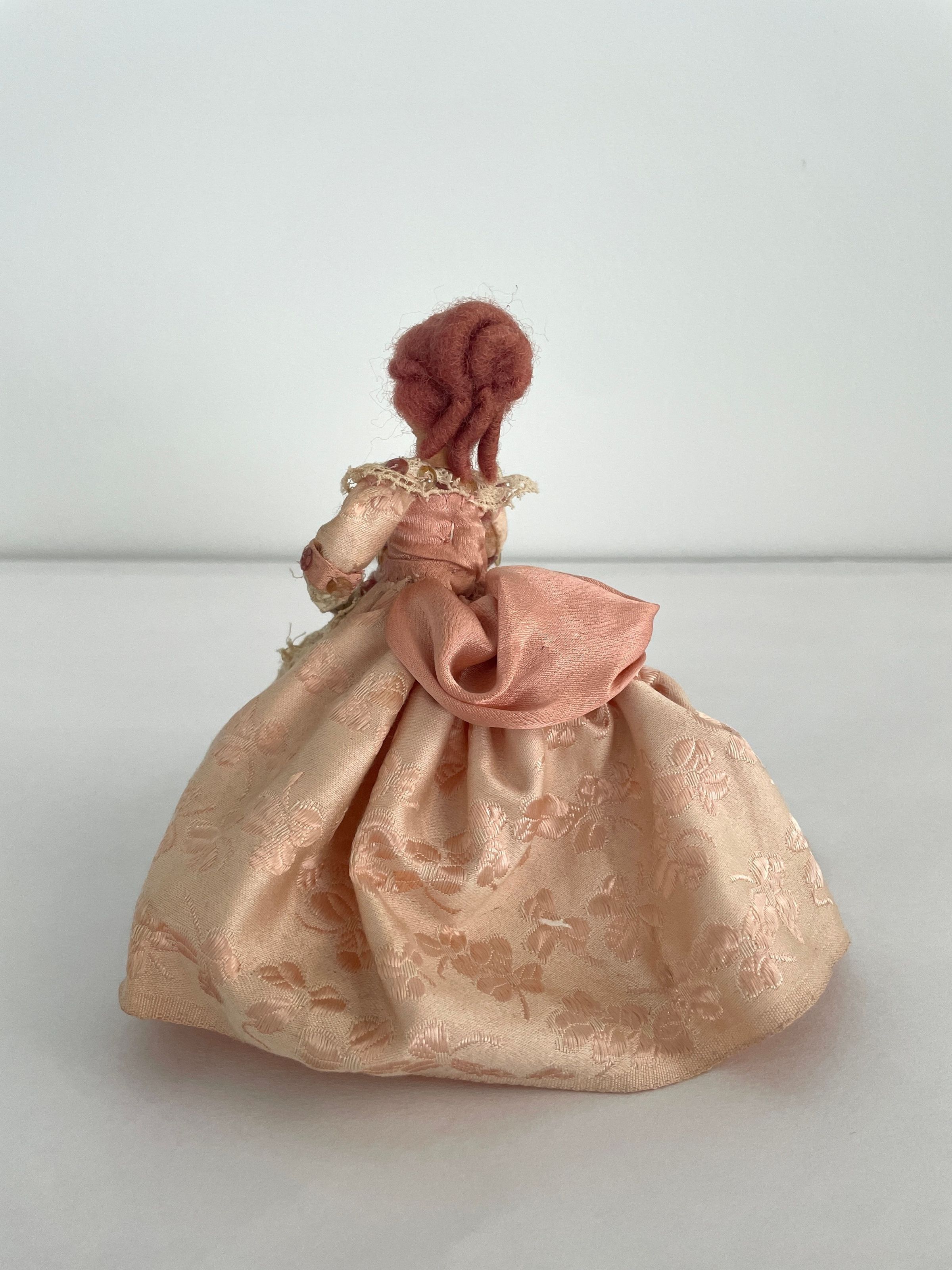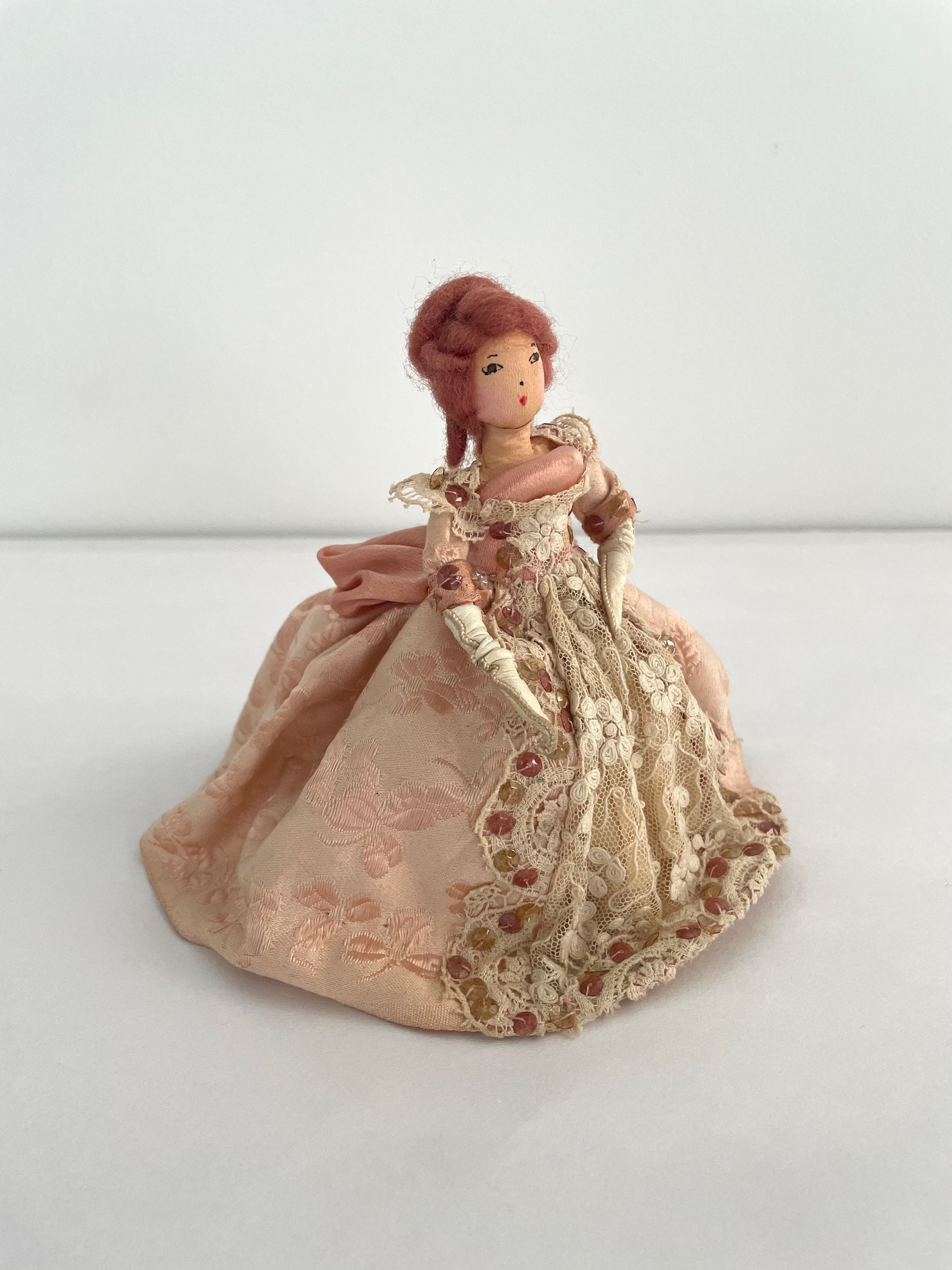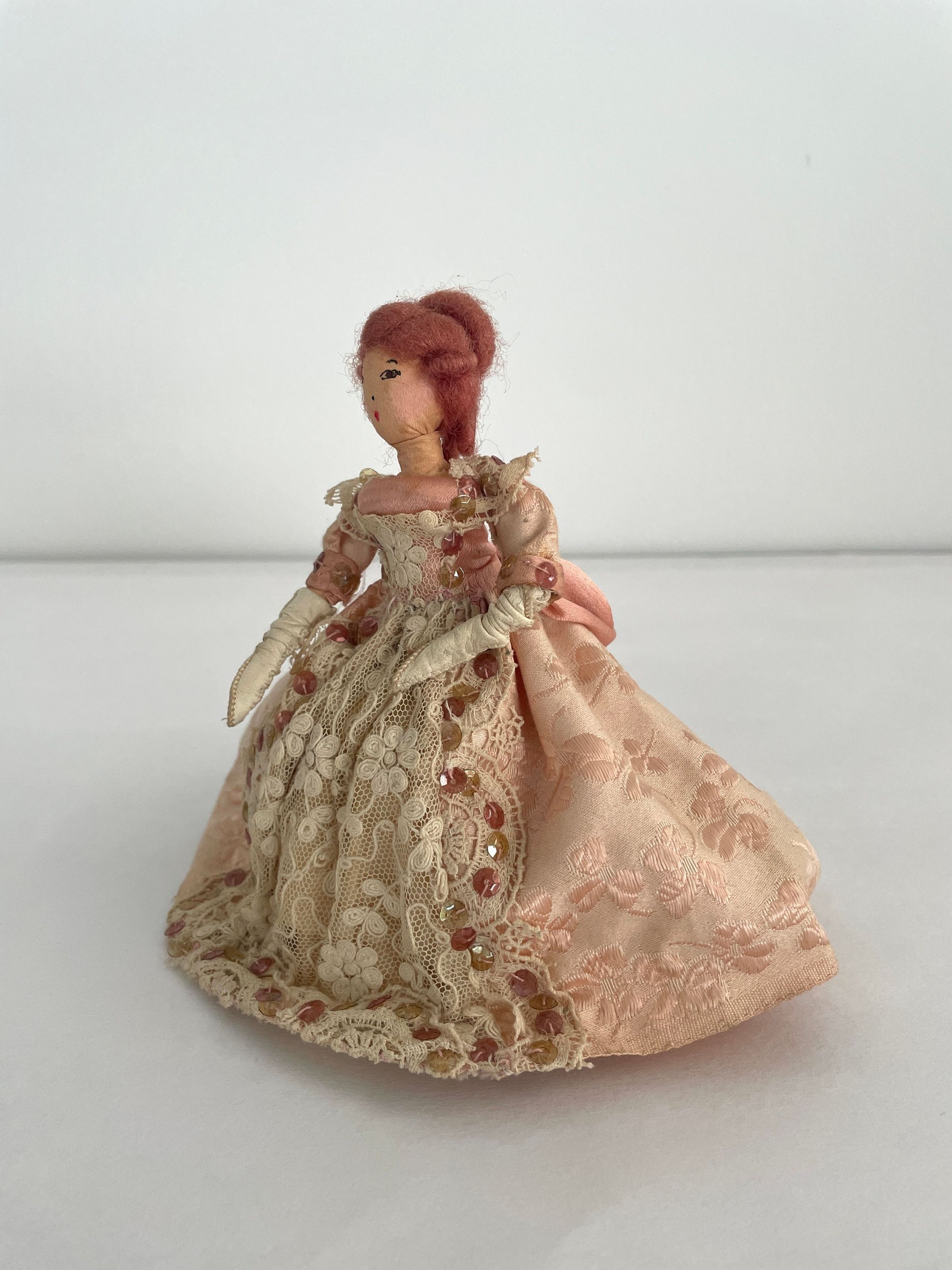 Standing position. Wears pink brocade gown with short train darker pink bodice and peplum. Lace on sleeves and lace panel descends down front. Accented with pink sequins, short sleeves. White elbow length gloves. Brown worn in a bun with ringlets.Collection