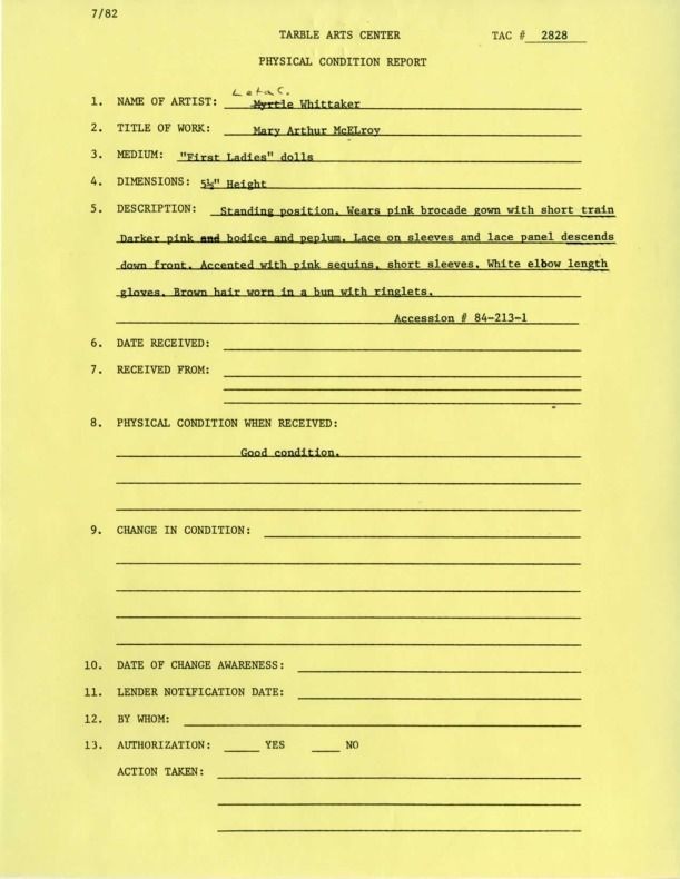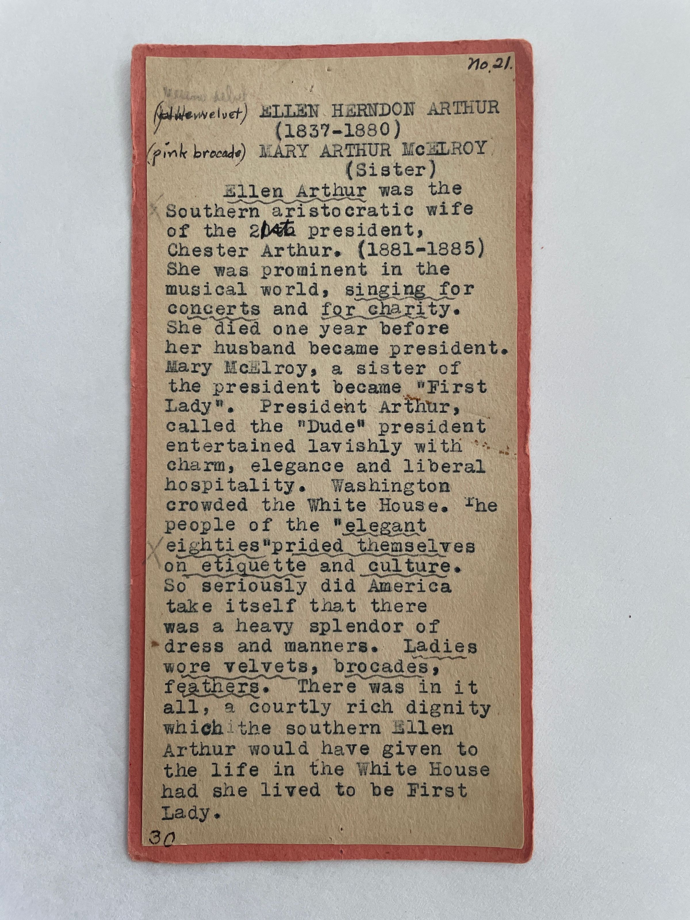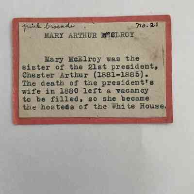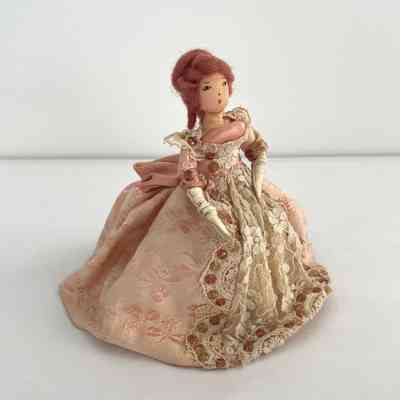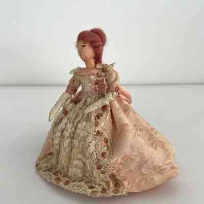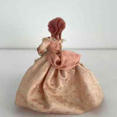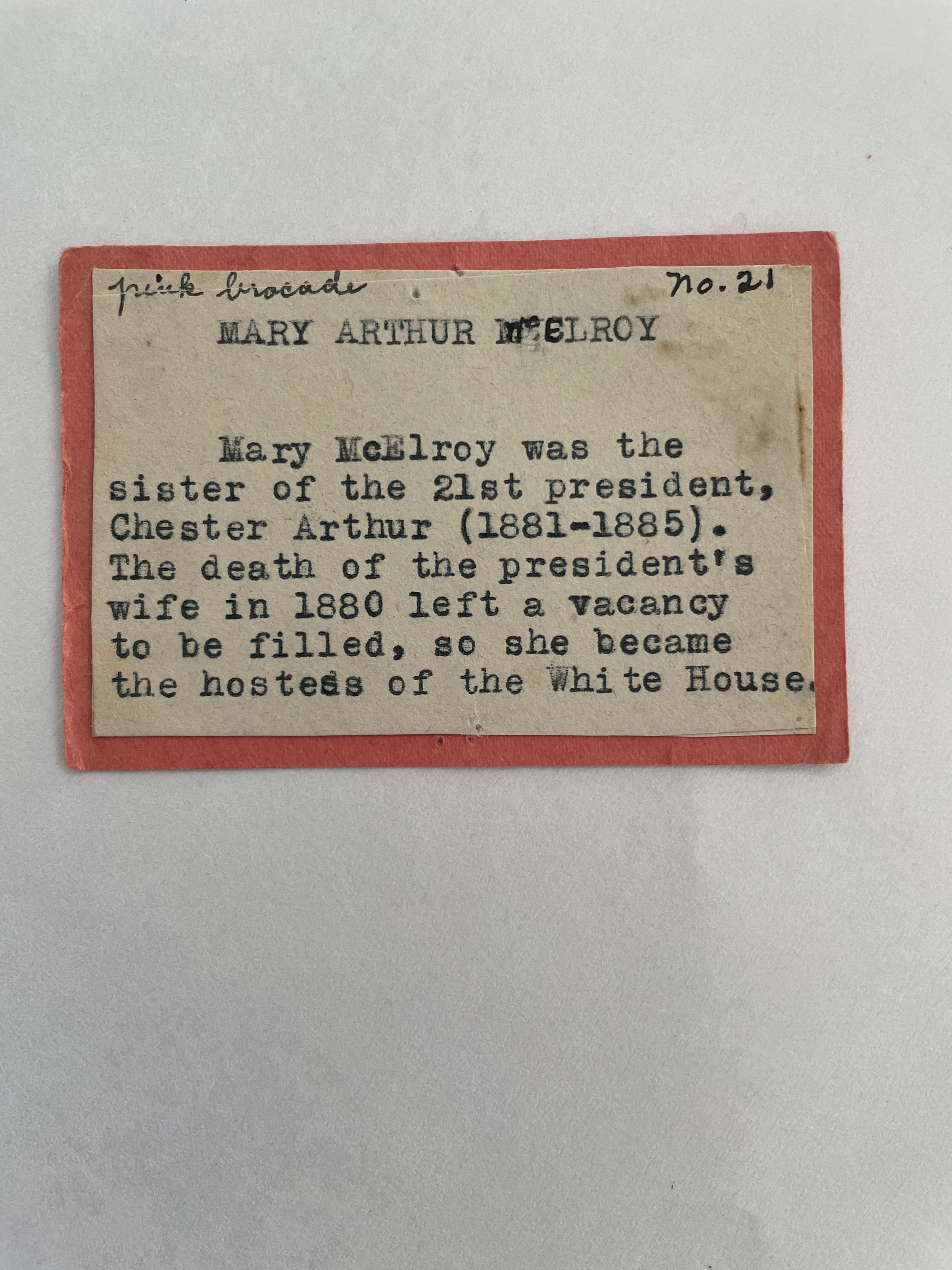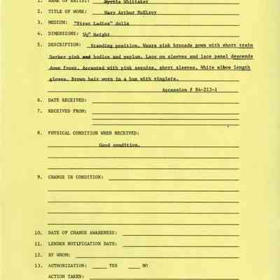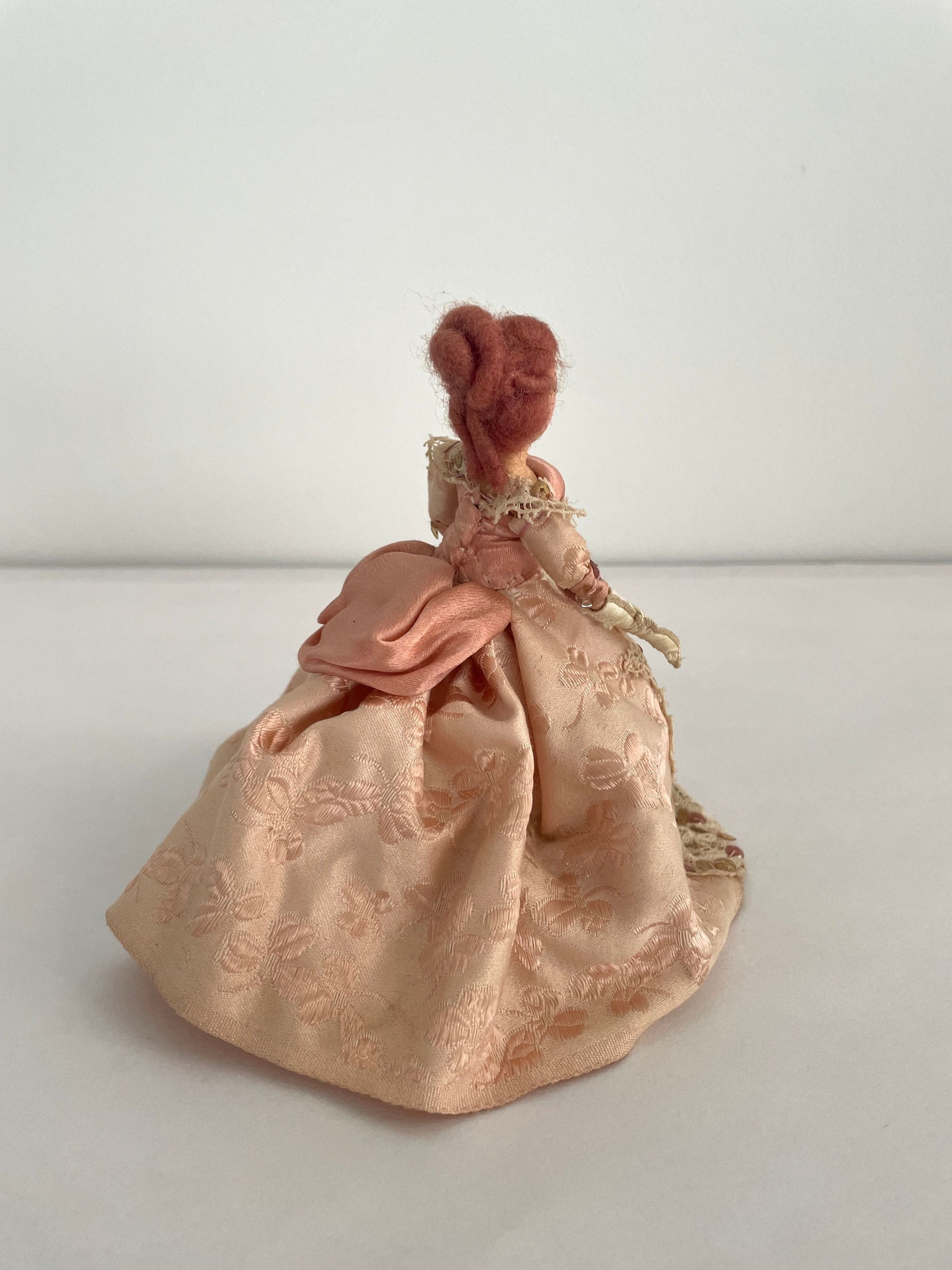 Standing position. Wears pink brocade gown with short train darker pink bodice and peplum. Lace on sleeves and lace panel descends down front. Accented with pink sequins, short sleeves. White elbow length gloves. Brown worn in a bun with ringlets.Collection