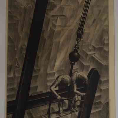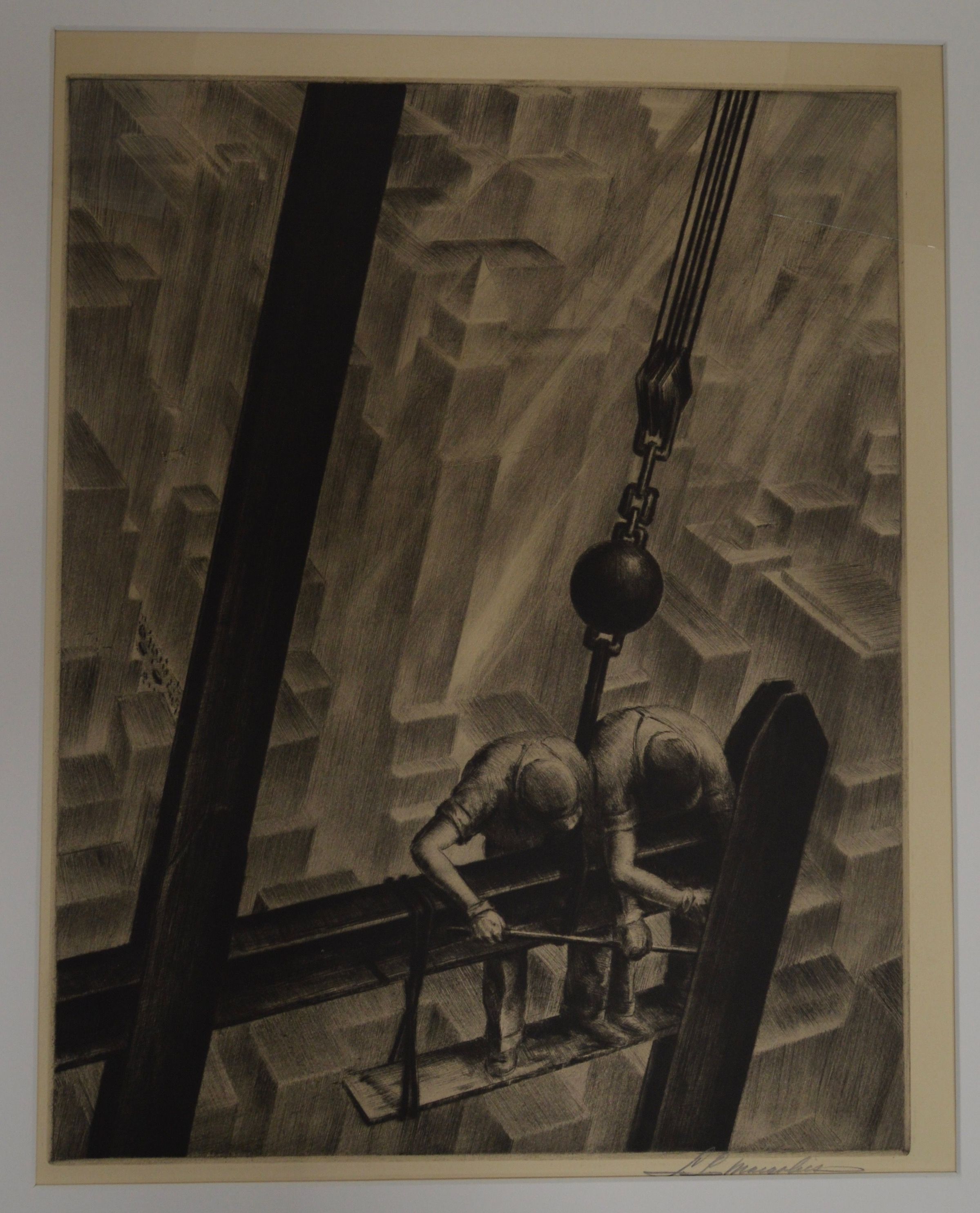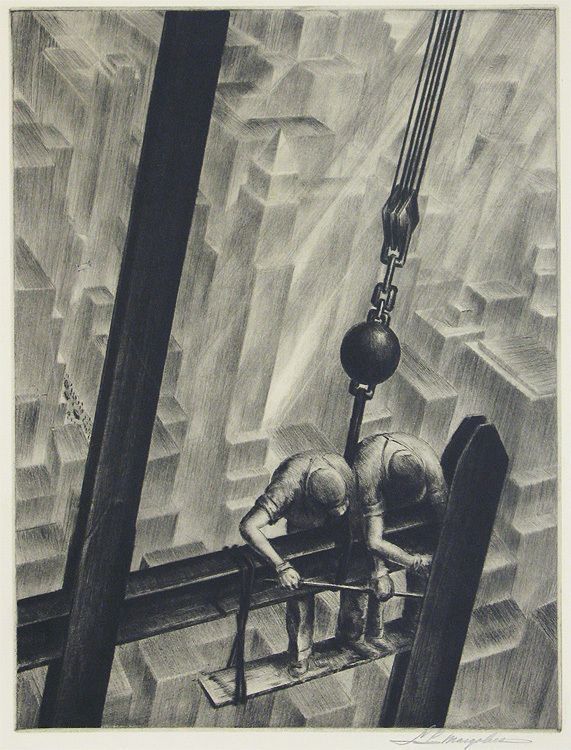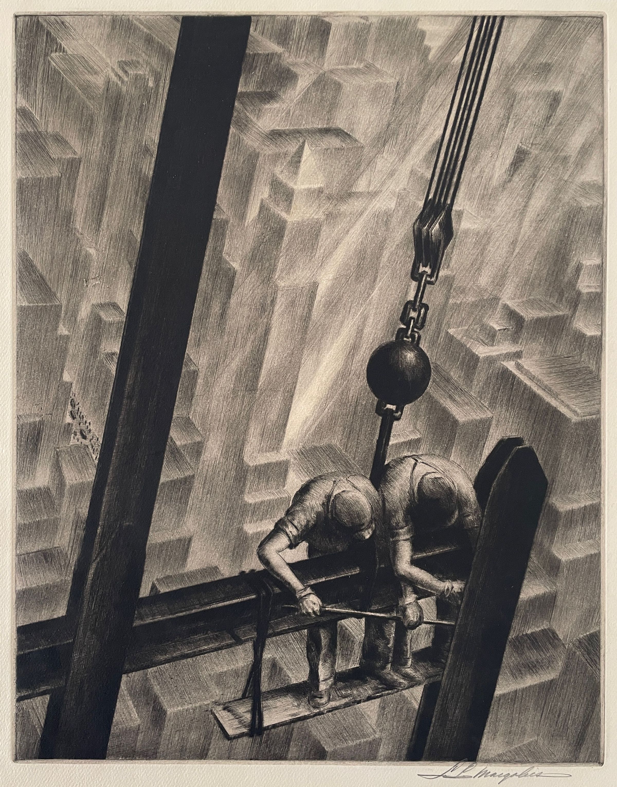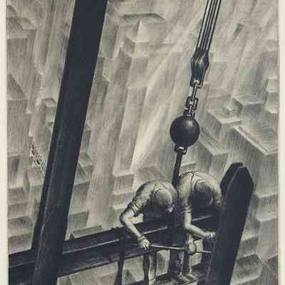 Two steel workers perched above city constructing frameworkCity below made up of geometric shapesCollection