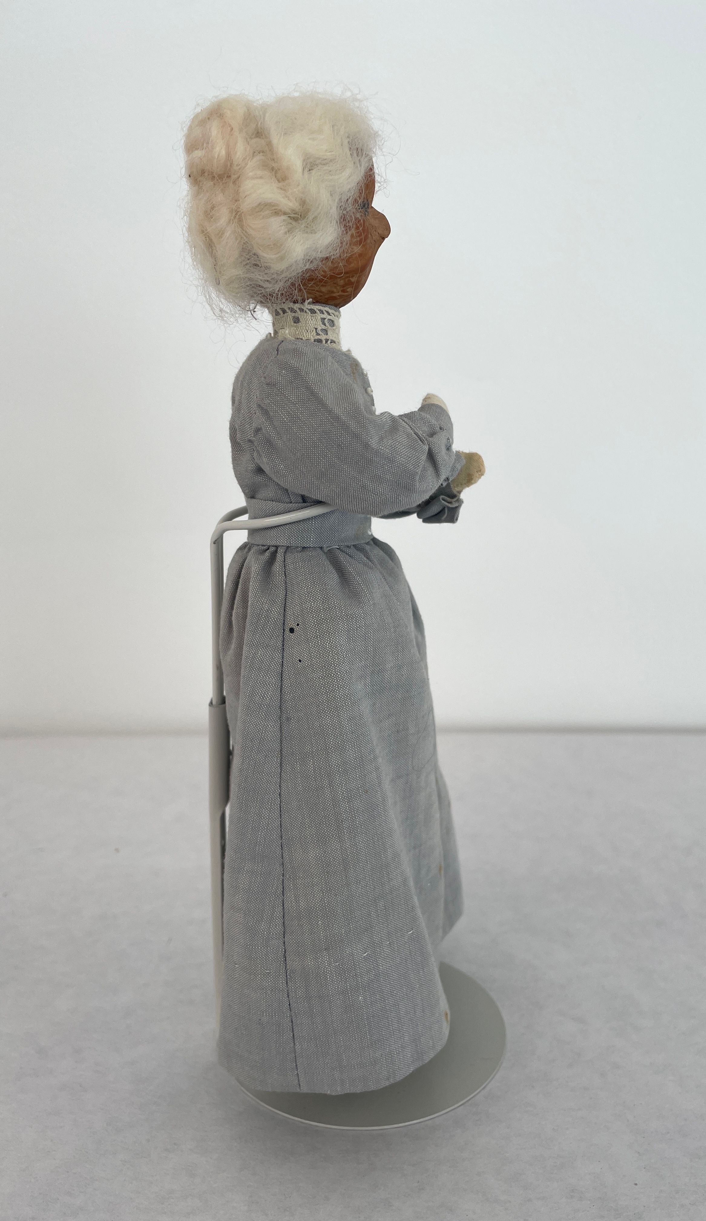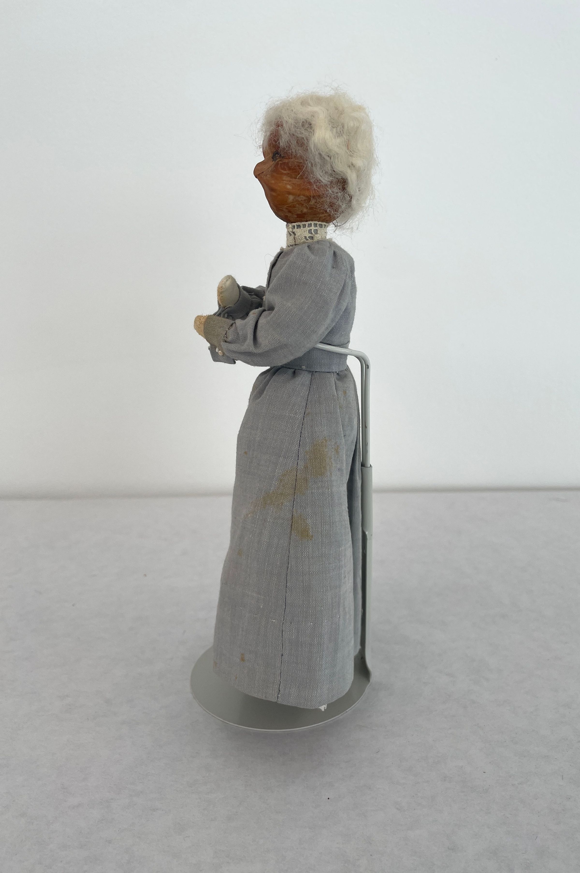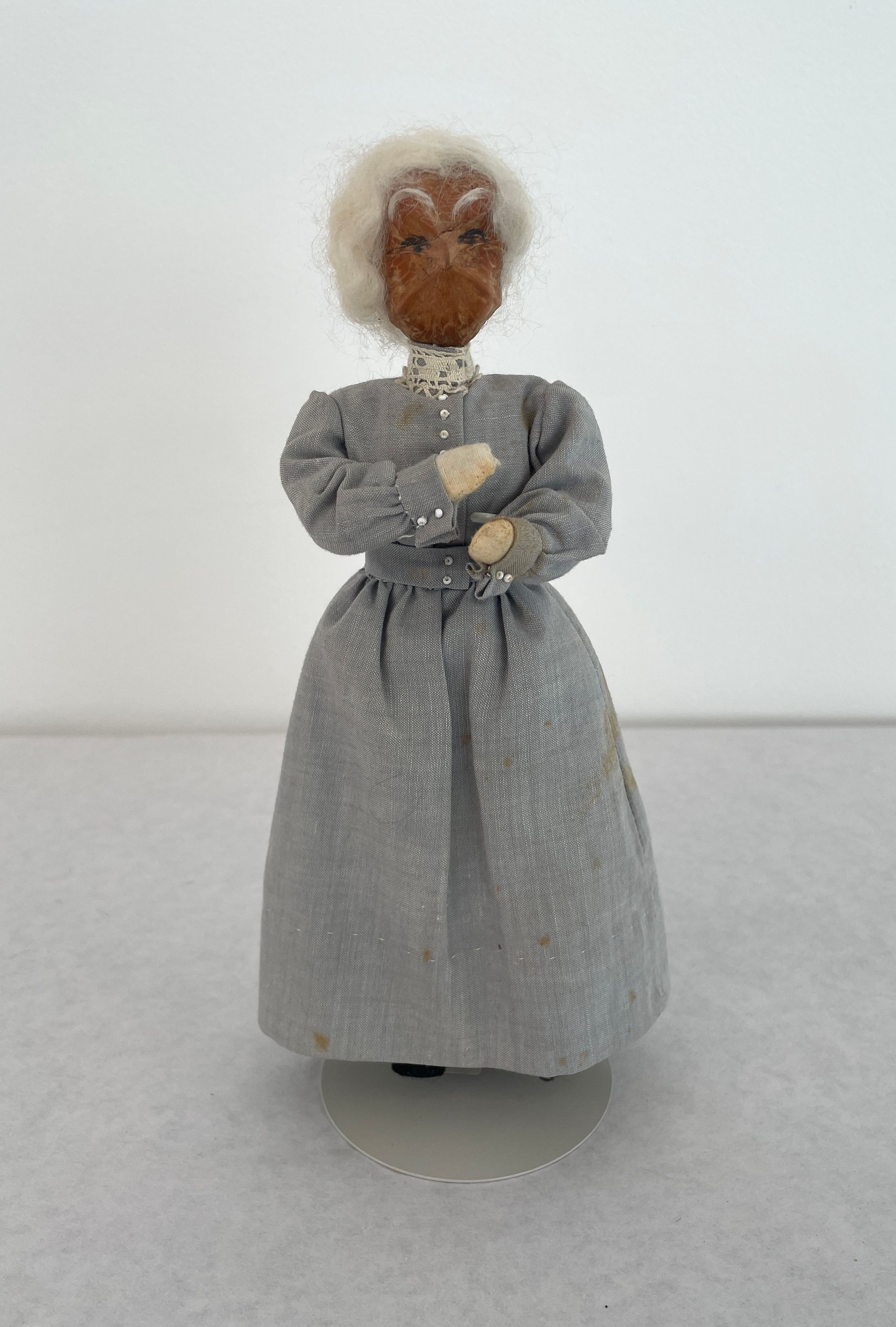 Small female doll. Head is made from a hickory nut and covered with white wooly yarn hair. Eyebrows same material as hair. Eyes drawn on-no mouth. Dressed in long light grey dress with with high white lace collar, black shoes. Displayed on wooden stand.Collection