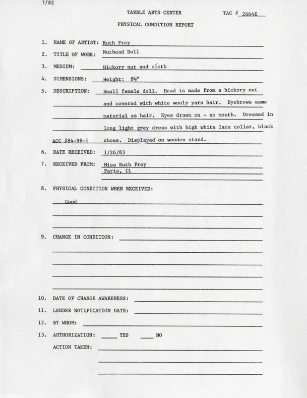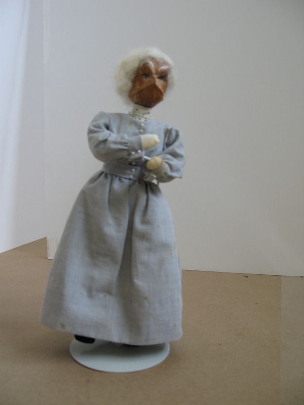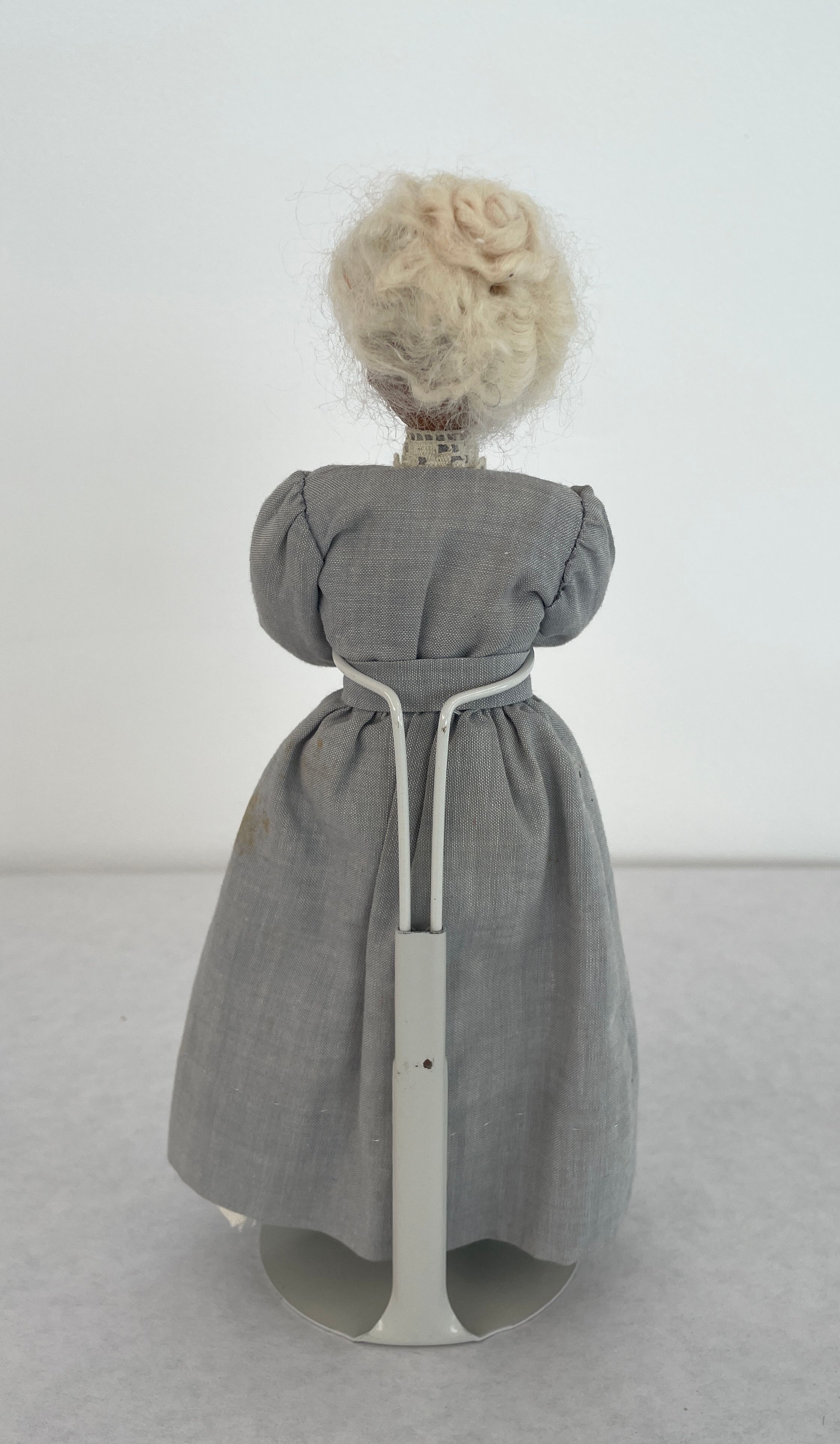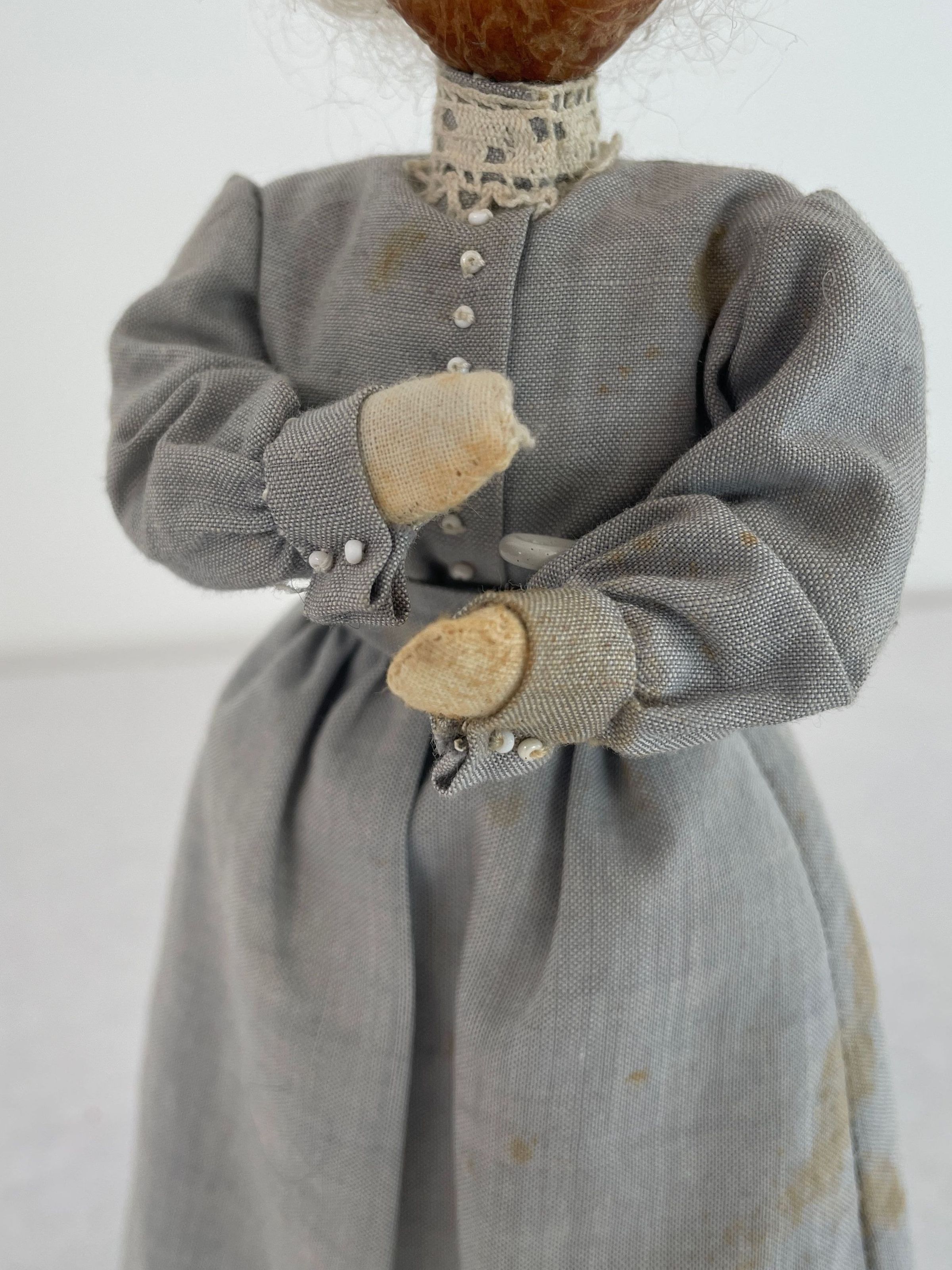 Small female doll. Head is made from a hickory nut and covered with white wooly yarn hair. Eyebrows same material as hair. Eyes drawn on-no mouth. Dressed in long light grey dress with with high white lace collar, black shoes. Displayed on wooden stand.Collection