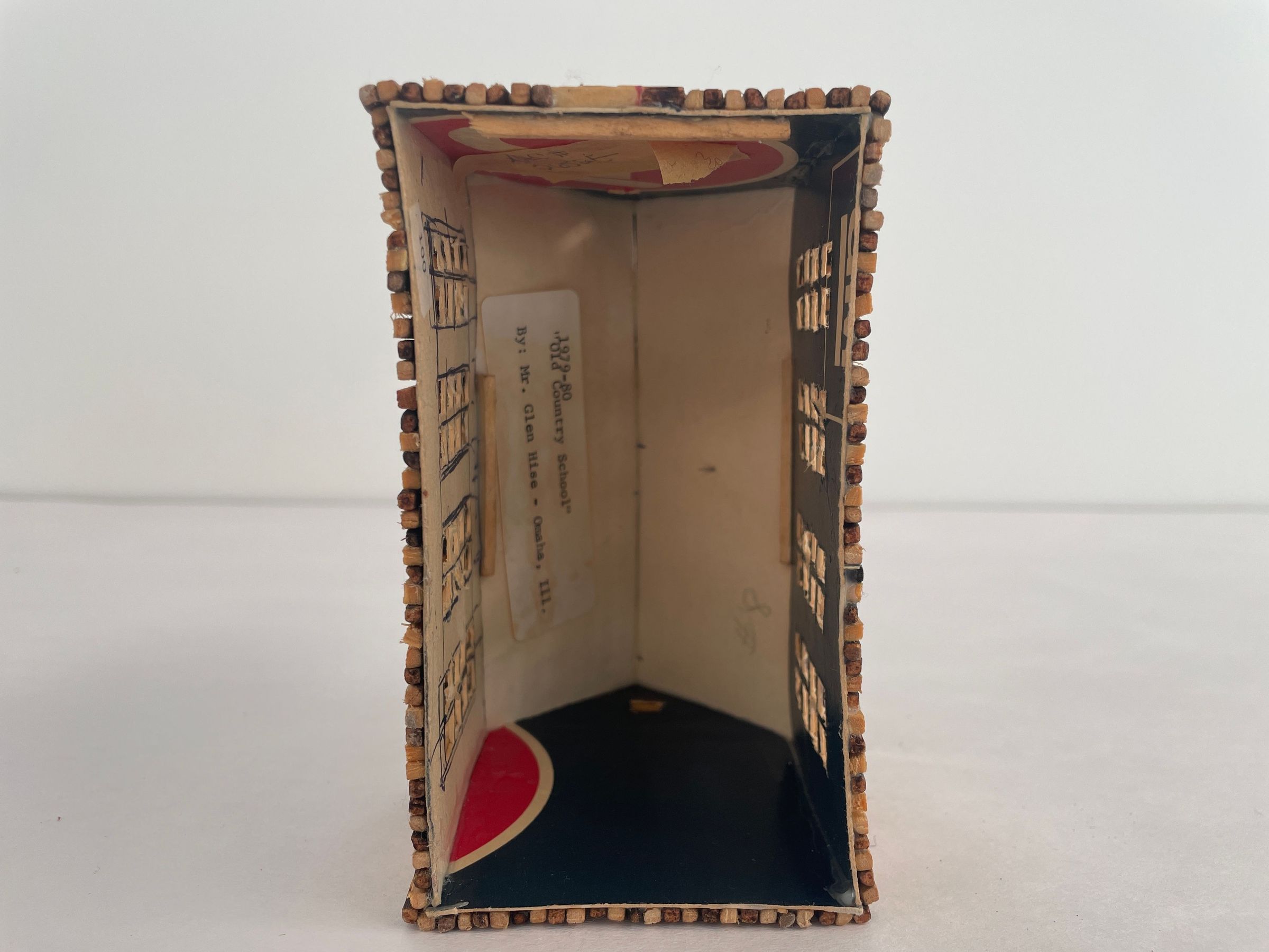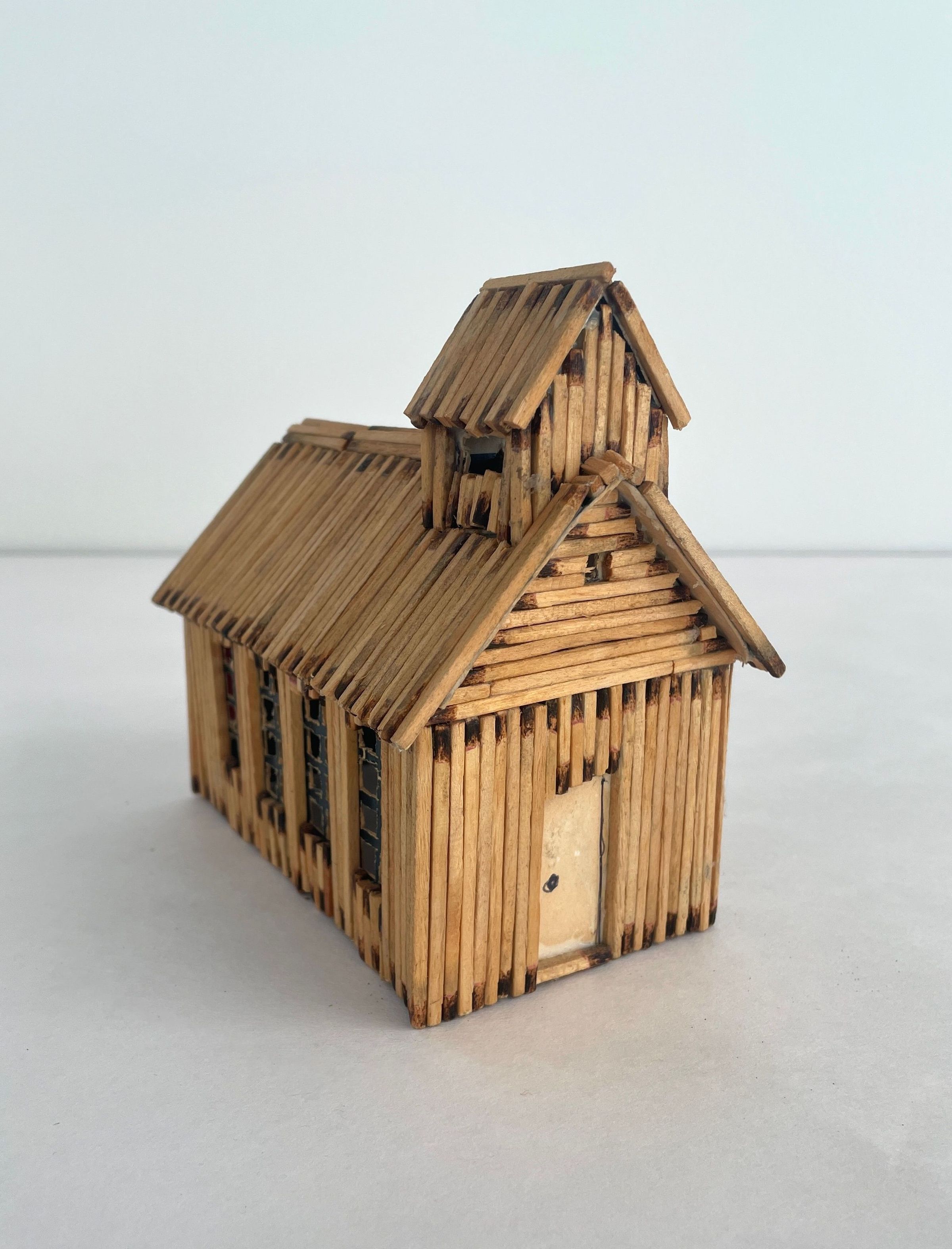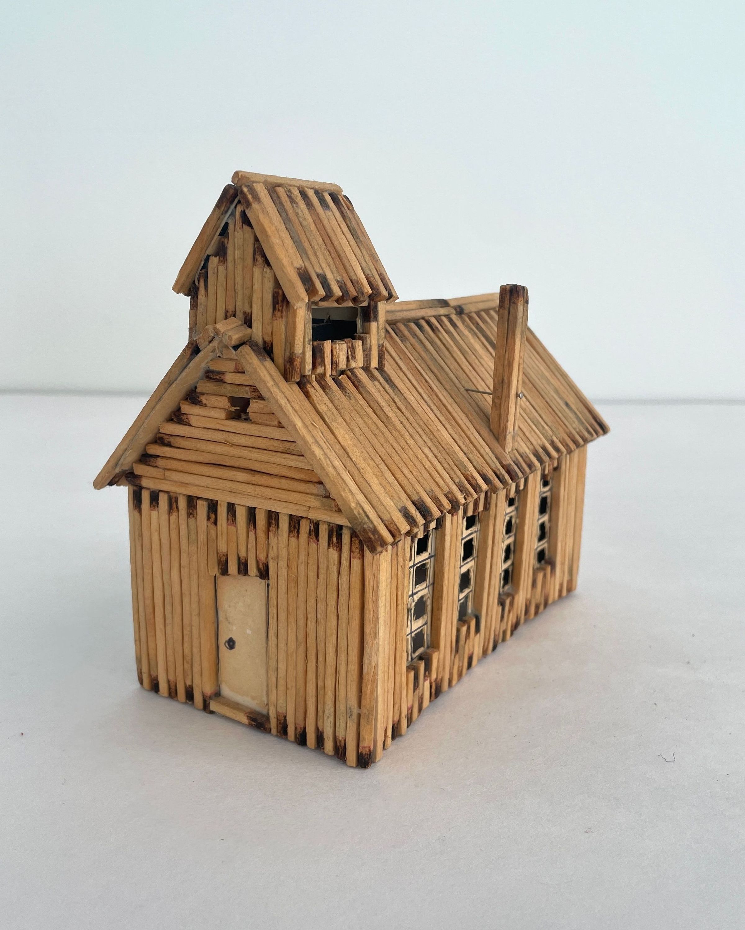 Matchstick construction. All are tan in color with white cardboard trim. School has chimney and school bell on roof.Artwork Details