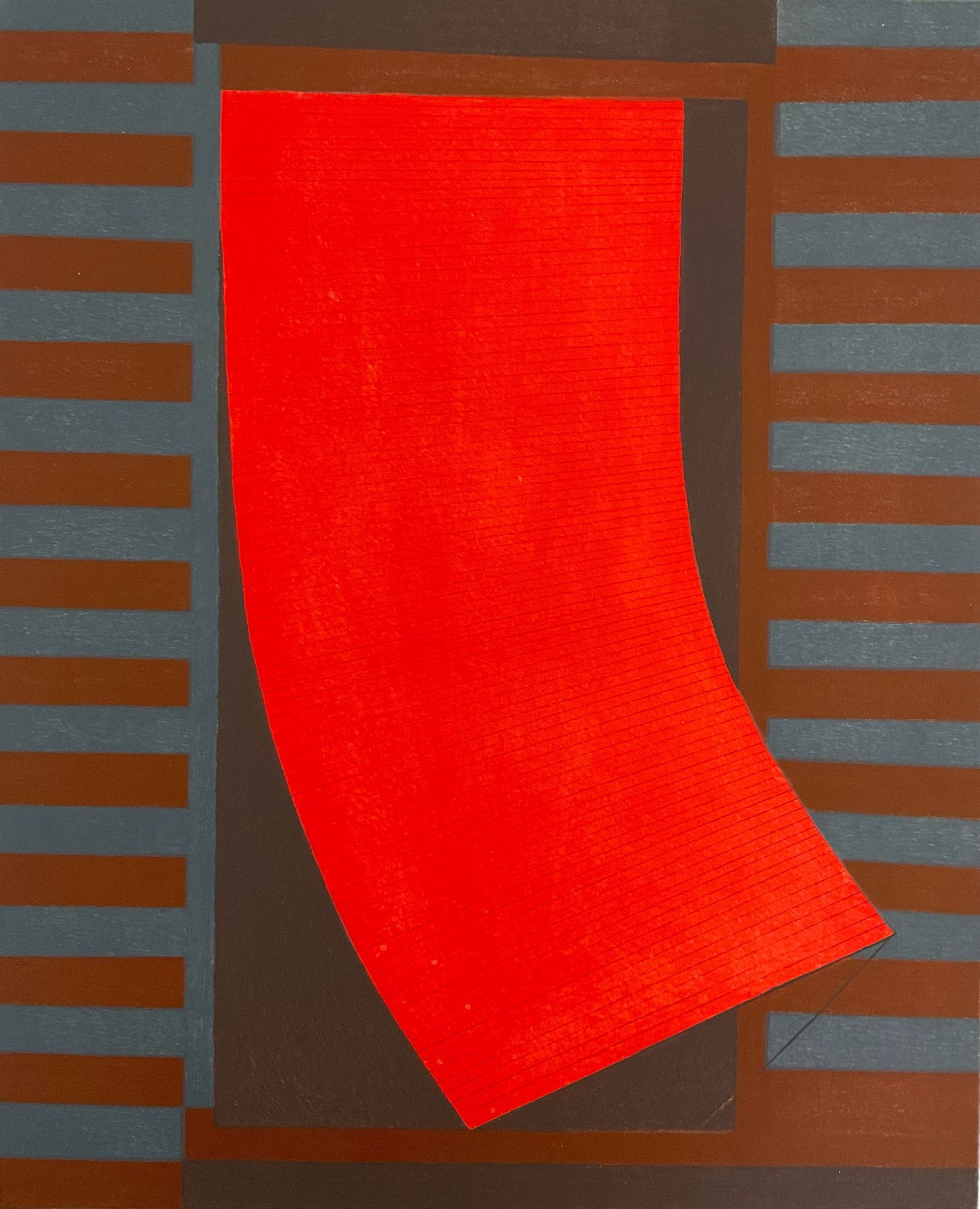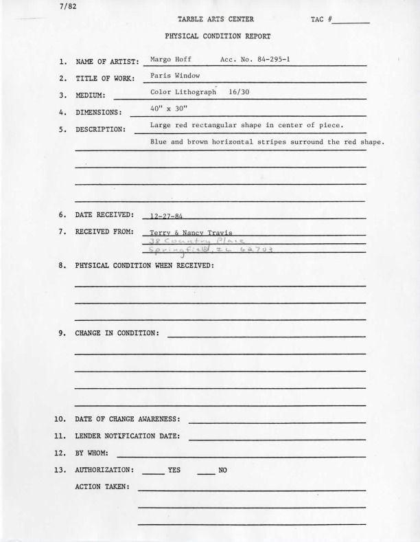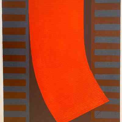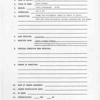 Vertical, window with a red blind. Top to bottom left and right, blue and brown alternating stripes, surrounding the red shape. Center top to bottom, window covered by a red shade blowing in or out. Silver metal frame with a white liner; lower left "Paris Window" middle "16/30" edition number right "M. Hoff."Artwork Details