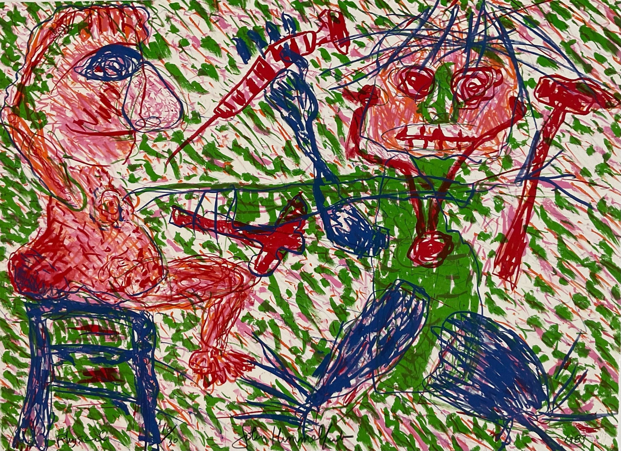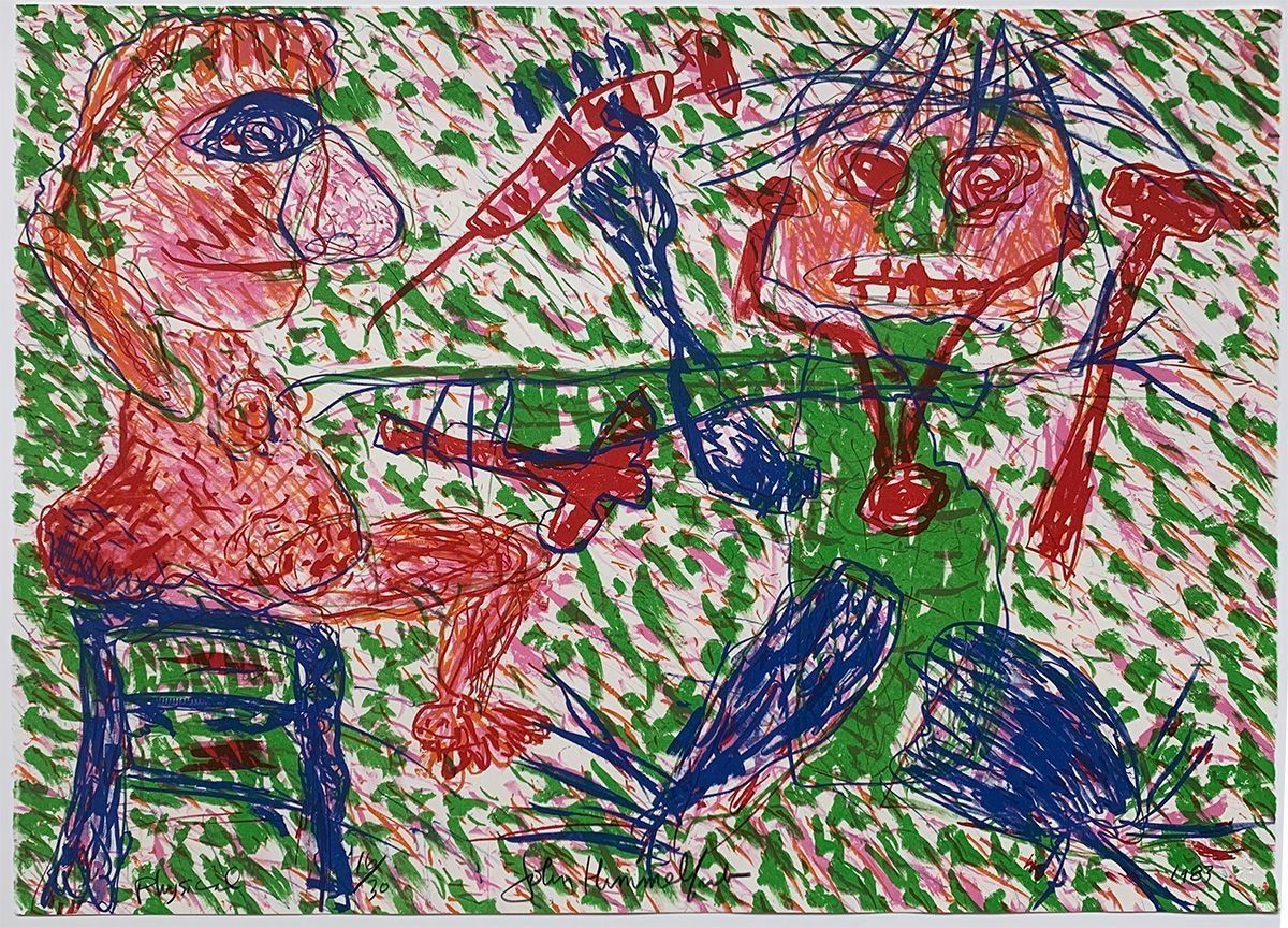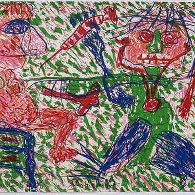 Horizontal, patient and doctor painted in a child-like scribble manner. Left, patient, facing right, sitting on a blue stool. At right, doctor, facing front. The picture is covered with green and pink strokes. Silver metal frame with white liner.Collection