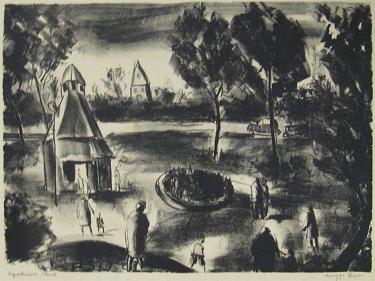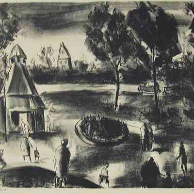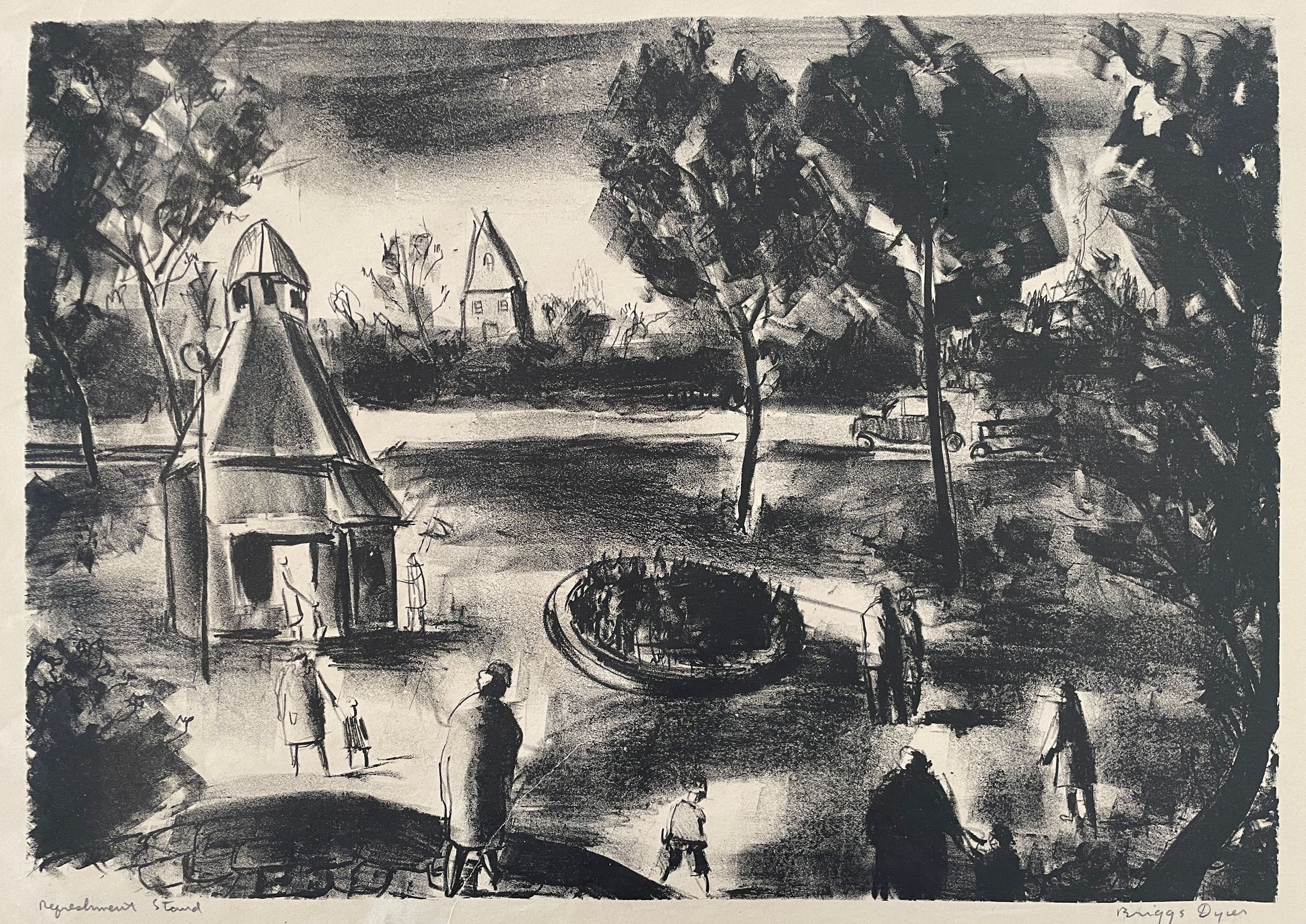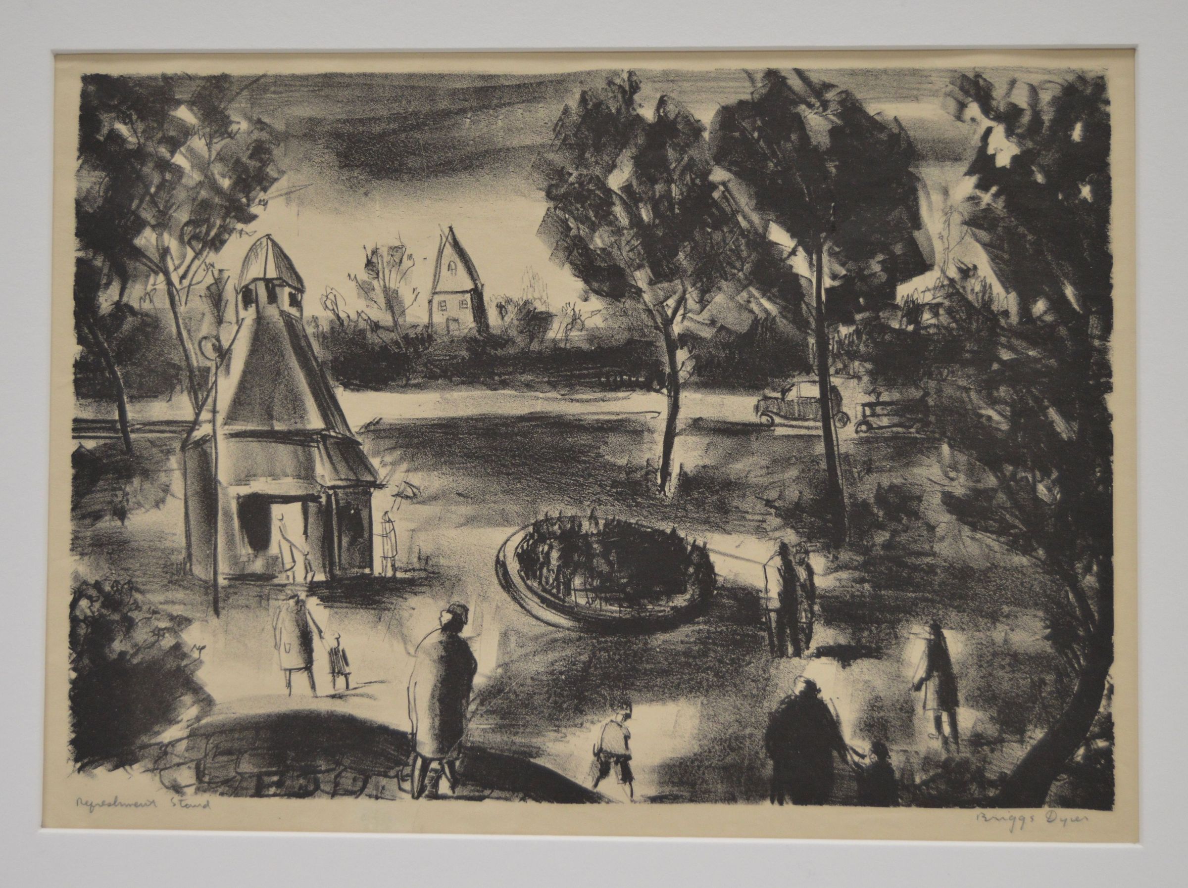 Part area, gazebo type refreshment stand to left of print. People standing about. The print is loosely done. Black ink, natural paper. Bronze toned metal frame, natural mat, glass covering. Stamped: Done Under Public Works of Art Project.Collection