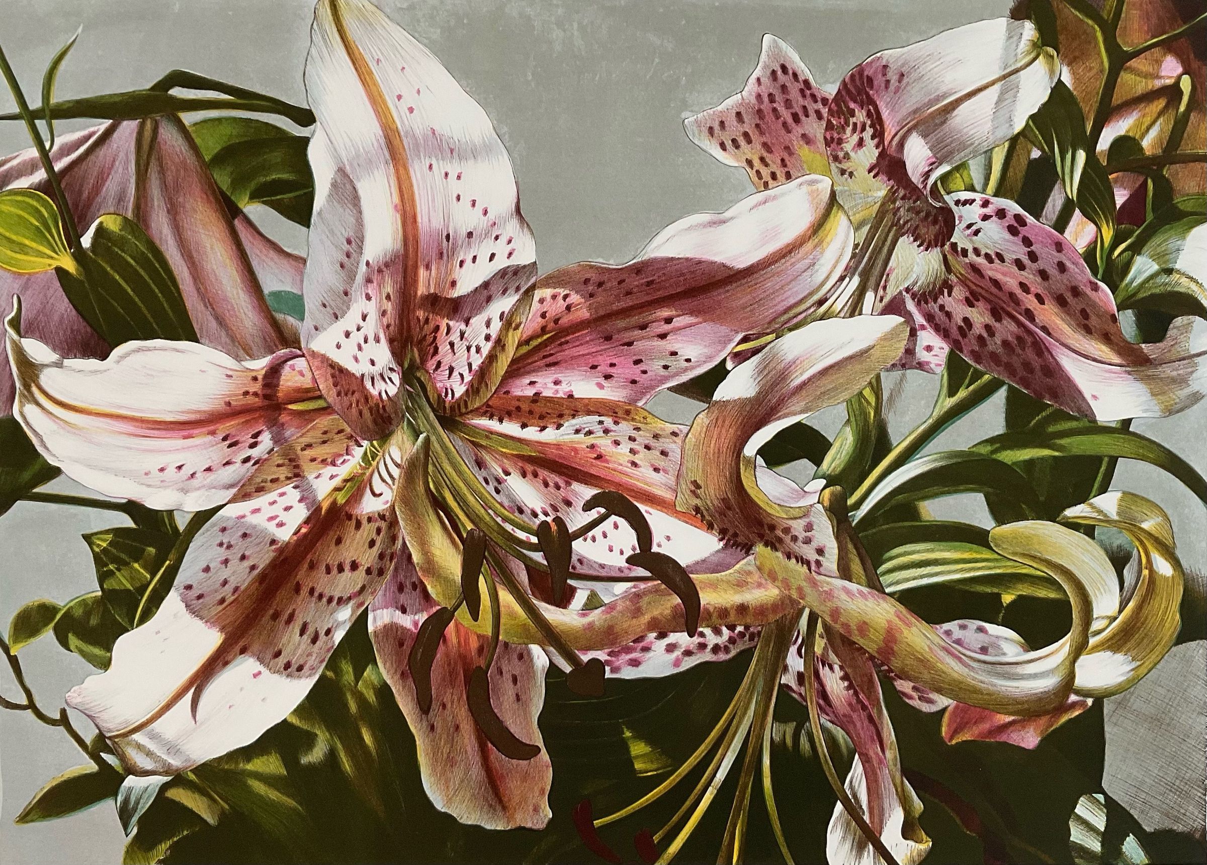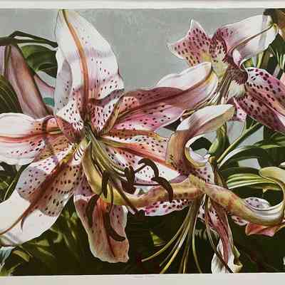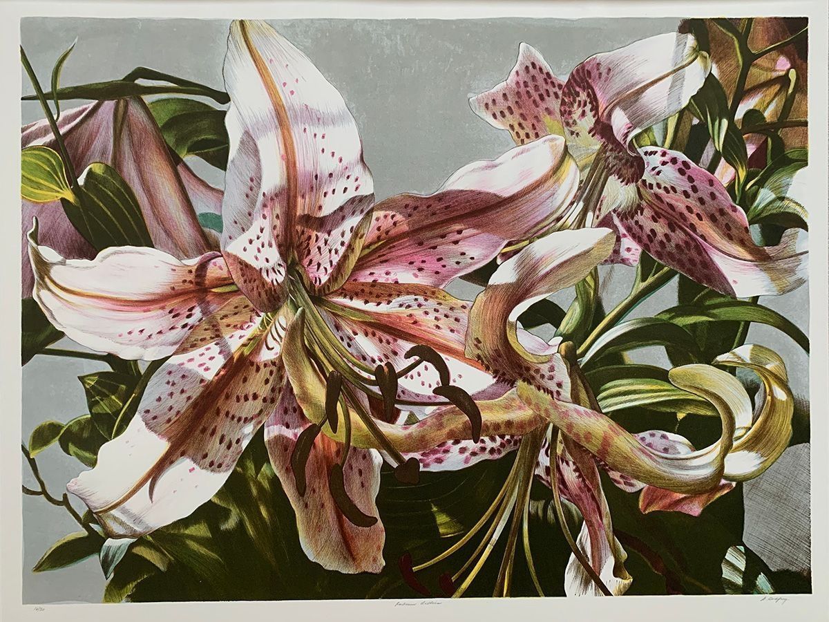 Horizontal, pink/white lilies. White petals flecked with brown spots become pink toward center of flower. The green stamen is tipped with brown pods. Another Lilly side view to right. Silver metal frame with white liner; lower left edition number "16/30" lower middle "Rubrum Lilies" lower right signed "W. Godfrey."Artwork Details