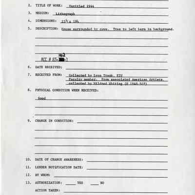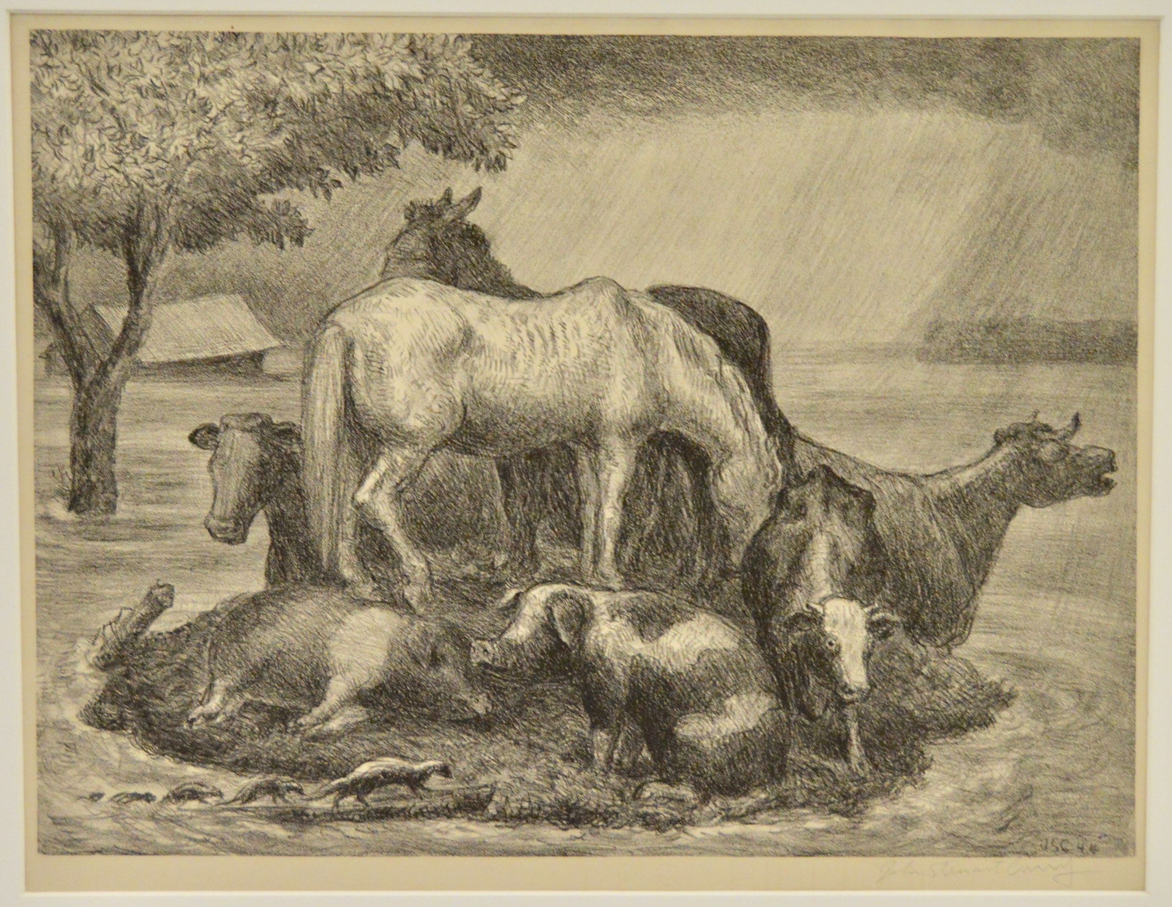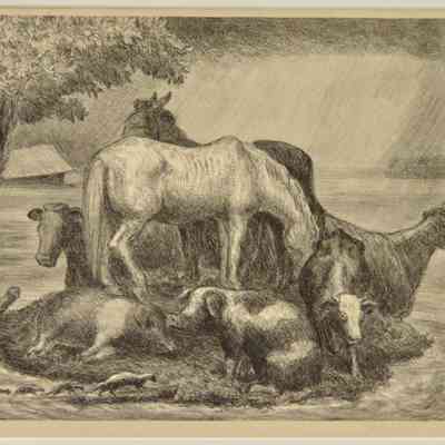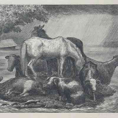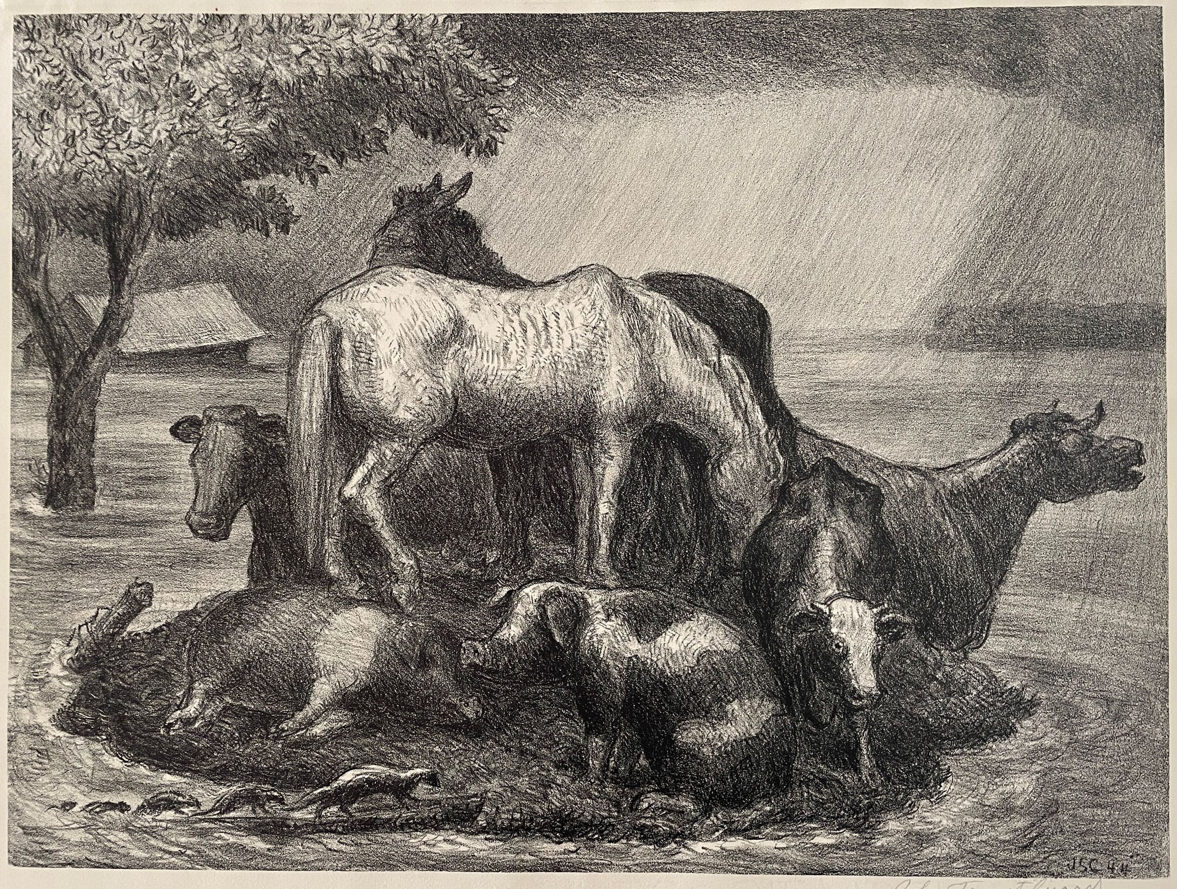 Animals on high land during flood (horses, cows, pigs, skunks). Tree and submerged barn in the background to the left. Natural paper, white mat, bronze tone metal frame, glass covering. Circulated by Associated American Artists.Collection