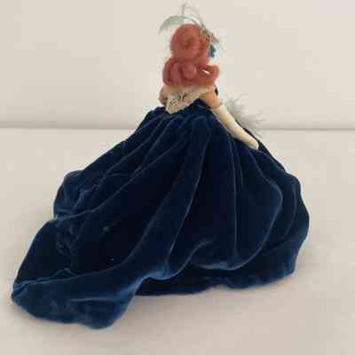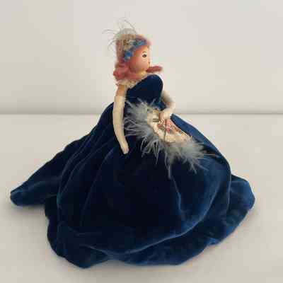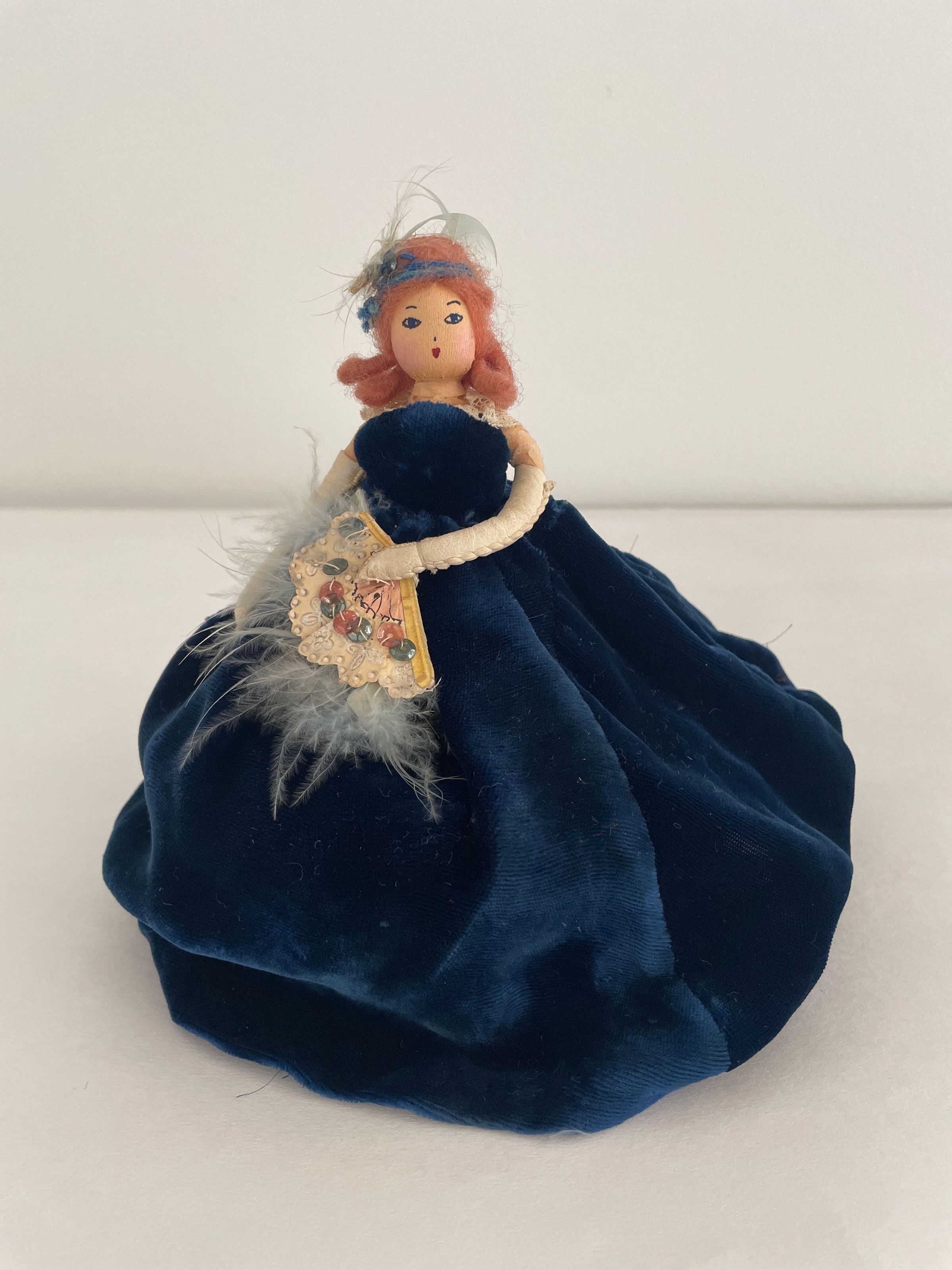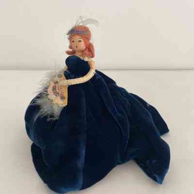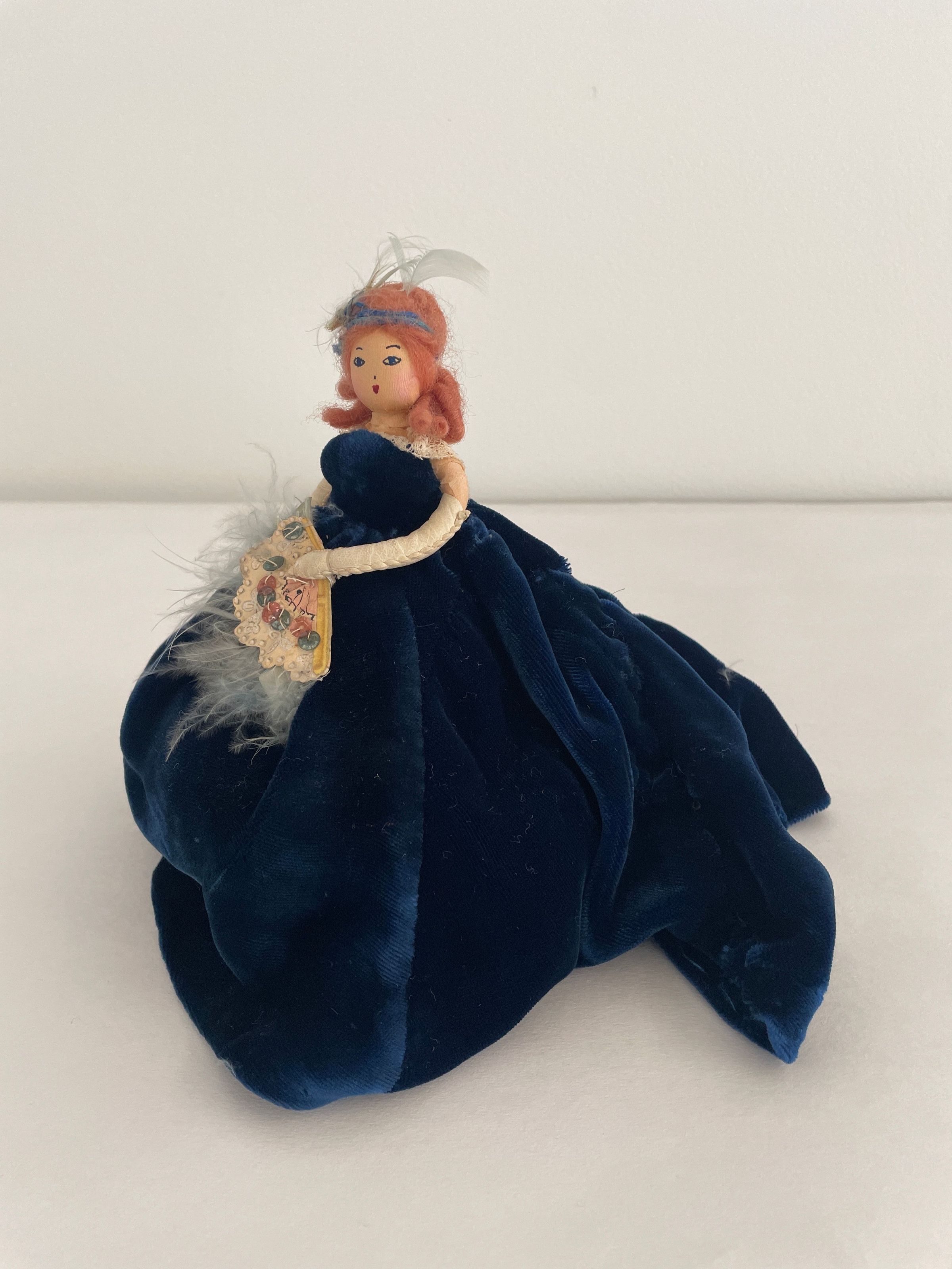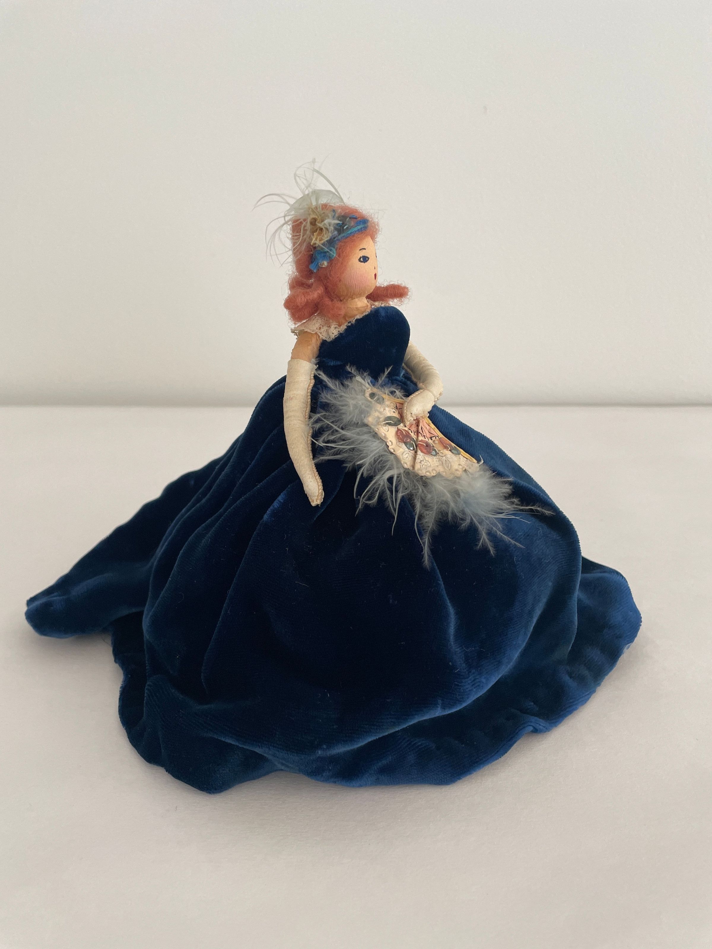 Standing position, royal blue velvet hooped dress, creme lace top, white elbow-length gloves, carries feathery, sequined fan in left hand, brown long hair, royal blue band with light blue feather worn in hair.Collection