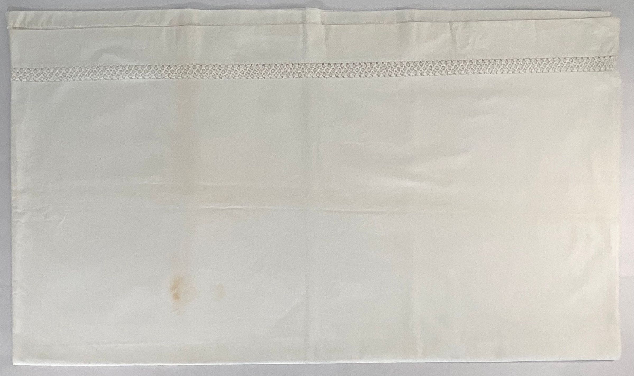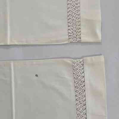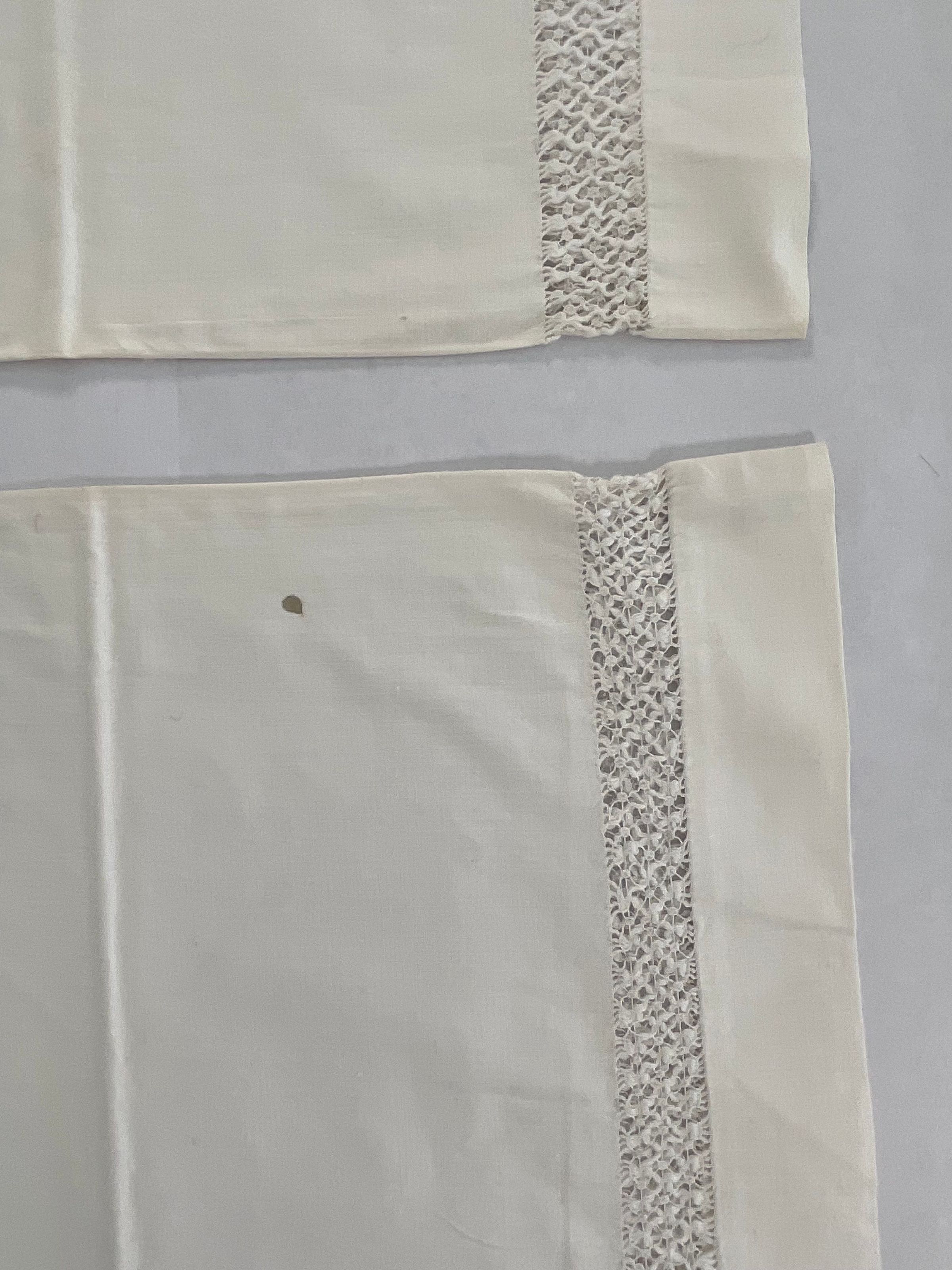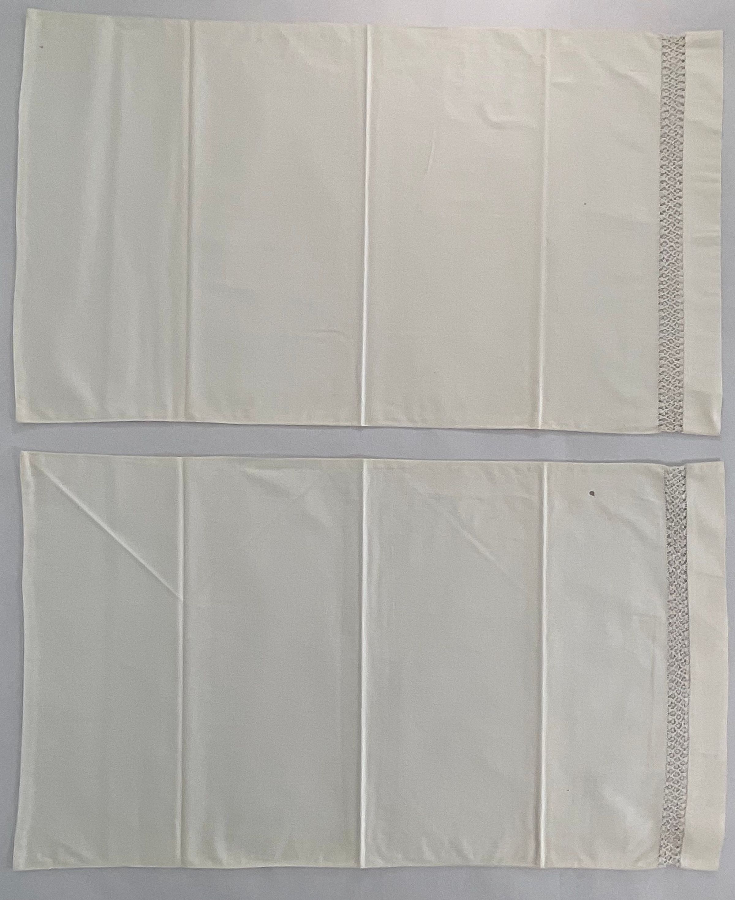 White Cotton pillowcases. Drawn work design is crossed bars & dots. Sheet has horizontal strip of drawn work at one end only as does pillow cases.Collection