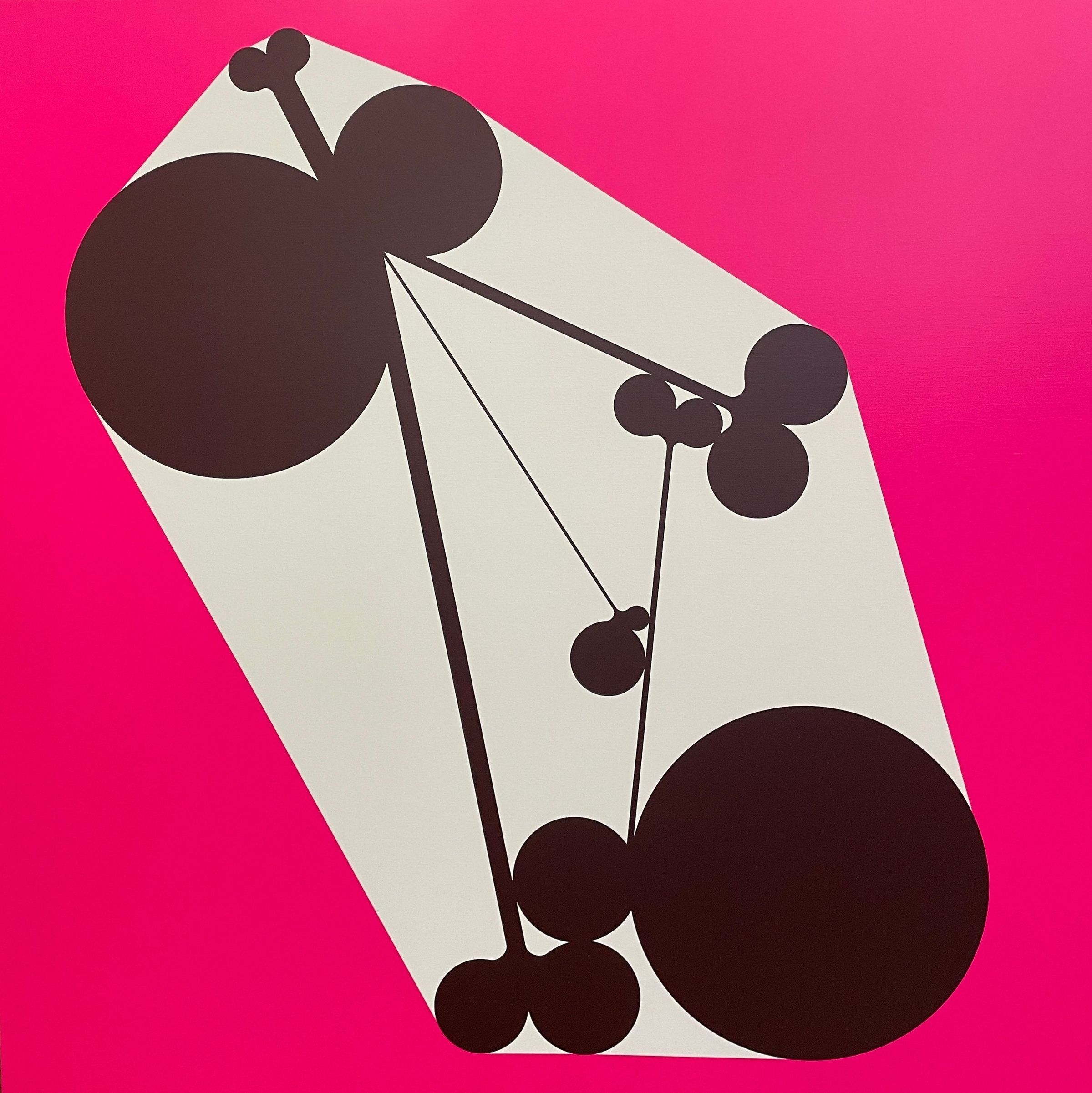 Square pink canvas with white blob form shaped with black ball and stick shapes defining irregular form. Object mounted to wall with magnetic ball-bearing bracket. Artwork literally spins.Collection